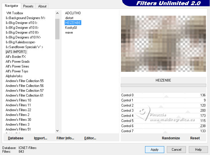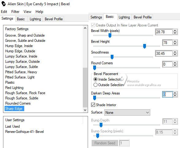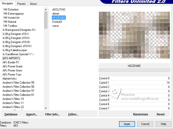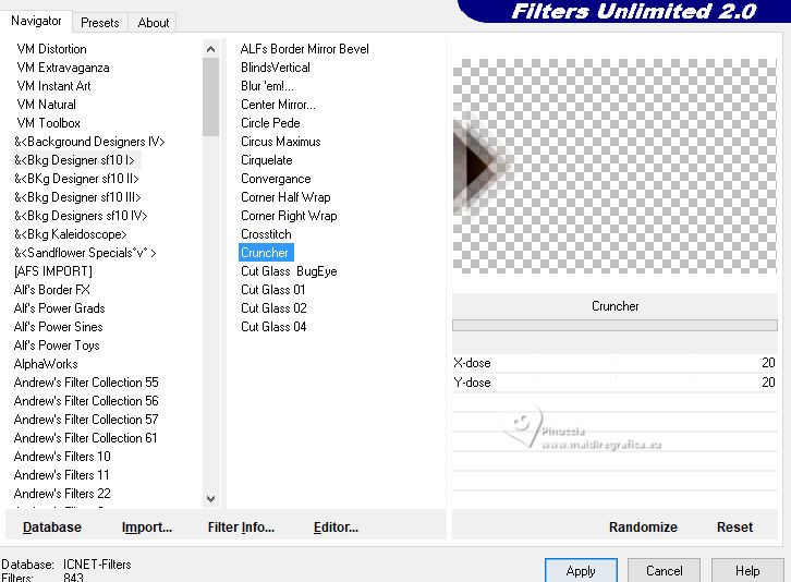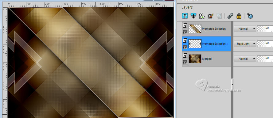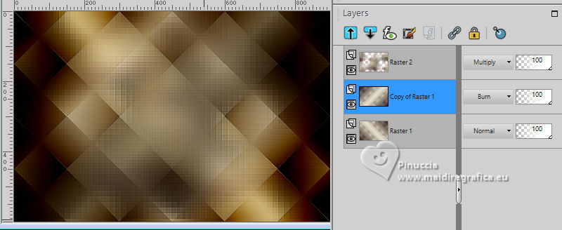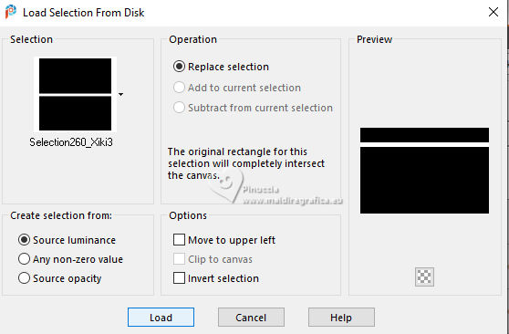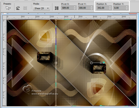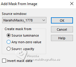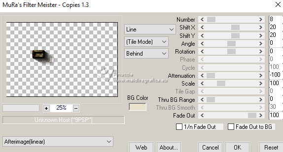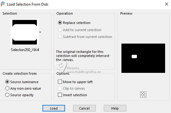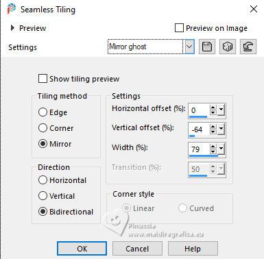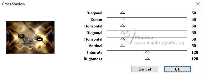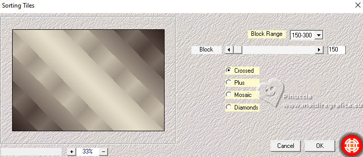 For this tutorial, you will need: ![]() Thank for the tubes PqnaAlice. The rest of the material is by Soxikibem. (The links of the tubemakers here). ![]() consult, if necessary, my filter section here Filters Unlimited 2.0 here &<Bkg Designer sf10I> - Cruncher (to import in Unlimited) here Alien Skin Eye Candy 5 Impact - Bevel here AFS IMPORT - Helzenbe here Mehdi - Sorting Tiles here Mura's Meister - Copies here Mura's Seamless - Emboss at Alpha here Filters AFS and Mura's Seamless can be used alone or imported into Filters Unlimited. (How do, you see here) If a plugin supplied appears with this icon ![]() You can change Blend Modes according to your colors. In the newest versions of PSP, you don't find the foreground/background gradient (Corel_06_029). You can use the gradients of the older versions. The Gradient of CorelX here ![]() Copy the Selections in the Selections Folder. Open the mask in PSP and minimize it with the rest of the material. 1. Choose 3 colors from your material. Foreground color #2f201d, background color #eae2cb ![]() color 3: #ffffff. Set your foreground color to a Foreground/Background Gradient, style Linear. ![]() 2. Open a new transparent image 900 x 600 pixels. Flood Fill the transparent image with your Gradient.3. Adjust>Blur>Gaussian Blur - radius 20. ![]() 3. Layers>New Raster Layer. Selections>Select All. Open the woman's tube 1038MulherByPqnaAlice ![]() Erase the watermark and go to Edit>Copy. Minimize the tube. Go back to your work and go to Edit>Paste Into Selection. Selections>Select None. 4. Effects>Image Effects>Seamless Tiling, default settings. ![]() Adjust>Blur>Gaussian Blur - radius 30. ![]() Effects>Plugins>Filters Unlimited 2.0 - AFS IMPORT - Helzenbe ![]() 5. Again Effects>Plugins>Filters Unlimited 2.0 - AFS IMPORT - Helzenbe, default settings ![]() Effects>Edge Effects>Enhance. Change the Blend Mode of this layer to Multiply ![]() 6. Activate the layer Raster 1. Effects>Plugins>Mehdi - Sorting Tiles. ![]() Effects>Edge Effects>Enhance. 7. Layers>Duplicate. Image>Mirror>Mirror Horizontal. Change the Blend Mode of this layer to Burn. ![]() Layers>Merge>Merge visible. 8. Selections>Load/Save Selection>Load Selection from Disk. Look for and load the selection Selection260_Xiki1 ![]() Selections>Promote Selection to Layer. Selections>Modify>Select Selection Borders. ![]() 9. Change the settings of your Gradient, Repeats 3 ![]() Flood Fill the selection with your Gradient.Effects>Edge Effects>Enhance. Selections>Select None. Effects>3D Effects>Drop Shadow, color black. ![]() 10. Activate the layer Merged. Selections>Load/Save Selection>Load Selection from Disk. Look for and load the selection Selection260_Xiki2 ![]() Selections>Promote Selection to Layer. Selections>Modify>Select Selection Borders, same settings. ![]() 11. Flood Fill the selection with your last Gradient.![]() Effects>Edge Effects>Enhance. Selections>Select None. 12. Effects>Plugins>Filters Unlimited 2.0 - &<Bkg Designer sf10I> - Cruncher, default settings. ![]() 13. Effects>Reflection Effects>Rotating Mirror. ![]() Change the Blend Mode of this layer to Hard Light. ![]() 14. Layers>Duplicate. Effects>Geometric Effects>Circle ![]() Layers>Arrange>Move up. Image>Free Rotate - 45 degrees to right. ![]() Change the Blend Mode of this layer to Overlay. ![]() 15. Activate the layer Merged. Selections>Load/Save Selection>Load Selection from Disk. Look for and load the selection Selection260_Xiki3 ![]() Selections>Promote Selection to Layer. Selections>Select None Effects>Distortion Effects>Wave ![]() 16. Change the Blend Mode of this layer to Screen. ![]() Effects>Image Effects>Seamless Tiling - Mirror Ghost. If you don't have the preset, just copy the settings you see on the screen. ![]() 17. Activate your top Layer. Edit>Copy Special>Copy Merged. Layers>New Raster Layer. Selections>Load/Save Selection>Load Selection from Disk. Look for and load the selection Selection260_Xiki4 ![]() Edit>Paste into Selection. Selections>Select None. 18. Effects>Plugins>Alien Skin Eye Candy 5 Impact - Bevel. Setting: Sharp Edge ![]() 19. Effects>Plugins>Mura's Meister - Copies. ![]() Layers>Duplicate. Image>Mirror>Mirror Horizontal. Image>Mirror>Mirror Vertical. Layers>Merge>Merge Down. 20. Set your foreground color to white. Layers>New Raster Layer. Flood Fill the layer with color white.Layers>New Mask layer>From image Open the menu under the source window and you'll see all the files open. Select the mask NarahsMasks_1778 ![]() Layers>Duplicate. Layers>Merge>Merge Group. Image>Mirror>Mirror Horizontal. Pick Tool ![]() Position X: 342,00 and Position Y: 0,00. ![]() Effects>Plugins>Mura's Seamless - Emboss at Alpha, default settings. ![]() 21. Open the tube Floral 175FlorByPqnaAlice ![]() Erase the watermark and go to Edit>Copy. Go back to your work and go to Edit>Paste as New Layer. Place the tube as in my example.![]() 22. Edit>Copy Special>Copy Merged. For the borders, set again your foreground color to #2f201d ![]() Image>Add borders, 2 pixels, symmetric, foreground color. Image>Add borders, 2 pixels, symmetric, background color. Image>Add borders, 2 pixels, symmetric, foreground color. 23. Selections>Select All. Image>Add borders, 5 pixels, symmetric, whatever color. Selections>Invert. Edit>Paste into Selection. Adjust>Blur>Gaussian Blur - radius 10 ![]() Effects>Plugins>Graphics Plus - Cross Shadow - default settings. ![]() Selections>Select None. 24. Image>Add borders, 20 pixels, symmetric, color white. Selections>Select All. Image>Add borders, 5 pixels, symmetric, whatever color. Selections>Invert. Edit>Paste into Selection. Adjust>Blur>Gaussian Blur - 10 pixels ![]() 25. Effects>Plugins>Graphics Plus - Cross Shadow, default settings. ![]() Selections>Select None. Image>Add borders, 20 pixels, symmetric, color white. 26. Activate again the tube 1038MulherByPqnaAlice and go to Edit>Copy. Go back to your work and go to Edit>Paste as new layer. Place and apply the effect to your liking. 27. Open T