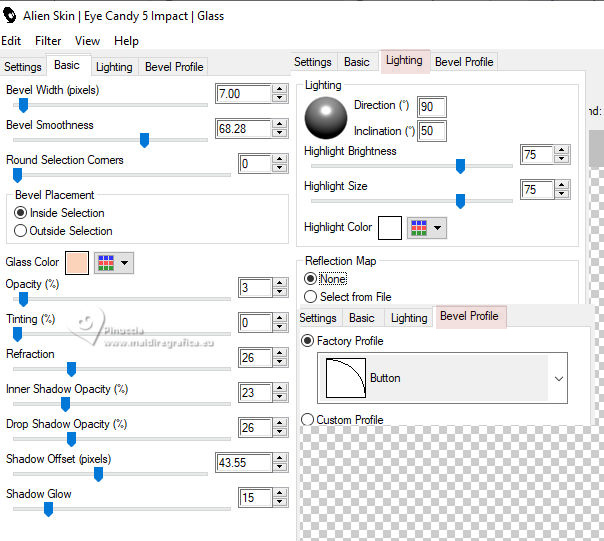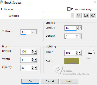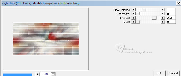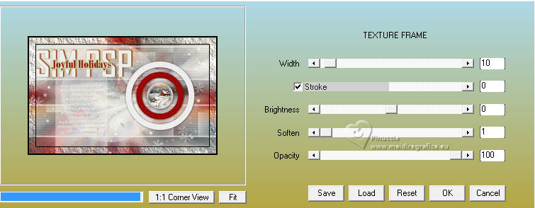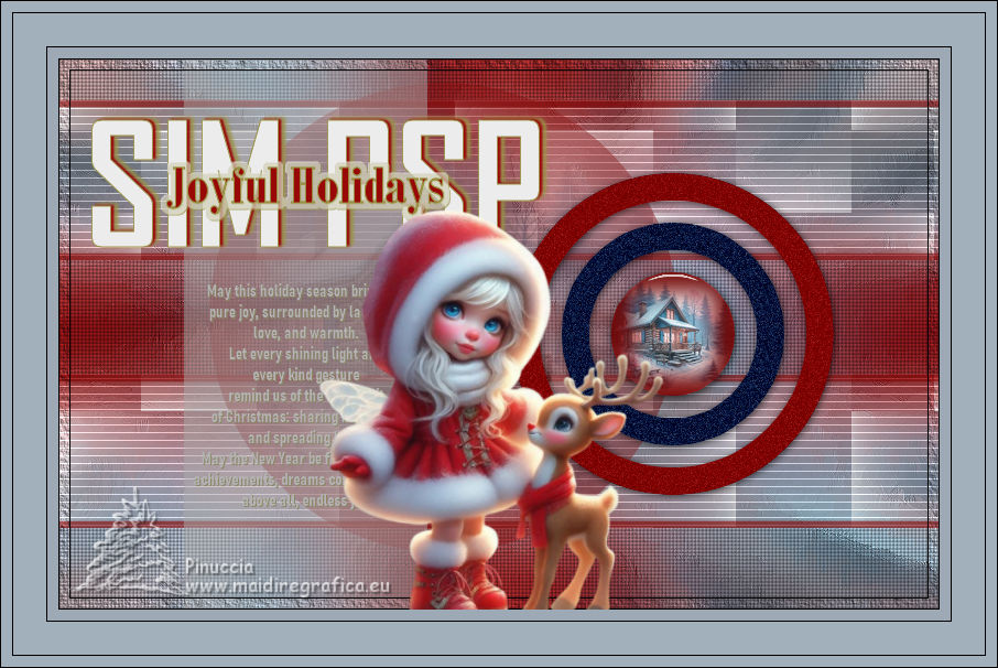 Message de Soxikibem: May this holiday season bring you pure joy, surrounded by laughter, love, and warmth. Let every shining light and every kind gesture remind us of the true spirit of Christmas: sharing happiness and spreading hope. May the New Year be filled with new achievements, dreams come true, and, above all, endless joy. Wishing you and your family a bright Christmas and a New Year full of possibilities! For this tutorial, you will need: ![]() For the tubes thanks PqnaAlice. (The links of the tubemakers here). ![]() consult, if necessary, my filter section here AAA Frames - Texture Frame here Alien Skin Eye Candy 5 Impact - Glass here Carolaine and Sensibility - CS Texture here ![]() You can change Blend Modes according to your colors. ![]() Placer les sélections dans le dossier Sélections. 1. Choose 2 colors to work. Set your foreground color to #980807, and your background color to #999345. ![]() color 3: #ececec. 2. Open a new transparent image 800 x 500 pixels. Flood Fill the transparent image with your foreground color.3. Selections>Select All. Open your landscape's misted 166PaisagemByPqnaAlice ![]() Erase the watermark and go to Edit Copy. Go back to your work and go to Edit>Paste Into Selection. Selections>Select None. 4.. Effects>Image Effects>Seamless Tiling, default settings. ![]() Adjust>Blur>Radial Blur. ![]() Layers>Duplicate. 5. Effects>Art Media Effects>Brush Strokes - background color. ![]() 6. Selections>Load/Save Selections>Load Selection from Disk. Look for and load the selection N24_Xiki1 ![]() Effects>Texture Effects>Weave, color white. ![]() 7. Effects>Plugins>Carolaine and Sensibility - Cs_texture. ![]() 8. Selections>Invert. Effects>Texture Effects>Texture - select the texture Grid ![]() 9. Selections>Invert. Selections>Modify>Select Selection Borders. ![]() Layers>New Raster Layer. Set your foreground color to color 3: #ececec. Reduce the opacity of your Flood Fill Tool to 60% Flood Fill the selection with your foreground color #ececec.Selections>Select None. Set again the opacity of your Flood Fill Tool to 100. 10. Effects>Image Effects>Seamless Tiling - Side by Side. ![]() 11. Layers>New Raster Layer. Selections>Load/Save Selections>Load Selection from Disk. Look for and load the selection N24_Xiki2 ![]() Flood Fill the selection with your foreground color #ececec.Adjust>Add/Remove Noise>Add Noise. ![]() 12. Selections>Modify>Contract - 25 pixels. Press CANC on the keyboard ![]() Selections>Modify>Contract - 20 pixels. Set again your foreground color to the first color #980807 Flood Fill the selection with your foreground color #980807.Adjust>Add/Remove Noise>Add Noise. ![]() 13. Selections>Modify>Contract - 25 pixels. Press CANC on the keyboard ![]() Set again your foreground color to the color 3 cecece. Selections>Modify>Contract - 20 pixels. Flood Fill the selection with your foreground color #ececec.14. Your landscape misted is still in memory: ![]() Edit>Paste into Selection. Adjust>Sharpness>Sharpen. 15. Layers>New Raster Layer. Effects>Plugins>Alien Skin>Eye Candy 5 Impact - Glass. ![]() 16. Selections>Select None. Activate the layer Raster 3. ![]() Effects>3D Effects>Drop Shadow, color black. ![]() 17. Activate the layer Raster 2. Layers>New Raster Layer. Selections>Load/Save Selections>Load Selection from Disk. Look for and load the selection N24_Xiki3 ![]() Reduce the opacity of your Flood Fill Tool to 40 Flood Fill the selection with your foreground color #ececec.Set again the opacity of your Flood Fill to 100. 18. Layers>New Raste Layer. Edit>Paste into Selection - your landscape misted is still in memory. Reduce the opacity of this layer to 25%. Selections>Select None. 19. Activate your top layer, Raster 4. Open TituloJoyfulHolidays ![]() Erase the watermark and go to Edit>Copy. Go back to your work and go to Edit>Paste as New Layer. Pick Tool ![]() Position X: 30,00 - Position Y: 50,00. ![]() If you want, colorize or change the Blend Mode of the layer. For my version I Change to Luminance. 20. Activate the layer Raster 5. Open kimla_WR_snow3 ![]() Erase the watermark and go to Edit>Copy. Go back to your work and go to Edit>Paste as New Layer. 21. Activate the layer Raster 4. Open TextoJoyfulHolidays ![]() Erase the watermark and go to Edit>Copy. Go back to your work and go to Edit>Paste as New Layer. Pick Tool ![]() Position X: 114,00 - Position Y: 0,00. ![]() if you want, colorize or change the blend mode of this layer For my version I change to Luminance (L). 22. Layers>Merge>Merge All. Effects>Plugins>AAA Frames - Texture Frame. ![]() 23. Image>Add Borders, 10 pixels, symmetric, color 3 #ececec. Image>Add borders, 1 pixel, symmetric, color black #000000. Image>Add Borders, 30 pixels, symmetric, color 3 #ececec. Image>Add borders, 1 pixel, symmetric, color black #000000. Image>Add Borders, 10 pixels, symmetric, color 3 #ececec. 24. Open your main tube 040AN_NatalByPqnaAlice ![]() Edit>Copy. Go back to your work and go Edit>Paste as New Layer. Move the tube to the right side.Effects at your choice. 25. Image>Add Borders, 1 pixel, symmetric, color black #000000 . 26. Resize, if you want. Sign your work on a new layer. Layers>Merge>Merge All and save as jpg. For the tube of this version thanks Wieskes ![]() ![]() Your versions. Thanks ![]() Jolcsi ![]() Kika ![]() Marie Nickol ![]() Marion ![]() ![]() If you have problems or doubts, or you find a not worked link, or only for tell me that you enjoyed this tutorial, write to me. |