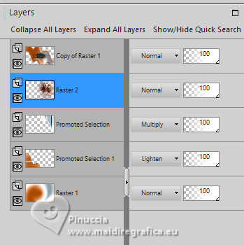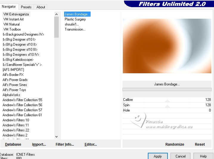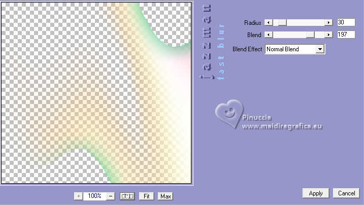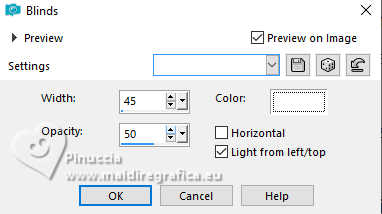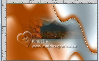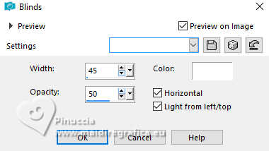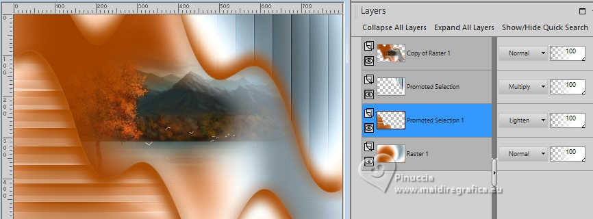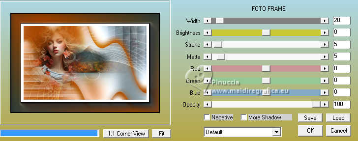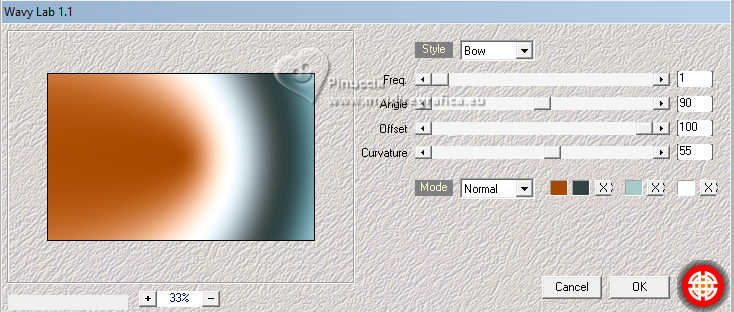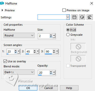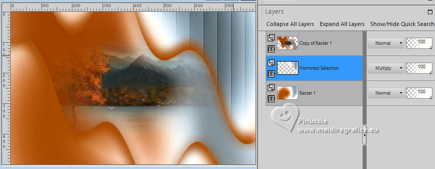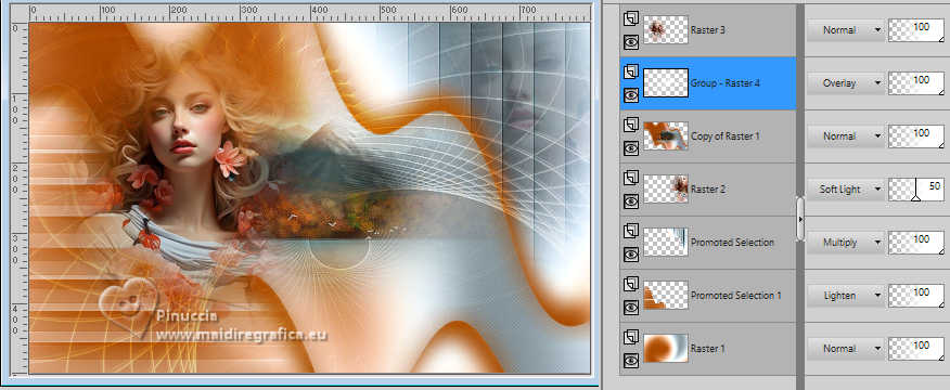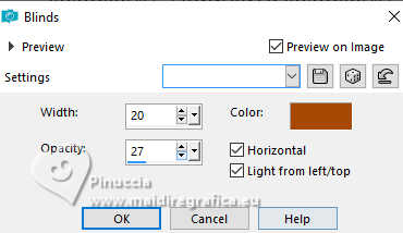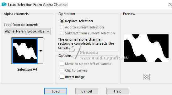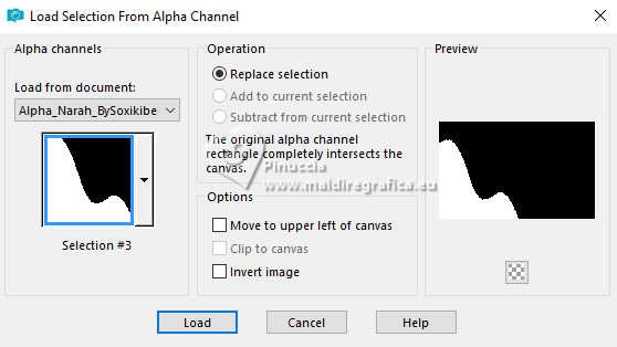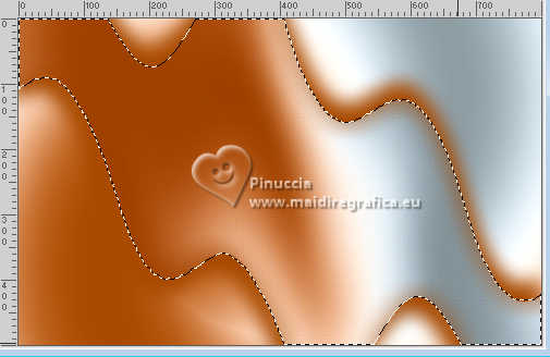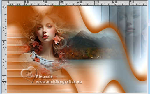 For this tutorial, you will need: ![]() Thanks for the tubes PqnaAlice and for the mask Narah. (The links of the tubemakers here). ![]() ![]() consult, if necessary, my filter section here Filters Unlimited 2.0 here Mehdi - Wavy Lab 1.1. here AAA Frames - Foto Frame here Art Effects - JazzMan's Fast Blur here added also in the material VM Extravaganza - James Bondage here Filters VM Extravaganza can be used alone or imported into Filters Unlimited. (How do, you see here) If a plugin supplied appears with this icon ![]() You can change Blend Modes according to your colors. In the newest versions of PSP, you don't find the foreground/background gradient (Corel_06_029). You can use the gradients of the older versions. The Gradient of CorelX here ![]() 1. Choose 4 colors to work. Set your foreground color to #334343, and your background color to #a74900. ![]() Color 3: #a6caca color 4: #ffffff. 2. Open Alpha_bySoxikibem Window>Duplicate or, on the keyboard, shift+D to make a copy. Close the original. The copy, that will be the basis of your work, is not empty, but contains the selections saved to alpha channel. Effects>Plugins>Mehdi - Wavy Lab 1.1. This filter creates gradients with the colors of your Materials palette. The first is your background color, the second is your foreground color. Change the last two colors created by the filtre: the third color with color 3 #a6caca and the fourth color with #ffffff. ![]() 3. Effects>Plugins>Filters Unlimited 2.0 - VM Extravaganza - James Bondage, default settings. ![]() 4. Layers>Duplicate. Effects>Geometric Effects>Skew. ![]() 5. Effects>Distortion Effects>Wave. ![]() 6. Effects>Plugins>Art Effects - JazzMan's Fast Blur. ![]() 7. Effects>Artistic Effects>Halftone. ![]() 8. Effects>3D Effects>Drop Shadow, background color. ![]() 9. Repeat Effects>3D Effects>Drop Shadow, background color. ![]() 10. Selections>Load/Save Selections>Load Selection From Alpha Channel. Open the selections menu and load the selection Selection #4 ![]() If all is ok, you should have this ![]() Open your landscape misted 153PaisagemByPqnaAlice ![]() Edit>Copy. Go back to your work and go to Edit>Paste as New Layer. Selections>Invert. Press CANC on the keyboard ![]() Selections>Select None. Adjust>Sharpness>Sharpen. Layers>Merge>Merge Down. 11. Activate the layer Raster 1. Selections>Load/Save Selections>Load Selection From Alpha Channel. The selection selection #2 is immediately available. You just have to click Load. ![]() Selections>Promote Selection to Layer. Effects>Texture Effects>Blinds, color white #ffffff. ![]() 12. Effects>Edge Effects>Enhance More. Change the Blend Mode of this layer to Multiply. Selections>Select None. ![]() 13. Activate the layer Raster 1. Selections>Load/Save Selections>Load Selection From Alpha Channel. Open the selections menu and load the selection Selection #3 ![]() Selections>Promote Selection to Layer. Effects>Texture Effects>Blinds, same setting but also Horizontal checked. ![]() 14. Effects>Texture Effects>Blinds - background color. ![]() Effects>Edge Effects>Enhance. Selections>Select None. Change the Blend Mode of this layer to Lighten. ![]() 15. Open the misted 1078MulherByPqnaAlice ![]() Edit>Copy. Go back to your work and go to Edit>Paste as New Layer. Layers>Arrange>Move Up. ![]() 16. Move the tube at the upper right.Change the Blend Mode of this layer to Soft Light and reduce the opacity to 50%. 17. Activate your top layer. Edit>Paste as new layer - the misted is still in memory. Image>Resize, if necessary - for the supplied tube to 70% - resize all layers not checked. Adjust>Sharpness>Sharpen. Move the tube to the left.![]() 18. Layers>New Raster Layer. Flood Fill the layer with color white #ffffff.Layers>New Mask layer>From image Open the menu under the source window and you'll see all the files open. Select the mask NarahsMasks_1771 ![]() Effects>Edge Effects>Enhance. Layers Merge>Merge Group. 19. Layers>Arrange>Move Down. Change the Blend Mode of this layer to Overlay. ![]() 20. For the borders, set again your foreground color to #334343 and keep your background color to #a74900 ![]() Set your foreground color to a Foreground/Background Gradient, style Linear. ![]() Image>Add Borders, 1 pixel, symmetric, foreground color. Image>Add borders, 3 pixels, symmetric, color white #ffffff. Selections>Select All. 21. Image>Add Borders - 50 pixels, symmetric, whatever color. Selections>Invert. Flood Fill the selection with your Gradient.22. Selections>Invert. Effects>3D Effects>Drop Shadow, color black #000000. ![]() 23. Selections>Invert. Effects>Plugins>AAA Frames - Foto Frame. ![]() Selections>Select None. 24. Open TituloNarah_ByXiki ![]() Edit>Copy. Go back to your work and go to Edit>Paste as New Layer. Pick Tool ![]() Pick Tool: Position X: 165,00 - Position Y: 435,00. ![]() Change the Blend Mode of this layer to Luminance (L), or to your liking. 25. Image>Resize, if you want. Sign your work and save as jpg. For the tubes of this version thanks Luz Cristina and Mentali ![]() ![]() Your versions. Thanks ![]() Marisella ![]() Lidia ![]() Jolcsi ![]() Baby ![]() Baby ![]() Marion ![]() ![]() If you have problems or doubts, or you find a not worked link, or only for tell me that you enjoyed this tutorial, write to me. |