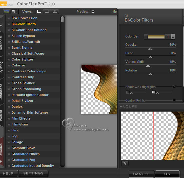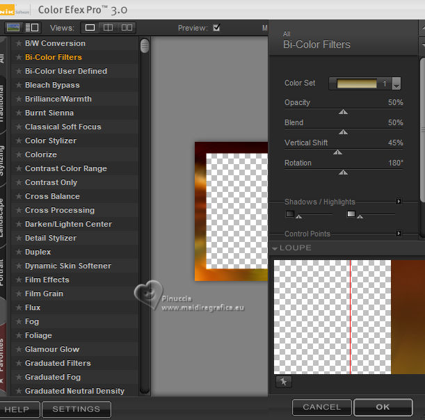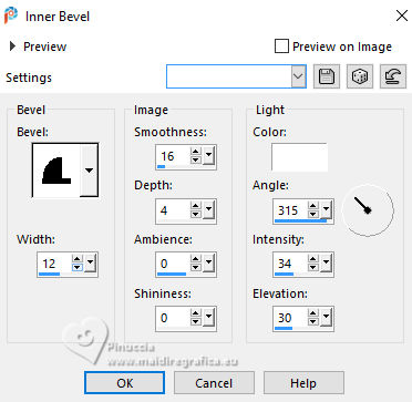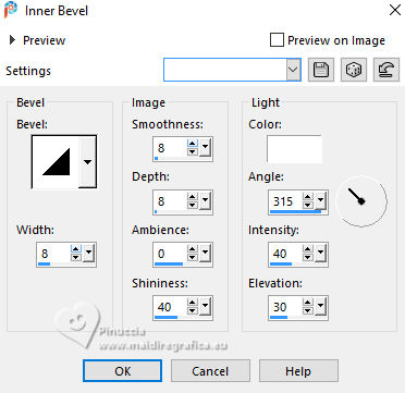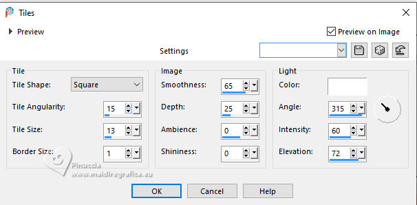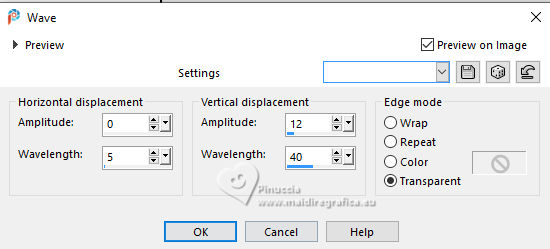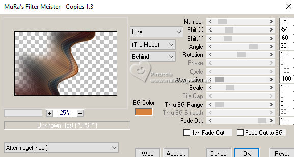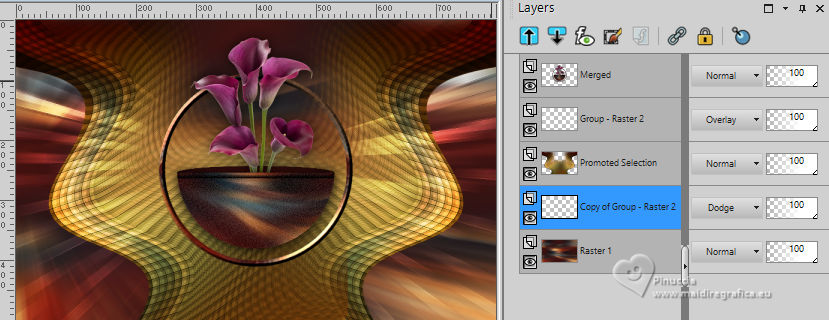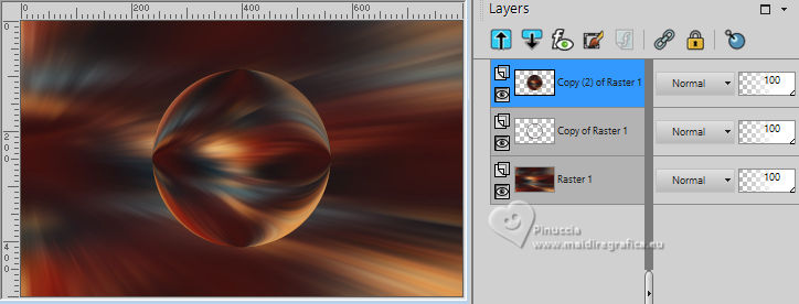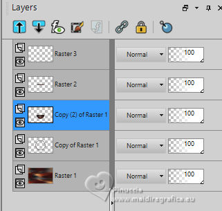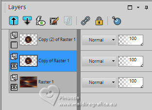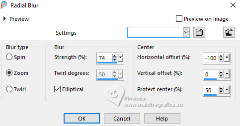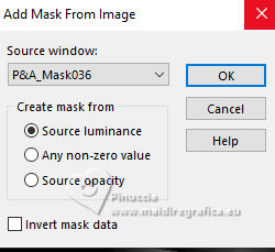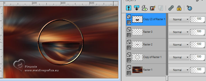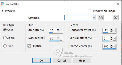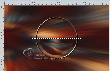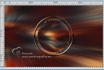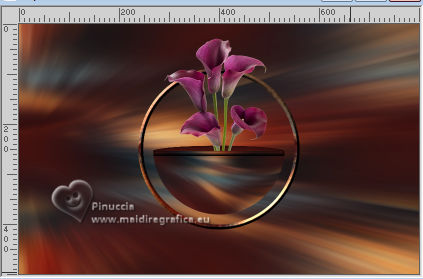 For this tutorial, you will need: ![]() For the tubes thanks PqnaAlice. (The links of the tubemakers here). ![]() consult, if necessary, my filter section here Mura's Meister - Copies here Nik Software - Color Efex 3.0 here ![]() You can change Blend Modes according to your colors. ![]() Open the mask in Psp and minimize it with the rest of the material. 1. Choose 2 colors to work. Set your foreground color to #431311, and your background color to #d7813c. ![]() 2. Open AlphaChannel1272 This image, that will be the basis of your work, is not empty, but contains the selections saved to alpha channel. 3. Flood Fill the transparent image with your foreground color.Selections>Select All. 4. Open your landscape's misted 156PaisagemByPqnaAlice ![]() Erase the watermark and go to Edit Copy. Go back to your work and go to Edit>Paste Into Selection. Selections>Select None. 5. Effects>Image Effects>Seamless Tiling, default settings. ![]() Adjust>Blur>Radial Blur. ![]() 6. Layers>Duplicate. Effects>Geometric Effects>Circle. ![]() Image>Resize, to 65%, resize all layers not checked. Layers>Duplicate. 7. Close the layer Copy (2) of Raster 1. Activate the layer Copy of Raster 1. ![]() Selections>Load/Save Selections>Load Selection from Alpha Channel. The selection Selection #1 is immediately available. You just have to click Load. ![]() Press CANC on the keyboard ![]() ![]() Selections>Select None. 8. Effects>3D Effects>Inner Bevel. ![]() 9. Open and activate the layer Copy (2) of Raster 1. ![]() Selections>Load/Save Selections>Load Selection from Alpha Channel. Open the Selections Menu and load the selection Selection #2 ![]() Press CANC on the keyboard ![]() ![]() Selections>Select None. 10. Selections>Load/Save Selections>Load Selection from Alpha Channel. Open the Selections Menu and load the selection Selection #3 ![]() Press CANC on the keyboard ![]() ![]() Selections>Select None. 11. Selections>Load/Save Selections>Load Selection from Alpha Channel. Open the Selections Menu and load the selection Selection #4 ![]() Effects>3D Effects>Inner Bevel. ![]() Selections>Select None. 12. Layers>New Raster Layer. Selections>Load/Save Selections>Load Selection from Alpha Channel. Open the selections menu and load the selection Selection #5 ![]() Flood Fill the selection with your foreground color.Layers>New Raster Layer. Effects>3D Effects>Cutout. ![]() Selections>Select None. 13. Activate the layer Copy (2) of Raster 1. ![]() Layers>Arrange>Bring to Top. ![]() 14. Open the flowers' tube 134FlorByPqnaAlice ![]() Edit>Copy. Go back to your work and go to Edit>Paste as New Layer. Resize, if necessary, for the supplied tube to 50%. Adjust>Sharpness>Sharpen. I colored the tube to match the colors I'm using. Effects>3D Effects>Drop Shadow, at your choice. Layers>Arrange>Move Down. Place the tube as in my example.![]() 15. Activate the top layer, Copy (2) of Raster 1. Adjust>Add/Remove Noise>Add Noise. ![]() Adjust>Sharpness>Sharpen. Effects>3D Effects>Drop Shadow, color black #000000. ![]() 16. Close the layer Raster 1. Layers>Merge>Merge Visible. 17. Open and activate the layer Raster 1. Selections>Load/Save Selections>Load Selection from Alpha Channel. Open the selections menu and load the selection Selection #6 ![]() Selections>Promote Selection to Layer. Selections>Select None. 18. Effects>Texture Effects>Tiles. ![]() 19. Effects>Reflection Effects>Rotating Mirror. ![]() 20. Effects>Distortion Effects>Wave. ![]() 21. Plugins>Mura's Meister>Copies. ![]() 22. Pick Tool ![]() Position X: 247,00 - Position Y: 0,00. ![]() Layers>Duplicate. Image>Mirror>Mirror Horizontal. Layers>Merge>Merge Down. Adjust>Sharpness>Sharpen. 23. Effects>Plugins>Nik Software - Color Efex Pro 3.0. Bi-Color Filter - to the right Colorset Brown 1 ![]() 24. Set your foreground color to white #ffffff. Layers>New Raster Layer. Flood Fill the layer with color white #ffffff.Layers>New Mask layer>From image Open the menu under the source window and you'll see all the files open. Select the mask P&A_Mask036. ![]() Layers>Merge>Merge Group. 25. Change the Blend Mode of this layer to Overlay. Layers>Duplicate. Change the Blend Mode of this layer to Dodge. Move this layer under the layer Promoted Selection. ![]() Note: At this point we will start to finalize our work. If you wish, duplicate it, save it in psp and finish it in the copy. 26. Edit>Copy Special>Copy Merged. Selections>Select All. Image>Add Borders, 50 pixels, symmetric, whatever color. Selections>Invert. Edit>Paste Into Selection. 27. Adjust>Blur>Radial Blur. ![]() 28. Effects>Plugins>Nik Software - Color Efex Pro 3.0, as at step 23. ![]() Adjust>Add/Remove Noise>Add Noise. ![]() Edit>Repeat Add Noise. Adjust>Sharpness>Sharpen. 29. Selections>Invert. Effects>3D Effects>Drop Shadow, color black #000000. ![]() Selections>Select None. 30. Open your main tube 984MulherbyPqnaAlice ![]() Edit>Copy. Go back to your work and go to Edit>Paste as New Layer. Move the tube to the right.Effects>3D Effects>Drop Shadow, at your choice. 31. Open Titulo_bySoxikibem ![]() Edit>Copy. Go back to your work and go to Edit>Paste as New Layer. Pick Tool ![]() Position X: 27,00 - Position Y: 467.00. ![]() 32. Image>Add Borders, 2 pixels, symmetric, background color. Image>Add Borders, 2 pixels, symmetric, foreground color. 33. If you want, resize your work. Sign your work and save as jpg. For the tubes of this version thanks Luz Cristina and NaiseM ![]() ![]() Your versions. Thanks ![]() Jolcsi ![]() Baby ![]() Baby 2 ![]() ![]() If you have problems or doubts, or you find a not worked link, or only for tell me that you enjoyed this tutorial, write to me. |