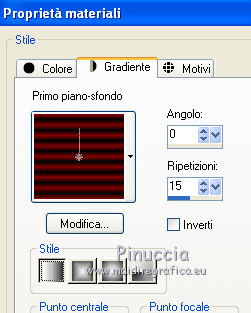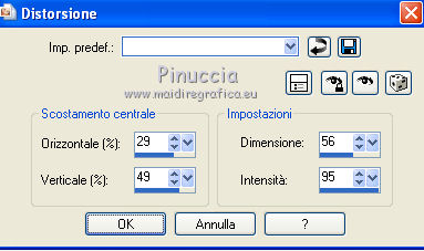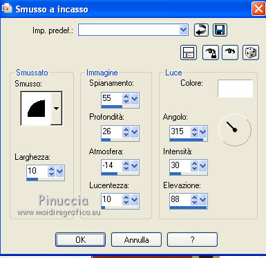 qui puoi trovare qualche risposta ai tuoi dubbi. Se l'argomento che ti interessa non è presente, ti prego di segnalarmelo. Questo tutorial è stato creato con PSP X3, ma può essere eseguito anche con le altre versioni di PSP. Per tradurlo, ho usato PSP X. Questo tutorial è scritto e disegnato da Sternenfee56. Il © del tutorial appartiene all'autrice. Non può essere copiato su altri siti, nè essere offerto per il download. Lo stesso vale per la mia traduzione. Il materiale viene da vari gruppi di condivisione. Il copyright appartiene ai rispettivi autori. Grazie ai creatori dei tubes che mettono a disposizione il loro lavoro in vari gruppi di condivisione. Occorrente: Materiale qui Rispetta il lavoro degli autori, non cambiare il nome del file e non cancellare il watermark. Filtri: in caso di dubbi, ricorda di consultare la mia sezione filtri qui Nik Software - Color Efex Pro qui ![]() 1. Apri una nuova immagine trasparente 700 x 500 pixels. Imposta il colore di primo piano con il colore rosso #800000, e il colore di sfondo con il colore nero. Riempi l'immagine trasparente con il colore di sfondo.2. Apri aclis_interior_02_04_08_2009.pspimage e vai a Modifica>Copia. Torna al tuo lavoro e vai a Modifica>Incolla come nuovo livello. Sposta il tube nell'angolo in alto a sinistra.Apri ds6023haus26[1].07.07pspimage.pspimage e vai a Modifica>Copia. Torna al tuo lavoro e vai a Modifica>Incolla come nuovo livello. Sposta il tube nell'angolo in alto a destra.Livelli>Unisci>Unisci giù. Effetti>Plugins>Nik Software - Color Efex Pro - Cross Balance. ![]() 3. Apri calguisfire41010.pspimage e vai a Modifica>Copia. Torna al tuo lavoro e vai a Modifica>Incolla come nuovo livello. Sposta il tube in basso sul bordo.Attiva lo strumento Deformazione (tasto D sulla tastiera),e, usando il nodo centrale, spingi il tube in basso fino a circa 300 pixels, e usa i nodi laterali a destra e a sinistra per rispettare le proporzioni. ![]() Abbassa l'opacità di questo livello al 50%. 4. Apri 1228506028_feerie.png e vai a Modifica>Copia. Torna al tuo lavoro e vai a Modifica>Incolla come nuovo livello. Immagine>Ridimensiona, al 65%, tutti i livelli non selezionato. Immagine>Rifletti. Sposta il tube in basso a sinistra.sulla muratura della scala. Effetti>Plugins>Nik Software - Color Efex Pro con i settaggi precedenti. Abbassa l'opacità di questo livello al 53%. ![]() 5. Apri il tube 1Patries_VA-lantarenpaal 10-3-09.pspimage e vai a Modifica>Copia. Torna al tuo lavoro e vai a Modifica>Incolla come nuovo livello. Sposta il tube in basso a destra.Livelli>Duplica, e attiva il livello sottostante dell'originale. Regola>Sfocatura>Sfocatura gaussiana - raggio 20. ![]() Attiva il livello superiore della copia. Livelli>Unisci>Unisci giù. 6. Apri il tuo tube principale - il mio SS_1605_Tube.psp - e vai a Modifica>Copia. Torna al tuo lavoro e vai a Modifica>Incolla come nuovo livello. Immagine>Ridimensiona, all'80%, tutti i livelli non selezionato. Sposta in basso al centro, sul bordo.Livelli>Duplica, e attiva il livello sottostante dell'originale. Regola>Sfocatura>Sfocatura gaussiana, con i settaggi precedenti. Attiva il livello della copia. Livelli>Unisci>Unisci giù. 7. Apri Brick_Frame.psp e vai a Modifica>Copia. Torna al tuo lavoro e vai a Modifica>Incolla come nuovo livello. Effetti>Plugins>Nik Software, con i settaggi precedenti. Immagine>Aggiungi bordatura, 3 pixels, simmetriche, con il colore nero. Immagine>Aggiungi bordatura, 7 pixels, simmetriche, con il colore rosso di primo piano. Seleziona questo bordo con la bacchetta magica ![]() Effetti>Plugins>Nik Software, con i settaggi precedenti. Livelli>Nuovo livello raster. Modifica>Incolla nella selezione (la cornice "Brick-Frame" è ancora in memoria). Effetti>effetti 3D>Smusso a incasso. ![]() Effetti>Plugins>Nik software, con i settaggi precedenti. Selezione>Deseleziona. Immagine>Aggiungi bordatura, 20 pixels, simmetriche, con il colore bianco. Seleziona questo bordo con la bacchetta magica , sfumatura e tolleranza 0.Passa il colore di primo piano a Gradiente. ![]() Riempi la selezione con il gradiente.Effetti>Effetti di distorsione>Distorsione. ![]() Modifica>Copia. Livelli>Nuovo livello raster. Modifica>Incolla nella selezione. Selezione>Deseleziona. Immagine>Rifletti. Abbassa l'opacità al 50%. Effetti>Effetti di bordo>Aumenta. Effetti>Plugins>Nik Software, con i settaggi precedenti. Attiva il livello superiore. Selezione>Seleziona tutto. Selezione>Modifica>Contrai - 20 pixels. Selezione>Inverti. Effetti>Effetti di bordo>Aumenta. Effetti>Plugins>Nik Software, con i settaggi precedenti. Selezione>Deseleziona. Immagine>Aggiungi bordatura, 3 pixels, simmetriche, con il colore nero. Immagine>Aggiungi bordatura, 7 pixels, simmetriche, con il colore di primo piano. Seleziona questo bordo con la bacchetta magica , sfumatura e tolleranza 0.Attiva nuovamente la cornice Brick-Frame e vai a Modifica>Copia. Torna al tuo lavoro e vai a Modifica>Incolla nella selezione. Effetti>Plugins>Nik Software, con i settaggi precedenti. Effetti>Effetti di bordo>Aumenta. Selezione>Deseleziona. 8. Scrivi il tuo testo o usa il file di testo fornito con il materiale. In quest'ultimo caso, per entrambi i testi: apri il file. File>Esporta>Pennello personalizzato, assegna un nome al pennello e ok. Attiva lo strumento Pennello ![]() cerca e seleziona il pennello che hai appena esportato, e applicalo cliccando con il tasto sinistro del mouse per usare il colore di primo piano. Effetti>Effetti 3D>Sfalsa ombra. ![]() Eventualmente, ripeti l'Effetto Sfalsa ombra con il colore di primo piano. Aggiungi il tuo nome e/o il tuo watermark su un nuovo livello. Livelli>Unisci>Unisci tutto e salva in formato jpg. ![]() Se hai problemi o dubbi, o trovi un link non funzionante, scrivimi. 8 Gennaio 2011 |