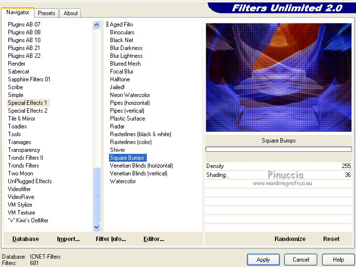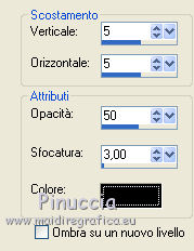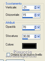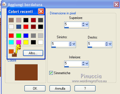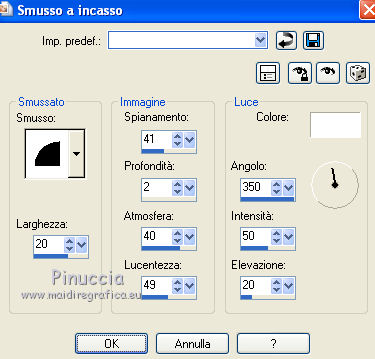 qui puoi trovare qualche risposta ai tuoi dubbi. Se l'argomento che ti interessa non è presente, ti prego di segnalarmelo. Questo tutorial è stato creato con PSP X3, ma può essere eseguito anche con le altre versioni di PSP. Per tradurlo, ho usato PSP X. Questo tutorial è scritto e disegnato da Sternenfee56. Il © del tutorial appartiene all'autrice. Non può essere copiato su altri siti, nè essere offerto per il download. Lo stesso vale per la mia traduzione. Il materiale viene da vari gruppi di condivisione. Il copyright appartiene ai rispettivi autori. Grazie ai creatori dei tubes che mettono a disposizione il loro lavoro in vari gruppi di condivisione. Occorrente: Materiale qui Per il tube grazie Kitty Rispetta il lavoro degli autori, non cambiare il nome del file e non cancellare il watermark. Filtri: in caso di dubbi, ricorda di consultare la mia sezione filtri qui Filters Unlimited 2.0 qui Nik Software - Color Efex Pro qui ![]() Apri il font e minimizzalo. Lo troverai nella lista dei font disponibili quando ti servirà. 1. Apri una nuova immagine trasparente 800 x600 pixels. Imposta il colore di primo piano con il colore chiaro #d65200, e il colore di sfondo con il colore scuro #823e19. Riempi l'immagine trasparente con il colore di primo piano.Selezione>Seleziona tutto. Livelli>Nuovo livello raster. Apri l'immagine di sfondo "Image9" e vai a Modifica>Copia. Torna al tuo lavoro e vai a Modifica>Incolla nella selezione. Cambia la modalità di miscelatura di questo livello in Luminanza (esistente), e abbassa l'opacità al 50%. Selezione>Deseleziona. 2. Livelli>Duplica. Immagine>Rifletti. Livelli>Unisci>Unisci giù. Effetti>Plugins>Filters Unlimited 2.0 - Special Effects 1 - Square Bumps. ![]() 3. Apri il tube B57 butterflyCC02-10.pspimage e vai a Modifica>Copia. Torna al tuo lavoro e vai a Modifica>Incolla come nuovo livello. Immagine>Ridimensiona, al 50%, tutti i livelli non selezionato. Regola>Tonalità e saturazione>Viraggio, con i valori corrispondenti al colore di primo piano. ![]() Abbassa l'opacità di questo livello al 50%. Sposta il tube in alto a sinistra.Livelli>Duplica. Sposta questo tube un po' più a destra e in basso.Livelli>Unisci>Unisci giù. Effetti>Effetti 3D>Sfalsa ombra. ![]() 4. Apri il tube 274-paysage2_LB TUBES.pspimage e vai a Modifica>Copia. Torna al tuo lavoro e vai a Modifica>Incolla come nuovo livello. Immagine>Ridimensiona, all'85%, tutti i livelli non selezionato. Spostalo un po' più a sinistra, al centro.![]() Effetti>Effetti 3D>Sfalsa ombra, con i settaggi precedenti. 5. Apri il tube KS_Autumn-15.10.2008.pspimage e vai a Modifica>Copia. Torna al tuo lavoro e vai a Modifica>Incolla come nuovo livello. Livelli>Carica/Salva maschera>Carica maschera da disco. Cerca e carica la maschera 20-20 ![]() Livelli>Unisci>Unisci gruppo. Livelli>Duplica. Livelli>Unisci>Unisci giù. Sposta il tube a destra.Livelli>Duplica,e cambia la modalità di miscelatura di questo livello in Luce diffusa. Effetti>Effetti 3D>Sfalsa ombra. ![]() 6. Apri il tube BVS Spring Time Doodle03.pspimage e vai a Modifica>Copia. Torna al tuo lavoro e vai a Modifica>Incolla come nuovo livello. Immagine>Rifletti. Sposta il tube in basso a sinistra.Cambia la modalità di miscelatura di questo livello in Luminanza (esistente). Effetti>Effetti 3D>Sfalsa ombra, con i settaggi precedenti. ![]() 7. Immagine>Aggiungi bordatura, 5 pixels, simmetriche, con il colore di sfondo. Cliccando sulla paletta del colore con il tasto destro del mouse, avrai la tabella dei colori più recenti. In basso a sinistra, i tuoi colori di primo piano e sfondo. Clicca sul colore corrispondente per impostarlo. ![]() Seleziona questo bordo con la bacchetta magica , sfumatura e tolleranza 0.Effetti>Effetti 3D>Smusso a incasso. ![]() Effetti>Effetti 3D>Sfalsa ombra. ![]() Ripeti l'Effetto Sfalsa ombra, cambiando verticale e orizzontale con -5. Selezione>Deseleziona. Immagine>Aggiungi bordatura, 7 pixels, simmetriche, con il colore di primo piano. Seleziona questo bordo con la bacchetta magica ![]() Effetti>Plugins>Filters Unlimited - Special Effects 1 - Square Bumps come al punto 2. Selezione>Deseleziona. Immagine>Aggiungi bordatura, 5 pixels, simmetriche, con il colore di sfondo. Seleziona questo bordo con la bacchetta magica , sfumatura e tolleranza 0.Effetti>Effetti 3D>Smusso a incasso, con i settaggi precedenti. Selezione>Deseleziona. 8. Attiva lo strumento Testo e scrivi un testo.Aggiungi il tuo nome e/o il tuo watermark. Livelli>Unisci>Unisci tutto. Facoltativo. Effetti>Plugins>Nik Softare - Color Efex Pro - Cross Balance. ![]() Salva in formato jpg. ![]() Se hai problemi o dubbi, o trovi un link non funzionante, scrivimi. 11 Gennaio 2011 |