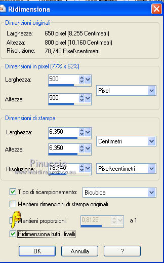Immagine>Ridimensiona, a 500 x 500 pixels, mantieni proporzioni non selezionato.
