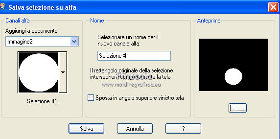 Selezione>Carica/Salva selezione>Salva selezione su canale alfa.