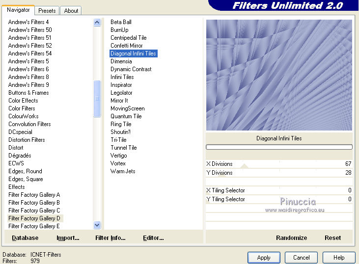 Effetti>Plugins>Filters Unlimited 2.0 - Filter Factory Gallery D - Diagonal Infini Tiles.