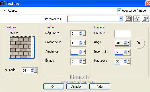 9. Effets>Effets de textures>Texture, sélectionner la texture Ladrillo avec ces réglages