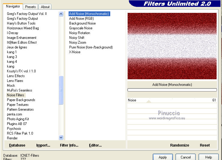 6. Effects>Plugins>Filters Unlimited 2.0 - Noise Filters - Add Noise (Monochromatic).
