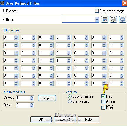 8. Effects>User Defined Filter - select the preset Emboss 3 and keep selected only the canal Red.