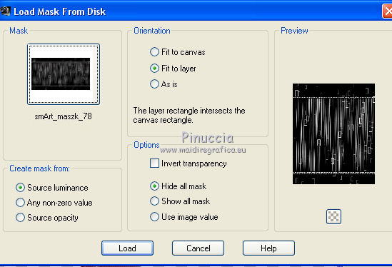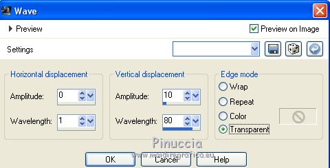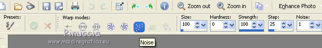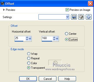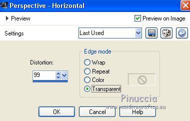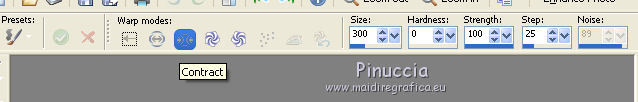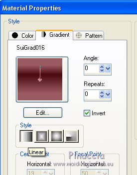 For this tutorial, you will need: Material here SuizaBella_Ref_AG-001952.pspimage SuizaBella_Ref_AG-001269.pspimage Boton.png smArt_maszk_78.jpg (The links of the tubemakers sites here). Plugins consult, if necessary, my filter section here Alien Skin Eye Candy 5 Impact - Perspective Shadow here Mura's Meister - Copies here ![]() You can change Blend Modes and opacity of the layer, according to your colors. Copy the Gradient in the Gradients Folder. Copy the preset in the Presets Folder. Copy the Selection in the Selections Folder. Copy the Mask in the Masks Folder. 1. Set your foreground color to #9a5a62, and your background color to #480a10. ![]() Set your foreground color to Gradient and select the Gradient SuiGrad016, style Linear. ![]() if you use other colors, also the gradient will change color 2. Open a new transparent image 1000 x 800 pixels, Flood Fill the transparent image with your Gradient.3. Effects>Geometric Effects>Perspective Horizontal ![]() Repeat Effects>Geometric Effects>Perspective Horizontal -99. ![]() You should have this ![]() 4. Effects>Distortion Effects>Wave ![]() 5. Effects>Geometric Effects>Spherize ![]() 6. Effects>Geometric Effects>Circle ![]() Image>Mirror. 7. Effects>Plugins>Mura's Meister - Copies. your background color always appears in the color box but in this case for the result the color doesn't matter ![]() 8. Effects>Reflection Effects>Rotating Mirror, default settings. ![]() 9. Activate your Magic Wand Tool ![]() and click on the transparent zone to select it. ![]() 10. Selections>Modify>Expand - 5 pixels. ![]() Flood Fill the selection with your gradient.Selections>Select None. 11. Layers>Duplicate. Image>Resize, to 70%, resize all layers not checked. 12. Layers>Duplicate. Image>Resize, to 70%, resize all layers not checked. Layers>Merge>Merge Down - 2 times. 13. Image>Resize, to 50%, resize all layers not checked. Image>Flip. 14. Effects>Image Effects>Offset. ![]() 15. Layers>Duplicate. Image>Flip. Move the lower figure![]() a bit upper ![]() 16. Layers>Merge>Merge Down. 17. Layers>Duplicate. 18. Image>Free Rotate - 90 degrees to right ![]() Layers>Merge>Merge Down. 19. Layers>Duplicate. 20. Activate your Pick Tool ![]() and move the mouse until you see the rounded arrows ![]() Slowly turn the image to the left, so that you have roughly this ![]() Layers>Merge>Merge Down. 21. Activate your Warp Brush with these settings![]() 22. Click 7 times (slowly) and you'll see the center contract, until you get this ![]() 23. Change the Brush settings ![]() Start making a small click at the indicated point. ![]() to have more or less this ![]() 24. Open Boton and go to Edit>Copy. Go back to your work and go to Edit>Paste as new layer. Place the tube in the center of the figure![]() Layers>Merge>Merge Down. 25. Effects>Plugins>Mura's Meister - Copies. ![]() 26. Layers>New Raster Layer. Selections>Load/Save Selection>Load selection from disk. Look for and load the selection SeleccionSuiza 2020-2 ![]() Flood Fill the selection with your background color #480a10.27. Effects>3D Effects>Inner Bevel. ![]() Selections>Select None. Layers>Arrange>Move Down. Layers>Merge>Merge visible. 28. Layers>New Raster Layer. Flood Fill the layer with your Gradient.Layers>Arrange>Move Down. 29. Adjust>Add/Remove Noise>Add Noise. ![]() Layers>Duplicate. 30. Layers>Load/Save Mask>Load Mask from Disk. Look for and load the mask smArt_maszk_78.jpg ![]() Layers>Merge>Merge Group. 31. Effets>Plugins>Alien Skin Eye Candy 5 Impact - Perspective Shadow shadow color: background color #480a10. ![]() Change the Blend Mode of this layer to Hard Light. 32. Open the tube Suizabella_Ref_AG-001269 and go to Edit>Copy. Go back to your work and go to Edit>Paste as new layer. Objects>Align>Left If you are using an older version that does not make the Objects Menu available, activate your Pick Tool ![]() and set Position X to 0,00 ![]() ![]() Change the Blend Mode of this layer to Luminance. 33. Effects>User Defined Filter - select the preset Emboss 3 and ok. ![]() 34. Layers>Duplicate. Image>Mirror. Image>Flip. Layers>Merge>Merge Down. 35. Activate your top layer, Merged. 36. Effects>Plugins>Alien Skin Eye Candy 5 Impact - Perspective Shadow shadow color: background color #480a10. ![]() 37. Open the woman tube Suizabella_Ref-AG-001952 and go to Edit>Copy. Go back to your work and go to Edit>Paste as new layer. Image>Resize, to 85%, resize all layers not checked. Place rightly the tube, see my example.Effects>Plugins>Alien Skin Eye Candy 5 Impact - Perspective Shadow shadow color: background color #480a10. ![]() 38. Layers>Merge>Merge All. Optional: join the author and translator's watermarks. Sign your work and save as jpg. Version with tube by Alies ![]() Version with tube by Ana Ridzi ![]() ![]() If you have problems or doubt, or you find a not worked link, or only for tell me that you enjoyed this tutorial, write to me. 12 September 2020 |