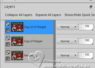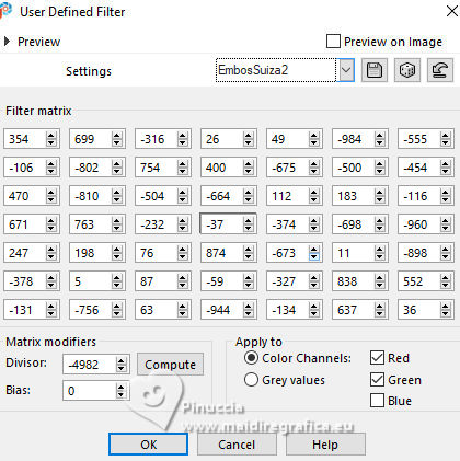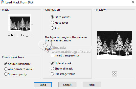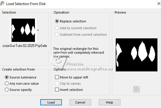 ![]() For this tutorial, you will need ![]() Material by SuizaBella (The links of the tubemakers sites here). Plugins consult, if necessary, my filter section here Alien Skin Eye Candy 5 Impact - Perspective Shadow here Alien Skin Xenofex 2 - Constellation here Animation Shop here ![]() ![]() You can change Blend Modes and opacity of the layer, according to your colors. ![]() Copy the preset Emboss 4 and EmbossSuiza2 in the Presets Folder. Copy the gradient in the Gradients Folder. Copy the selection in the Selections Folder. Copy the Masks in the Masks Folder. 1. Set your foreground color to #931300, and your background color to #065b31. ![]() color 3 #eaeaeb 2. Set your foreground color to Gradient and select the gradient SuiGrad018, style Linear. ![]() if you use other colors, also the gradient will change colors 3. Open a new transparent image 1000 x 800 pixels, Flood Fill the transparent image with your Gradient.5. Adjust>Add/Remove Noise>Add Noise. ![]() 6. Layers>New Raster Layer. Set your foreground color to color 3 #eaeaeb. ![]() Flood Fill the layer with your foreground color #eaeaeb.7. Adjust>Add/Remove Noise>Add Noise, same settings. ![]() 8. Layers>Load/Save Mask>Load Mask from Disk. Look for and load the mask WINTERS EVE_BG 6.png ![]() Layers>Merge>Merge Group. 9. Effects>User Defined Filter - preset Emboss 4. ![]() 10. Effects>Plugins>Alien Skin Eye Candy 5 Impact - Perspective Shadow. ![]() 11. Set again your foreground color to #931300 and to the Gradient Suigrad018 ![]() 12. Layers>New Raster Layer. Flood Fill the layer with your Gradient.13. Adjust>Add/Remove Noise>Add Noise, same settings. ![]() Image>Mirror>Mirror vertical (Image>Flip). 14. Layers>Load/Save Mask>Load Mask from Disk. Look for and load the mask WINTERS EVE_BG 1.png ![]() Layers>Merge>Merge Group. 15. Effects>User Defined Filter - preset EmbossSuiza 2. ![]() 16. Effects>Plugins>Alien Skin Eye Candy 5 Impact - Perspective Shadow. ![]() 17. Open the tube SuizaBella_Ref_AG-004882.pspimage ![]() Edit>Copy. Go back to your work and go to Edit>Paste as new layer. Image>Resize, to 85%, resize all layers not checked. Move the tube to the left.![]() ![]() 18. Effects>Plugins>Alien Skin Eye Candy 5 Impact - Perspective Shadow. ![]() 19. Sign your work. 20. Layers>Merge>Merge visible. 21. Selections>Load/Save Selection>Load Selection from Disk. Look for and load the selection SeleccionSui-Tuto-02-2025.PspSelection ![]() The selection is adapted to the tube used ![]() If you want to use a tube that covers tree selection, see my solution for the second version at the bottom of the tutorial 22. Layers>Duplicate - 2 times, to have 3 layers ![]() 23. Stay on the second copy's layer. Effects>Plugins>Alien Skin Xenofex 2 - Constellation ![]() 24. Activate the layer below of the first copy. Effects>Plugins>Alien Skin Xenofex 2 - Constellation ![]() 25. Activate the layer below of the original. Effects>Plugins>Alien Skin Xenofex 2 - Constellation ![]() Selections>Select None. 28. Save the work as PSP Animation Shop ![]() 29. Open Animation Shop. Open the image you have just saved, and you'll have an animation composed of 3 frames. ![]() Keep the display time to 10 Check the result clicking on View Animation ![]() and save as gif. ![]() If your tube covers the trees ![]() Close the layer of the tube before to do Layer>Merge>Merge visible. Load the selection SeleccionSui-Tuto-02-2025.PspSelection ![]() If you want follow my example, select the second tree ![]() Layers>Duplicate - 2 times to have the 3 layers ![]() On the second copy. Effects>Plugins>Alien Skin Xenofex 2 - Constellation ![]() On the first copy Effects>Plugins>Alien Skin Xenofex 2 - Constellation ![]() On the original Effects>Plugins>Alien Skin Xenofex 2 - Constellation ![]() Selections>Select None. Re-open the layer of the tube and close the layers of the copies. ![]() Edit>Copy Special>Copy Merged. Open Animation Shop and go to Edit>Paste>Paste as new animation. In PSP, close the bottom layer and open the layer of the first copy. ![]() Edit>Copy Special>Copy Merged. In Animation Shop, Edit>Paste>Paste after the current frame. In PSP, close the layer of the first copy and open the layer of the second copy. ![]() Edit>Copy Special>Copy Merged. In Animation Shop, Edit>Paste>Paste after the current frame. Check the result clicking on View Animation ![]() and save as gif. ![]() Version with my tube ![]() For the tube of this version thank Suizabella ![]() ![]() If you have problems or doubt, or you find a not worked link, or only for tell me that you enjoyed this tutorial, write to me. 20 November 2025 |
