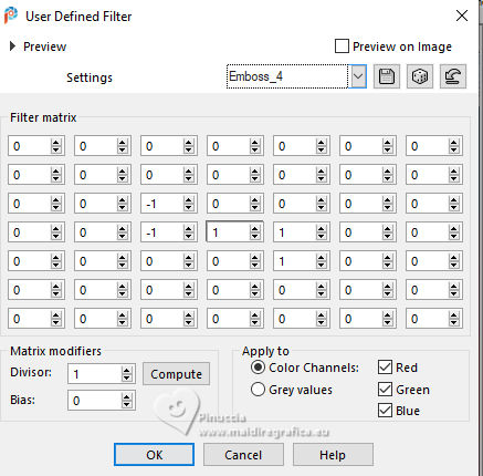 For this tutorial, you will need: ![]() For a mask thanks Narah. The rest of the material is by Suizabella. (The links of the tubemakers sites here). ![]() consult, if necessary, my filter section here Flaming Pear - Flexify 2 here Alien Skin Eye Candy 5 Impact - Perspective Shadow here ![]() You can change Blend Modes and opacity of the layer, according to your colors. ![]() Copy the preset Emboss 4 in the Presets Folder. Copy the masks in the Masks Folder. 1. Set your foreground color to #103356, and your background color to #a90c07. ![]() 2. Open a new transparent image 1000 x 800. Flood Fill the transparent image with your foreground color #103356.3. Adjust>Add/Remove Noise>Add Noise. ![]() 4. Layers>New Raster Layer. Flood Fill the layer with your background color #a90c07.5. Adjust>Add/Remove Noise>Add Noise, same settings ![]() 6. Layers>Load/Save Mask>Load Mask from Disk. Look for and load the mask serie2012-99 ![]() Layers>Merge>Merge Group. 7. Effets>User Defined Filter - select the preset Emboss 4 and ok. ![]() Image>Mirror>Mirror horizontal (Image>Mirror). Effects>Reflection Effects>Rotating Mirror, default settings. ![]() 8. Effects>Plugins>Flaming Pear - Flexify 2 ![]() 9. Effects>Plugins>Alien Skin Eye Candy 5 Impact - Perspective Shadow. ![]() Reduce the opacity of this layer to 75%. 10. Layers>New Raster Layer. Flood Fill with your foreground color #103356.Adjust>Add/Remove Noise>Add Noise, same settings ![]() 11. Layers>Load/Save Mask>Load Mask from Disk. Load again the mask serie2012-99 ![]() Layers>Merge>Merge Group. 12. Effects>User Defined Filter - Emboss 4 ![]() Image>Mirror>Mirror horizontal (Image>Mirror). Effects>Reflection Effects>Rotating Mirror, default settings. ![]() 13. Effects>Plugins>Flaming Pear - Flexify 2, same settings. ![]() Image>Mirror>Mirror horizontal (Image>Mirror). 14. Effects>Plugins>Alien Skin Eye Candy 5 Impact - Perspective Shadow. ![]() Image>Resize, to 50%, resize all layers not checked. Move the image to the left, as below.![]() 15. Layers>New Raster Layer. Selections>Load/Save Selection>Load Selection from Disk. Look for and load the selection SeleccionSui-Tuto-01-2024 ![]() 16. Open the tube SuizaBella_Ref_AG-001317.pspimage ![]() Edit>Copy. Go back to your work and go to Edit>Paste into Selection. Effects>Plugins>Alien Skin Eye Candy 5 Impact - Glass. Glass color: foreground color ![]() Selections>Modify>Select Selection Borders. ![]() Flood Fill the selection with your background color #a90c07.Effects>User Defined Filter - Emboss 4. ![]() Selections>Select None. Image>Resize, to 50%, resize all layers not checked. Place correctly the image.![]() Activate your bottom layer, Raster 1. Layers>New Raster Layer. Flood Fill the layer with your background color #a90c07.Layers>Load/Save Mask>Load Mask from Disk. Look for and load the mask Narah_mask_Nature024 ![]() Layers>Merge>Merge Group. Effects>Plugins>Alien Skin Eye Candy 5 Impact - Perspective Shadow. ![]() Layers>Merge>Merge visible. Open your main tube SuizaBella_Ref_AG-004031 ![]() Edit>Copy. Go back to your work and go to Edit>Paste as new layer. Image>Mirror>Mirror horizontal (Image>Mirror) Image>Resize, to 85%, resize all layers not checked. Effects>Plugins>Alien Skin Eye Candy 5 Impact - Perspective Shadow. ![]() Place correctly the tube![]() Sign your work on a new layer. Layers>Merge>Merge All and save as jpg. ![]() ![]() ![]() If you have problems or doubt, or you find a not worked link, or only for tell me that you enjoyed this tutorial, write to me. |