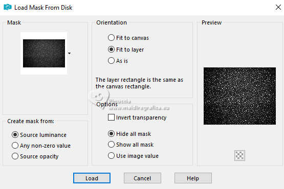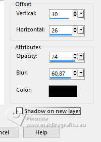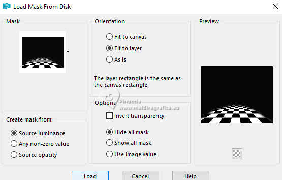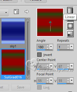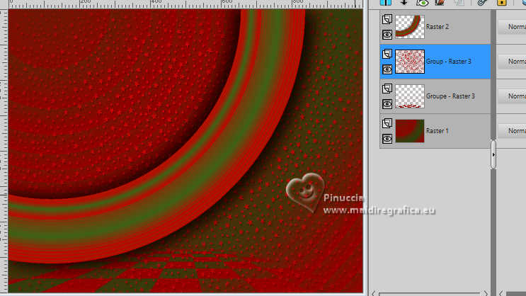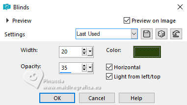 ![]() For this tutorial, you will need ![]() For a mask thanks Cre@nnie. The rest of the material is by SuizaBella (The links of the tubemakers sites here). Plugins consult, if necessary, my filter section here Filters Unlimited 2.0 here Alien Skin Eye Candy 5 Impact - Perspective Shadow here Mura's Meister - Pole Transform here VM Natural - Sparkle here Filters VM Natural can be used alone or imported into Filters Unlimited. (How do, you see here) If a plugin supplied appears with this icon ![]() ![]() You can change Blend Modes and opacity of the layer, according to your colors. Copy the preset Emboss 3 in the Presets Folder. Copy the gradient in the Gradients Folder. Copy the Masks in the Masks Folder. ![]() 1. Set your foreground color to #960000, and your background color to #2a440e. ![]() 2. Set your foreground color to Gradient and select the gradient SuiGrad-016, style Linear. ![]() if you use other colors, also the gradient will change colors 3. Open a new transparent image 1000 x 800 pixels, Flood Fill the transparent image with your Gradient.4. Effects>Texture Effects>Blinds, background color. ![]() 5. Effects>Plugins>Mura's Meister - Pole Transform. ![]() 6. Layers>New Raster Layer. Flood Fill again with your Gradient.7. Effects>Texture Effects>Blinds, same settings. ![]() 9. Effects>Plugins>Mura's Meister - Pole Transform. ![]() 10. Activate your Magic Wand tool , tolerance 10 and feather 2.![]() and click on the outer color parts to select them. ![]() 11. Press CANC on the keyboard ![]() Selections>Select None. 12. Adjust>One Step Photo Fix. 13. Effects>3D Effects>Drop Shadow. ![]() 14. Repeat Effects>3D Effects>Drop Shadow, negative settings. ![]() 15. Activate your background layer, Raster 1. ![]() 16. Layers>New Raster Layer. Set your foreground color to Color. ![]() Flood Fill the layer with your foreground color #960000.17. Ajust>Add/Remove Noise>Add Noise. ![]() 18. Layers>Load/Save Mask>Load Mask from Disk. Look for and load the mask cre@nnie-46. ![]() Layers>Merge>Merge Group. 19. K key to activate your Pick Tool ![]() in mode Scale pull the top central node down,until to 400 pixels ![]() 20. Layers>New Raster Layer. Flood Fill the layer with your foreground color #960000.17. Ajust>Add/Remove Noise>Add Noise, same settings. ![]() 18. Layers>Load/Save Mask>Load Mask from Disk. Look for and load the mask MASKSUIZA-0130. ![]() Layers>Merge>Merge Group. 19. Effects>Plugins>Alien Skin Eye Candy 5 Impact - Perspective Shadow. ![]() 20. Adjust>One Step Photo Fix. 21. Stay on this layer ![]() 22. Open the tube Suizabella_Ref_AG-001683.pspimage ![]() Edit>Copy. Go back to your work and go to Edit>Paste as new layer. Image>Resize, to 85%, resize all layers not checked. Move the tube at the upper left.23. Open the tube Suizabella_Ref_AG-003829.pspimage ![]() Edit>Copy. Go back to your work and go to Edit>Paste as new layer. Image>Resize, to 85%, resize all layers not checked. Move the tube at the bottom right.24. Change the Blend Mode of this layer to Difference. 25. Effects>User Defined Filter - select the preset Emboss 3 and ok. ![]() 26. Layers>Merge>Merge All. 27. Effects>Plugins>VM Natural - Sparkle. ![]() 28. Open the tube Suizabella_Ref_AG-003830.pspimage ![]() Edit>Copy. Go back to your work and go to Edit>Paste as new layer. Image>Resize, to 85%, resize all layers not checked. Move the tube a bit to the left.if you want to change the color of the dress, like in my example, set the foreground color to your chosen color, for me #006d5d ![]() activate your Color Changer Tool ![]() and click on the dress with your left mouse button ![]() 29. Effects>3D Effects>Drop Shadow. ![]() 30. Sign your work on a new layer. Place the credit corresponding to the Author and the Translator of the tutorial. Layers>Merge>Merge All and save as jpg. ![]() ![]() ![]() If you have problems or doubt, or you find a not worked link, or only for tell me that you enjoyed this tutorial, write to me. 20 November 2023 |