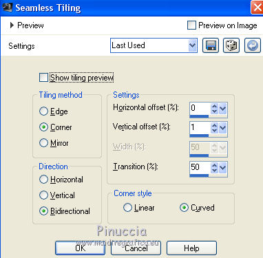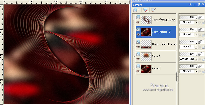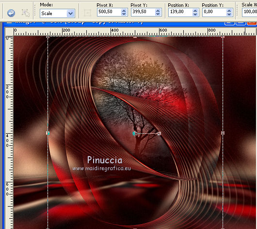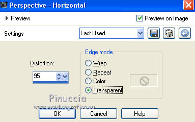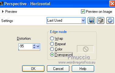 For this tutorial, you will need: Material here SuizaBella_Ref_AG-00897.pspimage 3027-luzcristina.pspimage Másk-Geo-Zen_105.jpg !!!!.mask.ket-fadesuave-1.jpg (The links of the tubemakers sites here). Plugins consult, if necessary, my filter section here Alien Skin Eye Candy 5 Impact - Perspective Shadow here Mura's Meister - Perspective Tiling here Mura's Meister - Copies here Flaming Pear - Flexify 2 here ![]() You can change Blend Modes and opacity of the layer, according to your colors. Copy the masks in the Masks Folder. 1. Set your foreground color to #260100, and your background color to #800003. ![]() 2. Open a new transparent image 1000 x 800 pixels. Flood Fill the transparent image with your foreground color #260100.3. Selections>Select All. Open the tube Suizabella_ref_AG_00897 and go to Edit>Copy. Go back to your work and go to Edit>Paste into Selection. Selections>Select None. 4. Effects>Image Effects>Seamless Tiling. ![]() 5. Adjust>Blur>Gaussian Blur - radius 25. ![]() 6. Adjust>Add Remove Noise>Add Noise. ![]() 7. Layers>Duplicate. Effects>Plugins>Mura's Meister - Perspective Tiling. (with these settings the color doesn't matter) ![]() 8. Layers>Load/Save Mask>Load Mask from Disk. Look for and load the mask !!!!.mask.ket-fadesuave-1.jpg. ![]() Layers>Merge>Merge Group. 9. Layers>Duplicate. Effects>Geometric Effects>Perspective horizontal. ![]() Repeat Perspective Horizontal, distortion -95. ![]() ![]() 10. Layers>Duplicate. Effects>Geometric Effects>Circle. ![]() 11. Effetti>Plugins>Flaming Pear - Flexify 2. ![]() 12. Effects>Plugins>Mura's Meister - Copies. ![]() 13. Layers>Duplicate. Image>Mirror. Image>Flip. Layers>Merge>Merge Down. Adjust>One Step Photo Fix. 14. Effects>Plugins>Alien Skin Eye Candy 5 Impact - Perspective Shadow. ![]() 15. Activate the layer Raster 1. Open the landscape 3027-luzcristina.pspimage and go to Edit>Copy. Go back to your work and go to Edit>Paste as new layer. Change the Blend Mode of this layer to Luminance (legacy). Move the tube a bit higher.![]() 16. Activate again the layer Raster 1. Layers>Duplicate. Layers>Arrange>Move up - 2 times (over the mask's layer). ![]() 17. Layers>Load/Save Mask>Load Mask from Disk. Look for and load the mask Mask-Geo-Zen_105. ![]() Layers>Merge>Merge Groupe. 18. Effects>Geometric Effects>Circle, same settings. ![]() Adjust>One Step Photo Fix. Objects>Align>Bottom, or move / down.![]() 19. Activate the top layer. Activate again the tube of the woman and go to Edit>Copy. Go back to your work and go to Edit>Paste as new layer. Image>Resize, 2 times to 80%, resize all layers not checked. Place correctly the tube.20. Effects>Plugins>Alien Skin Eye Candy 5 Impact - Perspective Shadow. ![]() Layers>Merge>Merge All. 21. Sign your work on a new layer. Optional: add the watermark of the author and translator. 22. Layers>Merge>Merge All and save as jpg. Version with tubes by Criss and Thafs ![]() ![]() If you have problems or doubt, or you find a not worked link, or only for tell me that you enjoyed this tutorial, write to me. 2 March 2020 |