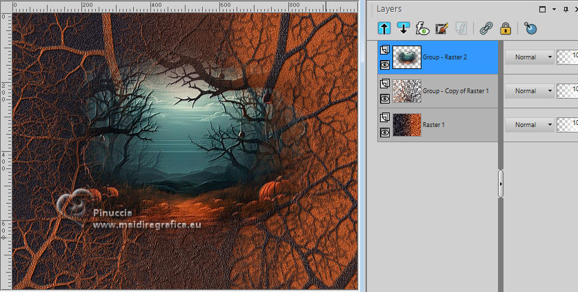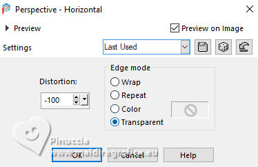 For this tutorial, you will need: ![]() For the mask thanks Narah. The rest of the material is by Suizabella. (The links of the tubemakers sites here). ![]() consult, if necessary, my filter section here Mura's Meister - Copies here Alien Skin Eye Candy 5 Impact - Perspective Shadow here ![]() You can change Blend Modes and opacity of the layer, according to your colors. ![]() The texture Fine Canvas or Corel_15_005 is standard. If you don't find it in your PSP, copy the supplied one in the Textures Folder. Copy the preset Emboss 3 in the Presets Folder. Copy the Gradient SuiGrad-044 in the Gradients Folder. Copy the mask Narah_mask_Nature023 in the Masks Folder. 1. Set your foreground color to #b05328, and your background color to #27222b. ![]() Set your foreground color to Gradient and select the gradient SuiGrad-044, style Linear. ![]() if you use other colors, the gradient will also change color ![]() 2. Open a new transparent image 1000 x 800 pixels. Flood Fill the transparent image with your Gradient.3. Adjust>Add/Remove Noise>Add Noise. ![]() 4. Effects>User Defined Filter - select the preset Emboss 3 and ok. ![]() 5. Layers>Duplicate. Image>Mirror. 6. Layers>Load/Save Mask>Load Mask from Disk. Look for and load the mask Narah_mask_Nature023 ![]() Layers>Merge>Merge Group. Effects>User Defined Filter - preset Emboss 3. ![]() 7. Effects>Plugins>Alien Skin Eye Candy 5 Impact - Perspective Shadow. ![]() 8. Open the tube PaisajeTutorial Halloween.png ![]() Edit>Copy. Go back to your work and go to Edit>Paste as new layer. for my example, to hide edge traces ![]() I applied two times the mask !!!20-21 ![]() Repeat Effects>User Defined Filter - preset Emboss 3ok. ![]() You should have this ![]() 9. Activate your bottom layer, Raster 1. ![]() Layers>Duplicate. Layers>Arrange>Bring to Top. 10. Effects>Geometric Effects>Perspective horizontal. ![]() Repeat Effects>Geometric Effects>Perspective horizontal -100. ![]() 11. Effects>Geometric Effects>Circle. ![]() 12. Effects>Texture Effects>Texture - select the texture Fine Canvas or Corel_15_005. ![]() 13. Effects>Distortion Effects>Twirl. ![]() 14. Effects>Plugins>Mura's Meister - Copies (with these settings, the color BG Color doesn't matter) ![]() 15. Effects>Image Effects>Offset. ![]() 16. Layers>Duplicate. Image>Flip. Image>Mirror. Layers>Merge>Merge Down. 17. Effects>3D Effects>Drop shadow, color black. ![]() 18. Open the tube SuizaBella_Ref_AG-003646.pspimage ![]() Edit>Copy. Go back to your work and go to Edit>Paste as new layer. Image>Resize, to 68%, resize all layers not checked. Image>Mirror. Move the tube to the left.If you use the supplied tube: Adjust>Brightness and Contrast>Brightness and Contrast ![]() 19. Effects>Plugins>Alien Skin Eye Candy 5 Impact - Perspective Shadow. ![]() 20. Sign your work on a new layer. Layers>Merge>Merge All and save as jpg. For the tube of this version thanks Adrienne ![]() ![]() If you have problems or doubt, or you find a not worked link, or only for tell me that you enjoyed this tutorial, write to me. |