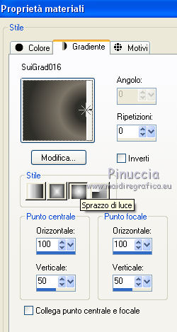 Passa il colore di primo piano a Gradiente, e seleziona il gradiente SuiGrad016, stile Sprazzo di luce.