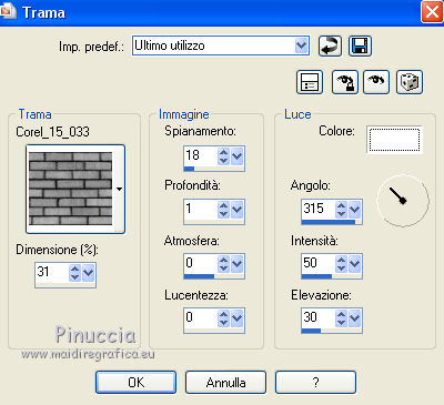 8. Effetti>Effetti di trama>Trama - seleziona la trama Mattoni o Corel_15_033, con i seguenti settaggi.