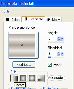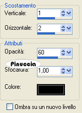 qui puoi trovare qualche risposta ai tuoi dubbi. Se l'argomento che ti interessa non è presente, ti prego di segnalarmelo. Occorrente: 3 immagini. Se usi tue immagini, dovrai ridimensionarle a 190 pixels di altezza, facendo attenzione che siano più lunghe che larghe. Eventualmente, prendi come esempio le dimensioni delle immagini fornite con il tutorial. Inoltre, dovrai aggiungere alle immagini una bordatura di 1 pixel, di colore nero: Immagine>Aggiungi bordatura, 1 pixel, simmetriche, con il colore nero. Materiale (font "Splendid ES" e immagini) qui Filtri: Eye Candy 3.1 qui Jeux de Lignes qui FM Tile Tools qui Scegli un colore chiaro come colore di sfondo, e un colore scuro come colore di primo piano. Io ho scelto: chiaro #ebe7e4 e scuro #ada195. Passa il colore di primo piano a gradiente di primo piano/sfondo, con i seguenti settaggi: ![]() Apri una nuova immagine trasparente 450 x 350 pixels, e riempila con il colore chiaro.Selezione>Seleziona tutto. Apri il tube Susan T1249. Colorizzalo con il colore scuro. Prendi nota nella paletta dei materiali dei relativi valori di Saturazione e Tonalità, come spiegato qui Regola>Saturazione e Tonalità>Viraggio, e trascrivi i due valori corrispondenti. Modifica>Copia. Torna al tuo lavoro. Livelli>Nuovo livello raster. Modifica>Incolla>Incolla nella selezione. Selezione>Nessuna selezione. Livelli Duplica. Immagine>Capovolgi. Immagine>Rifletti. Abbassa l'opacità di questo livello al 60%. Chiudi il livello inferiore. Livelli>Unisci>Unisci visibile. Effetti>Effetti di bordo>Aumenta. Effetti>Plugins>FM Tile Tools - Blend Emboss, con i settaggi standard. ![]() Puoi rendere nuovamente visibile il livello inferiore. Livelli>Nuovo livello raster. Attiva lo strumento Selezione ,selezione personalizzata , con i seguenti settaggi:![]() Riempi la selezione con il gradiente.Regola>Sfocatura>Sfocatura gaussiana, raggio 9. Effetti>Plugins>Jeux de Lignes - Entrelacement: ![]() Selezione>Nessuna selezione. Livelli>Duplica. Immagine>Rifletti. Chiudi i due livelli inferiori. ![]() Livelli>Unisci>Unisci visibile. Livelli>Duplica. Immagine>Ruota>Ruota per gradi - 90 gradi a sinistra: ![]() Livelli>Unisci>Unisci visibile. Abbassa l'opacità di questo livello al 50%. Effetti>Plugins>Eye Candy 3.1 - Drop Shadow: ![]() Puoi rendere nuovamente visibili tutti i livelli (Livelli>Visualizza>Tutto). Vai adesso alle immagini che vuoi usare. Apri la prima immagine e vai a Modifica>Copia. Torna al tuo lavoro e vai a Modifica>Incolla>Incolla come nuovo livello. Si trova già correttamente posizionata al centro, quindi non occorre spostarla. Apri l'immagine 2 e vai a Modifica>Copia. Torna al tuo lavoro e vai a Modifica>Incolla>Incolla come nuovo livello. Spostala a sinistra.Apri la terza immagine e vai a Modifica>Copia. Torna al tuo lavoro e vai a Modifica>Incolla>Incolla come nuovo livello. Spostala a destra.Fai in modo che le tre immagini siano sulla stessa linea. Chiudi tutti i livelli eccetto i tre livelli superiori delle tre immagini. ![]() Livelli>Unisci>Unisci visibile. Livelli>Duplica. Attiva il livello inferiore (il livello uniti originale). ![]() Regola>Sfocatura>Sfocatura gaussiana, raggio 9. Attiva il livello superiore e abbassa l'opacità di questo livello al 50%. Livelli>Unisci>Unisci visibile. Rendi nuovamente visibili tutti i livelli. ![]() Livelli>Nuovo livello raster. Imposta il colore scuro come colore di sfondo. Attiva lo strumento testo e seleziona il font "Splendid ES", con i seguenti settaggi:![]() Scrivi la lettera "S" maiuscola e posizionala al centro dell'immagine. Abbassa l'opacità di questo livello al 50%. Effetti>Effetti 3D>Sfalsa ombra, con i seguenti settaggi: ![]() Livelli>Nuovo livello raster. Aggiungi il tuo nome. Livelli>Unisci>Unisci tutto. Selezione>Seleziona tutto. Selezione>Modifica>Contrai, di 2 pixels. Selezione>Inverti. Riempi con il colore scuro.Hai finito. Se vuoi, ridimensiona l'immagine e salva in formato jpg. ![]()
