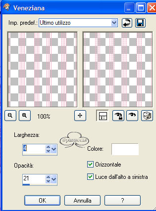 Effetti>Effetti di trama>Veneziana con questi settaggi: