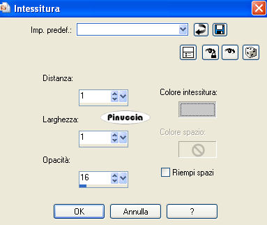 15. Effetti>Effetti di trama>Intessitura, con i seguenti settaggi, colore intessitura #c8c8c8, colore spazio non selezionato.