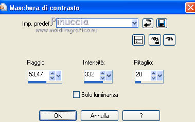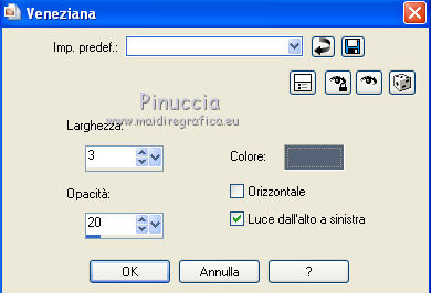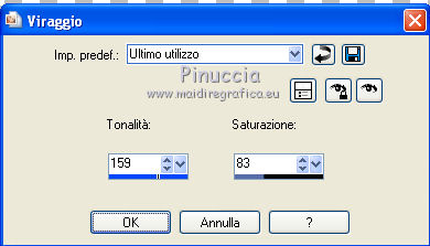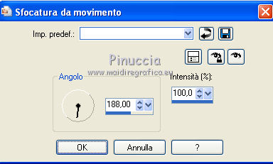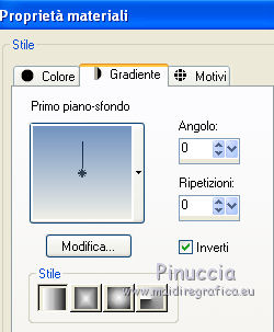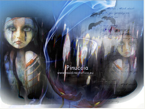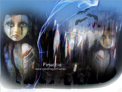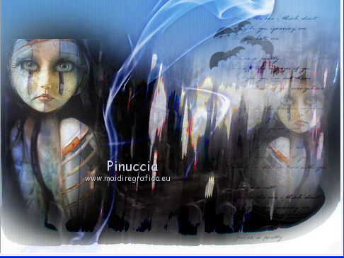 qui puoi trovare qualche risposta ai tuoi dubbi. Se l'argomento che ti interessa non è presente, ti prego di segnalarmelo. Questo tutorial è stato realizzato con PSP X2, ma può essere eseguito anche con le altre versioni di PSP. Per tradurlo, ho usato PSP X. Occorrente: Materiale qui Per i tubes grazie a Yoka, Guismo, NimueLaFee e @nn. 1. Apri una nuova immagine trasparente 800 x 600 pixels, Imposta il colore di primo piano con #7293bf, e il colore di sfondo con #eeeee7. Passa il colore di primo piano a Gradiente lineare: ![]() Riempi l'immagine trasparente con il gradiente.3. Apri il tube "calguismisted91010" e vai a Modifica>Copia. Torna al tuo lavoro e vai a Modifica>Incolla come nuovo livello. Livelli>Duplica. 4. Regola>Tonalità e saturazione>Viraggio. ![]() Livelli>Disponi>Sposta giù. 5. Attiva il livello superiore. Abbassa l'opacità di questo livello al 60%. Livelli>Unisci>Unisci visibile. 6. Regola>Sfocatura>Sfocatura da movimento. ![]() 7. Regola>Messa a fuoco>Maschera di contrasto. ![]() 8. Livelli>Duplica. Cambia la modalità di miscelatura di questo livello in Luce netta, e abbassa l'opacità al 60%. Effetti>Effetti di trama>Veneziana, con il colore #546376. ![]() Regola>Messa a fuoco>Accentua messa a fuoco. 9. Modifica>Incolla come nuovo livello (il tube calguismisted91010" è ancora in memoria). Cambia la modalità di miscelatura di questo livello in Luminanza (esistente), e abbassa l'opacità al 44%. 10. Apri il tube "yoka-MISTED-Faces-Girlie110910" e vai a Modifica>Copia. Torna al tuo lavoro e vai a Modifica>Incolla come nuovo livello. Spostalo a sinistra, come nel mio esempio.Regola>Correzione fotografica in un passaggio. Cambia la modalità di miscelatura di questo livello in Luce netta. Livelli>Duplica, e riporta la modalità di miscelatura di questo livello a Normale. 11. Livelli>Duplica. Immagine>Rifletti. Immagine>Ridimensiona, al 70%, tutti i livelli non selezionato. Spostalo a destra, come nelm io esempio.Abbassa l'opacità di questo livello al 78%. Regola>Correzione fotografica in un passaggio. 12. Apri il tube "GxChic_(09-22-07)_Bats" e vai a Modifica>Copia. Torna al tuo lavoro e vai a Modifica>Incolla come nuovo livello. Immagine>Ridimensiona, al 40%, tutti i livelli non selezionato. Abbassa l'opacità di questo livello al 47%. Sposta il tube in alto a destra, come nel mio esempio.13. Apri il tube "384NLF240808" e vai a Modifica>Copia. Torna al tuo lavoro e vai a Modifica>Incolla come nuovo livello. Immagine>Capovolgi. Immagine>Rifletti. Cambia la modalità di miscelatura di questo livello in Luce netta, e abbassa l'opacità all'85%. Sposta il tube in alto, come nel mio esempio.![]() 14. Apri il tube "@nn_060408_tekst_tdstudio" e vai a Modifica>copia. Torna al tuo lavoro e vai a Modifica>Incolla come nuovo livello. Livelli>Duplica. Posiziona i due testi come nel mio esempio,e cambia la modalità di miscelatura di entrambi i livelli in Luce diffusa. ![]() 15. Apri il tube "Misted_Grape_Flowers_RM-reformado" e vai a Modifica>copia. Torna al tuo lavoro e vai a Modifica>Incolla come nuovo livello. Immaigne>Ruota per gradi - 90 gradi a destra. ![]() Sposta il tube in basso, come nel mio esempio.Abbassa l'opacità di questo livello al 90%. ![]() 16. Apri il file di testo "Halloween texto" e vai a Modifica>copia. Torna al tuo lavoro e vai a Modifica>Incolla come nuovo livello. Spostalo in basso a sinistra, come nel mio esempio.Cambia la modalità di miscelatura di questo livello in Luce netta. 17, Aggiungi il tuo nome e/o il tuo watermark su un nuovo livello. 18. Immagine>Aggiungi bordatura, 1 pixel, simmetriche, con il colore bianco. Immagine>Aggiungi bordatura, 6 pixels, simmetriche, con il colore #415d7c. 19. Livelli>Duplica. Cambia la modalità di miscelatura di questo livello in Luce netta, e abbassa l'opacità al 30%. 20. Hai finito. Salva in formato jpg. ![]() Se hai problemi o dubbi, o trovi un link non funzionante, o anche soltanto per un saluto, scrivimi 17 Gennaio 2011 |