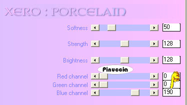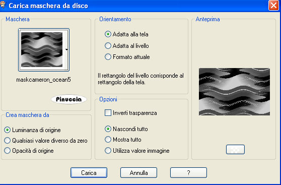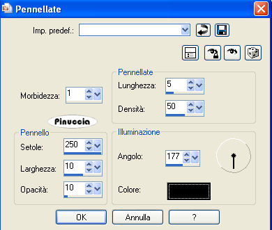 qui puoi trovare qualche risposta ai tuoi dubbi. Se l'argomento che ti interessa non è presente, ti prego di segnalarmelo. Questo tutorial è stato realizzato con PSP X2, ma può essere eseguito anche con le altre versioni di PSP. Per tradurlo, ho usato PSP X. Occorrente: Materiale qui Grazie Yoka per il tube, Il resto del materiale è di Susana. Filtri: Xero - Porcelain qui Metti le maschere maskcameron_ocean5 e sq_parquet_floor nella cartella Maschere. Metti il pennello nella cartella Pennelli. Per usare questo pennello l'ho esportato (vedi qui gli appunti sui pennelli) 1. Apri Sus-Textura. Questa sarà la base del tuo lavoro. 2. Livelli>Nuovo livello raster. Imposta il colore di primo piano con #fceee5. Riempi il livello con il colore di primo piano.3. Livelli>Carica/Salva maschera>Carica maschera da disco. Cerca e carica la maschera sg_parquet-floor, con i seguenti settaggi: ![]() Livelli>Unisci>Unisci gruppo. 4. Regola>Messa a fuoco>Accentua messa a fuoco. 5. Livelli>Nuovo livello raster. Riempi il livello con il colore di primo piano.6. Livelli>Carica/Salva maschera>Carica maschera da disco. Cerca e carica la maschera maskcameron_ocean5, con i seguenti settaggi: ![]() Livelli>Unisci>Unisci gruppo. 7. Regola>Messa a fuoco>Metti a fuoco. 8. Regola>Messa a fuoco>Accentua messa a fuoco. 9. Apri il tube "Yoka-Photos-Lady-crying-040209" e vai a Modifica>copia. Torna al tuo lavoro e vai a Modifica>Incolla come nuovo livello. Spostalo a destra, come nel mio esempio.10. Immagine>Ridimensiona, al 70%, tutti i livelli non selezionato. 11. Effetti>Effetti 3D>Sfalsa ombra, con i seguenti settaggi, colore dell'ombra su un nuovo livello #e6640e. ![]() Attiva il livello del tube. Livelli>Unisci>Unisci giù (per unire l'ombra e il tube). Nella paletta dei livelli cambia la modalità di miscelatura di questo livello in Sovrapponi, e abbassa l'opacità al 65%. 12. Livelli>Duplica. Immagine>Rifletti. 13. Riporta l'opacità di questo livello duplicato al 100%. 14. Di nuovo Livelli>Duplica. Immagine>Rifletti. Porta l'opacità di miscelatura di questo livello a Normale, e abbassa l'opacità all'80%. ![]() 15. Regola>Rimozione disturbo in un passaggio. 16. Regola>Messa a fuoco>Metti a fuoco. 17. Apri il file di testo "Sus-TextLies" e vai a Modifica>copia. Torna al tuo lavoro e vai a Modifica>Incolla come nuovo livello. Spostalo a sinistra, come nel mio esempio.18. Livelli>Nuovo livello raster. Attiva lo strumento Pennello ![]() cerca e seleziona il pennello "agi_wb_sweetlies", imposta il colore di primo piano con il nero (#000000), e applica il pennello cliccando con il tasto sinistro del mouse per usare il colore nero. Clicca più di una volta, a tuo piacimento (nel mio esempio ho cliccato due volte). 19. Effetti>Effetti 3D>Sfalsa ombra, con i seguenti settaggi, colore nero (attenzione, togli la spunta a ombra su nuovo livello). ![]() 20. Aggiungi il tuo nome e/o il tuo copyright. Adesso farai la cornice. 21. Immagine>Aggiungi bordatura, 2 pixels, simmetriche, con il colore #c66e2e. 22. Immagine>Aggiungi bordatura, 10 pixels, simmetriche, con il colore #ffffff. 23. Immagine>Aggiungi bordatura, 15 pixels, simmetriche, con il colore #c66e2e. 24. Seleziona questo bordo con la bacchetta magica , sfumatura e tolleranza 0:![]() 25. Effetti>Effetti tecniche di disegno>Pennellate, con il colore #000000. ![]() 26. Effetti>Effetti 3D>Smusso a incasso, con i seguenti settaggi: ![]() Selezione>Deseleziona. 27. Immagine>Aggiungi bordatura, 10 pixels, simmetriche, con il colore #ffffff. 28. Immagine>Aggiungi bordatura, 2 pixels, simmetriche, con il colore #c66e2e. 29. Effetti>Plugins>Xero - Porcelain, con i seguenti settaggi: ![]() 30. File>Esporta>Ottimizzazione JPEG: compressione 20. ![]() ![]() Se hai problemi o dubbi, o trovi un link non funzionante, o anche soltanto per un saluto, scrivimi 18 Febbraio 2009 |