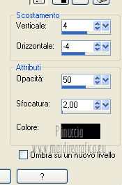 qui puoi trovare qualche risposta ai tuoi dubbi. Se l'argomento che ti interessa non è presente, ti prego di segnalarmelo. Per tradurre questo tutorial ho usato PSP X. Occorrente: Materiale qui Il tube della donna è di Crealine. Filtri in caso di dubbi, ricorda di consultare la mia sezione filtri qui Xero - Porcelain qui ![]() 1. Apri il tube "back". Questa sarà la base del tuo lavoro. Apri il tube "back2" e vai a Modifica>Copia. Torna alla tua base e vai a Modifica>Incolla come nuovo livello. Sposta il tube sul bordo.![]() 2. Apri il tube "overlay" e vai a Modifica>Copia. Torna al tuo lavoro e vai a Modifica>Incolla come nuovo livello. Lascialo come sta. 3. Apri il tube "blokjes" e vai a Modifica>Copia. Torna al tuo lavoro e vai a Modifica>Incolla come nuovo livello. Posizionalo correttamente al centro.![]() 4. Apri il tube "bloemetjes" e vai a Modifica>Copia. Torna al tuo lavoro e vai a Modifica>Incolla come nuovo livello. Posizionalo correttamente al centro dei blocchi.![]() 5. Apri il tube "tekst" e vai a Modifica>Copia. Torna al tuo lavoro e vai a Modifica>Incolla come nuovo livello. Posizionalo il testo come nell'esempio.![]() 6. Apri il tube "aangepaste vrouw" e vai a Modifica>Copia. Torna al tuo lavoro e vai a Modifica>Incolla come nuovo livello. Posizionalo al centro dell'immagine.7. Effetti>Effetti 3D>Sfalsa ombra. ![]() 8. Apri il tube "kuikentje's" e vai a Modifica>Copia. Torna al tuo lavoro e vai a Modifica>Incolla come nuovo livello. Sposta il tube in basso.![]() 10. Livelli>Unisci>Unisci tutto. Regola>Messa a fuoco>Accentua messa a fuoco. 11. Effetti>Plugins>Xero - Porcelain. ![]() 12. Firma il tuo lavoro e salva in formato jpg. ![]() Se hai problemi o dubbi, o trovi un link non funzionante, o anche soltanto per un saluto, scrivimi. 29 Marzo 2013 |