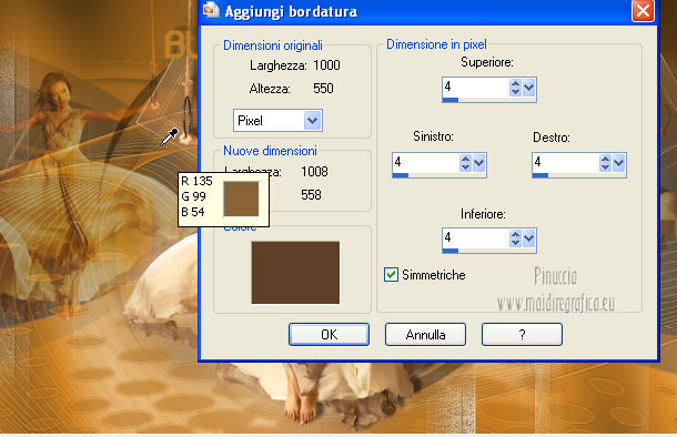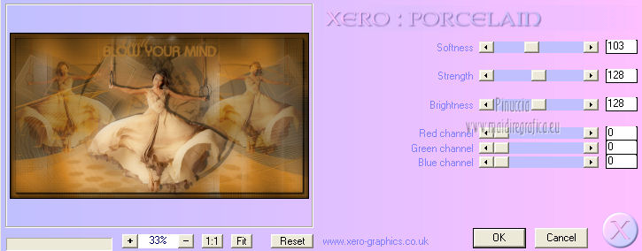 qui puoi trovare qualche risposta ai tuoi dubbi. Se l'argomento che ti interessa non è presente, ti prego di segnalarmelo. Per tradurre questo tutorial ho usato PSP X. Occorrente: Materiale qui Il tube della donna è di ClaudiaViza. Filtri in caso di dubbi, ricorda di consultare la mia sezione filtri qui Xero - Porcelain qui AAA Frames - Foto Frame qui ![]() 1. Apri una nuova immagine trasparente 1000 x 550 pixels. 2. Selezione>Seleziona tutto. Apri il tube "back" e vai a Modifica>Copia. Torna al tuo lavoro e vai a Modifica>Incolla nella selezione. Selezione>Deseleziona. 3. Apri il tube "back 2" e vai a Modifica>Copia. Torna al tuo lavoro e vai a Modifica>Incolla come nuovo livello. Lascialo come sta. 4. Apri il tube "back 3" e vai a Modifica>Copia. Torna al tuo lavoro e vai a Modifica>Incolla come nuovo livello. Lascialo come sta. 5. Apri il tube "fractal" e vai a Modifica>Copia. Torna al tuo lavoro e vai a Modifica>Incolla come nuovo livello. Lascialo come sta. 6. Apri il tube "boord" e vai a Modifica>Copia. Torna al tuo lavoro e vai a Modifica>Incolla come nuovo livello. Spostalo contro il bordo superiore.![]() 7. Apri il tube "boompje" e vai a Modifica>Copia. Torna al tuo lavoro e vai a Modifica>Incolla come nuovo livello. Spostalo al centro dell'immagine.Cambia la modalità di miscelatura di questo livello in Moltiplica, e abbassa l'opacità al 68%. 8. Apri il tube "deco" e vai a Modifica>Copia. Torna al tuo lavoro e vai a Modifica>Incolla come nuovo livello. Lascialo come sta. 9. Apri il tube "blokjes" e vai a Modifica>Copia. Torna al tuo lavoro e vai a Modifica>Incolla come nuovo livello. Cambia la modalità di miscelatura di questo livello in Schiarisci. Sposta il tube in alto, come nell'esempio.![]() 10. Apri il tube "spotjes" e vai a Modifica>Copia. Torna al tuo lavoro e vai a Modifica>Incolla come nuovo livello. Spostalo in alto, contro il bordo.11. Apri il tube "vrouw1" e vai a Modifica>Copia. Torna al tuo lavoro e vai a Modifica>Incolla come nuovo livello. Spostalo a destra.Cambia la modalità di miscelatura di questo livello in Luce netta, e abbassa l'opacità al 62%. 12. Livelli>Duplica. Immagine>Rifletti. 13. Apri il tube "deco 2" e vai a Modifica>Copia. Torna al tuo lavoro e vai a Modifica>Incolla come nuovo livello. Lascialo come sta. 14. Apri il tube "tubeclaudiaviza-mujer291" e vai a Modifica>Copia. Torna al tuo lavoro e vai a Modifica>Incolla come nuovo livello. Spostalo al centro.![]() 15. Livelli>Duplica. Attiva il livello sottostante dell'originale. Regola>Sfocatura>Sfocatura gaussiana - raggio 30. ![]() 16. Attiva il livello superiore dell'originale. Effetti>Effetti 3D>Sfalsa ombra. ![]() 17. Apri il tube "texst" e vai a Modifica>Copia. Torna al tuo lavoro e vai a Modifica>Incolla come nuovo livello. Spostalo in alto al centro.18. Immagine>Aggiungi bordatura, 4 pixels, simmetriche, con un colore scuro scelto dall'immagine. passando il mouse sull'immagine, appare l'icona del contagocce, quando hai scelto il colore, clicca con il tasto sinistro del mouse per impostarlo. ![]() 19. Effetti>Plugins>AAA Frames - Foto Frame. ![]() 20. Apri il tube "rand" e vai a Modifica>Copia. Torna al tuo lavoro e vai a Modifica>Incolla come nuovo livello. Lascialo come sta. 21. Effetti>Plugins>Xero - Porcelain. ![]() ![]() Le vostre versioni. Grazie ![]() Olimpia ![]() Se hai problemi o dubbi, o trovi un link non funzionante, o anche soltanto per un saluto, scrivimi. 21 Gennaio 2013 |