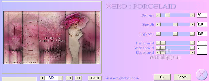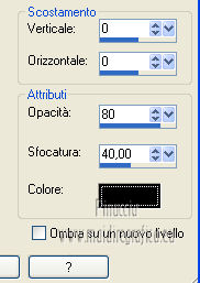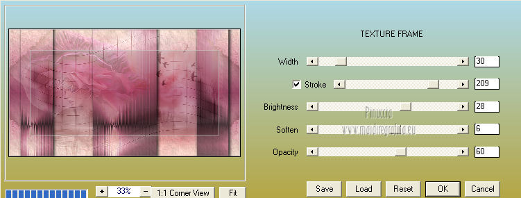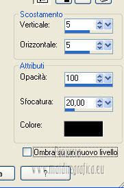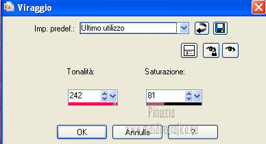 qui puoi trovare qualche risposta ai tuoi dubbi. Se l'argomento che ti interessa non è presente, ti prego di segnalarmelo. Per tradurre questo tutorial ho usato PSP X. Occorrente: Materiale qui I tubes usati sono di Paulina, CorinneVicaire, Athenais, e Maxou. Filtri in caso di dubbi, ricorda di consultare la mia sezione filtri qui Xero - Porcelain qui AAA Frames - Texture Frame qui ![]() 1. Apri una nuova immagine trasparente 1000 x 550 pixels. 2. Selezione>Seleziona tutto. Apri il tube "back" e vai a Modifica>Copia. Torna al tuo lavoro e vai a Modifica>Incolla nella selezione. Selezione>Deseleziona. 3. Apri il tube "overlay" e vai a Modifica>Copia. Torna al tuo lavoro e vai a Modifica>Incolla come nuovo livello. Lascialo come sta. (il tube ha la modalità di miscelatura Luce diffusa, opacità 49). 4. Apri il tube Mist corinne.vicaire_paysage_04.03.11 06 e vai a Modifica>Copia. Torna al tuo lavoro e vai a Modifica>Incolla come nuovo livello. Spostalo un po' più a destra.per il mio esempio ho cambiato la modalità di miscelatura in Luce diffusa ![]() 5. Apri il tube PaulinaDesignWomanpinkhat2010©hoofd e vai a Modifica>Copia. Torna al tuo lavoro e vai a Modifica>Incolla come nuovo livello. Spostalo a sinistra.Abbassa l'opacità di questo livello al 28%. ![]() 6. Apri il tube element-0-athe-tuto-aurora e vai a Modifica>Copia. Torna al tuo lavoro e vai a Modifica>Incolla come nuovo livello. Lascialo come sta. Imposta la modalità di miscelatura di questo livello in Scurisci, e abbassa l'opacità all'80%. per il mio esempio ho aggiunto: Regola>Tonalità e saturazione>Viraggio. ![]() Effetti>Effetti 3D>Sfalsa ombra. ![]() 7. Apri il tube deco-celia e vai a Modifica>Copia. Torna al tuo lavoro e vai a Modifica>Incolla come nuovo livello. Cambia la modalità di miscelatura in Luce diffusa. ![]() 8. Livelli>Unisci>Unisci visibile. Effetti>Plugins>AAA Frames - Texture Frame. ![]() 9. Apri il tube PaulinaDesignWomanpinkhat2010© e vai a Modifica>Copia. Torna al tuo lavoro e vai a Modifica>Incolla come nuovo livello. 10. Immagine>Ridimensiona, all'80%, tutti i livelli non selezionato. ![]() 11. Spostalo a destra.![]() 12. Livelli>Duplica, e attiva il livello sottostante dell'originale. Regola>Sfocatura>Sfocatura gaussiana - raggio 30. ![]() 13. Attiva il livello superiore della copia. Effetti>Effetti 3D>Sfalsa ombra. ![]() per il mio esempio ho usato questi settaggi ![]() 14. Apri il tube wordart e vai a Modifica>Copia. Torna al tuo lavoro e vai a Modifica>Incolla come nuovo livello. Lascialo al centro dell'immagine. 15. Effetti>Effetti 3D>Sfalsa ombra. ![]() 16. Aggiungi il tuo nome e/o il tuo watermark su un nuovo livello. 17. Immagine>Aggiungi bordatura, 2 pixels, simmetriche, con il colore #823351. 18. Apri il tube flowers_fushia_tubed_by_thafs e vai a Modifica>Copia. Torna al tuo lavoro e vai a Modifica>Incolla come nuovo livello. Spostalo in basso a sinistra.Cambia la modalità di miscelatura di questo livello in Filtra, e abbassa l'opacità al 60%. ![]() 19. Livelli>Unisci>Unisci tutto. Regola>Messa a fuoco>Accentua messa a fuoco. 20. Effetti>Plugins>Xero - Porcelain ![]() Salva in formato jpg. ![]() Se hai problemi o dubbi, o trovi un link non funzionante, o anche soltanto per un saluto, scrivimi. 28 Febbraio 2013 |