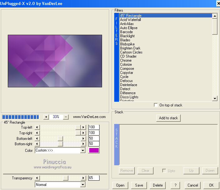 9. Effetti>Plugins>Vanderlee - unplugged X - 45° Rectangle colore #c000c0.