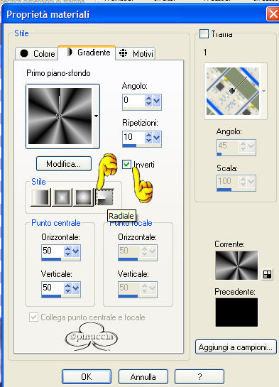 Crea un gradiente per il primo piano, radiale, angolo 0, ripetizioni 10, inverti selezionato.