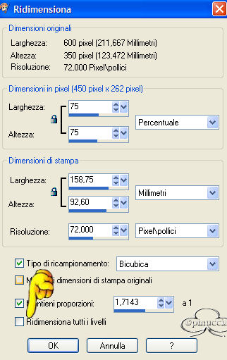 Immagine>Ridimensiona del 75% - bicubico (tutti i livelli non selezionato). Il ridimensionamento si riferisce al tube fornito per il tutorial. Se usi altri tubes, il ridimensionamento dipende dal tube usato.