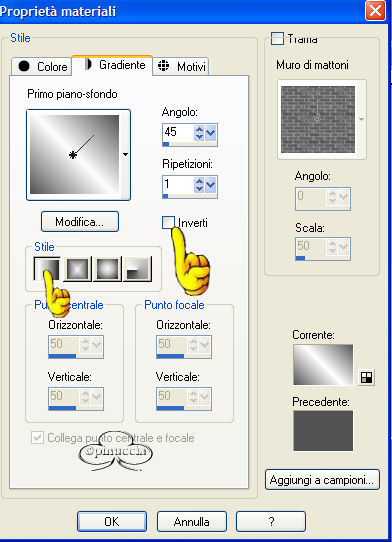 Crea un gradiente lineare, angolo 45, ripetizioni 0.