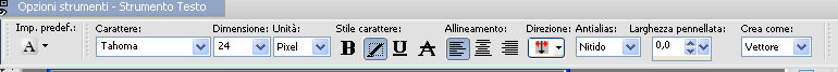 scegli un font; per l'esempio font Tahoma, 24 pixels, crenatura 100, Tracciamento 1000
