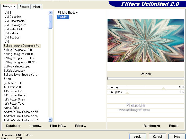 4. Effetti>Plugins>Filters Unlimited 2.0 - &<Background Designer IV> - @Splish, con i settaggi standard.