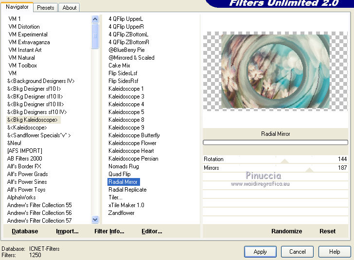 8. Effetti>Plugins>Filters Unlimited 2.0 - &<Bkg Kaleidoscope> - Radial Mirror, con i settaggi standard.