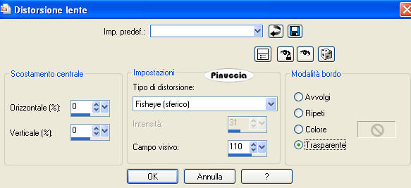 8. Effetti>Effetti di distorsione>Distorsione lente, con i seguenti settaggi: