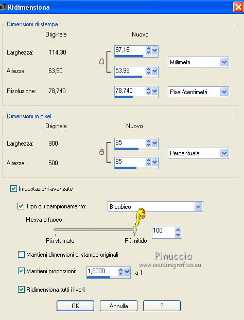 Immagine>Ridimensiona, all'85%, tutti i livelli selezionato, Messa a fuoco 100
