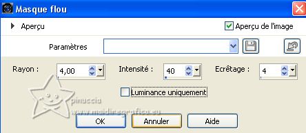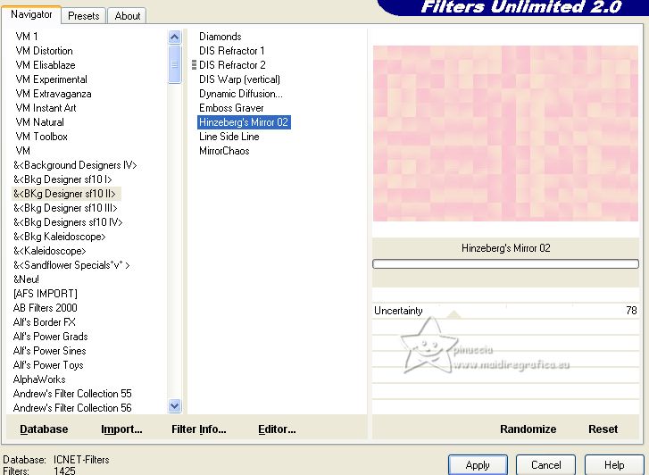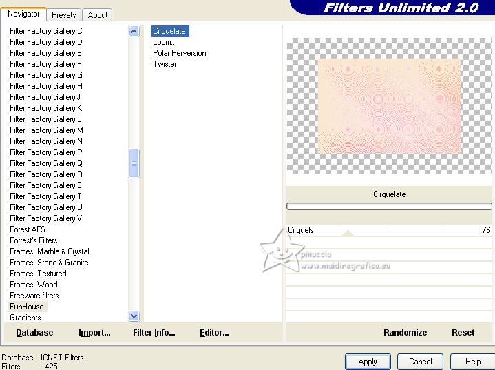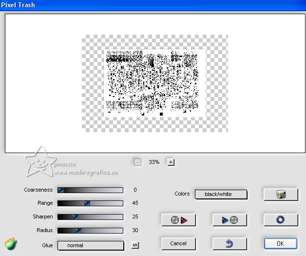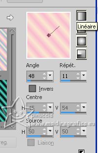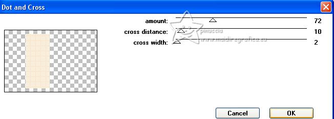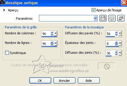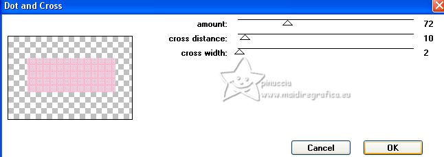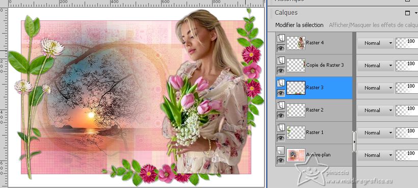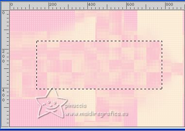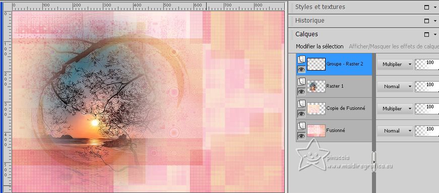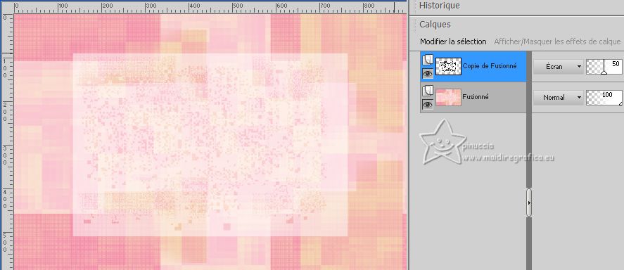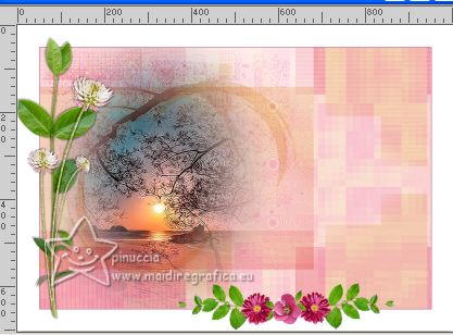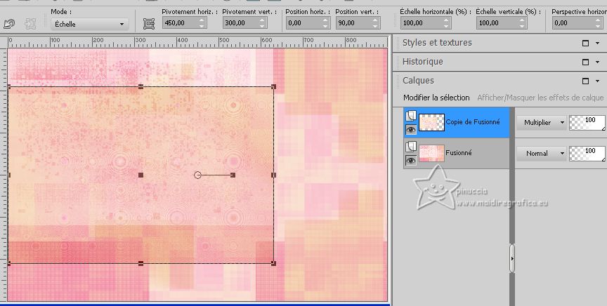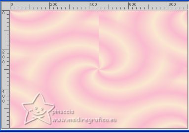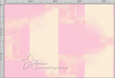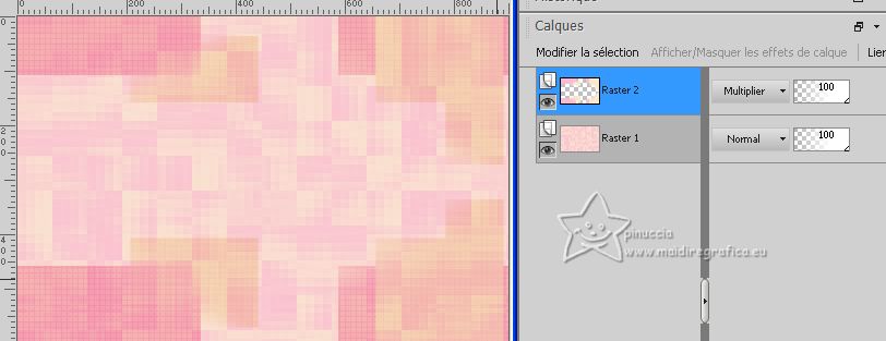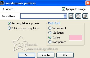 Ce tutoriel a été créé avec PSPX21Ultimate et traduit avec PSPX7 mais il peut également être exécuté avec les autres versions. Suivant la version utilisée, vous pouvez obtenir des résultats différents. Depuis la version X4, la fonction Image>Miroir a été remplacée par Image>Renverser horizontalement, et Image>Renverser avec Image>Renverser verticalement . Dans les versions X5 et X6, les fonctions ont été améliorées par la mise à disposition du menu Objets. Avec la nouvelle version X7, nous avons encore Image>Miroir et Image>Renverser/Retourner, mais avec nouvelles différences. Voir les détails à ce sujet ici Certaines dénominations ont changées entre les versions de PSP. Les plus frequentes dénominations utilisées: ![]() Vos versions ici![]() Nécessaire pour réaliser ce tutoriel: ![]() Scrap (ici les liens vers les sites des créateurs de tubes) Modules Externes: consulter, si nécessaire, ma section des filtres ici Filters Unlimited 2.0 ici &<Bkg Designer sf10II> - Hinzeberg's Mirror 2 (à importer dans Unlimited) ici Penta.com - Dot and Cross ici Flaming Pear - Pixel Trash ici Funhouse - Cirquelate ici Eye Candy 4000 ici Filtres Funhouse et Penta.com peuvent être utilisés seuls ou importés dans Filters Unlimited. voir comment le faire ici). Si un filtre est fourni avec cette icône, ![]() en fonction des couleurs utilisées, vous pouvez changer le mode mélange et l'opacité des calques. Dans les plus récentes versions de PSP, vous ne trouvez pas le dégradé d'avant plan/arriére plan ou Corel_06_029. Vous pouvez utiliser le dégradé des versions antérieures. Ici le dossier Dégradés de CorelX. ![]() Placer le pinceau dans le dossier Pinceaux. Attention, le pinceau se compose de deux files qui on ne doit séparer. Consulter, si vous voulez, les notes sur les pinceaux ici Placer les sélections dans le dossier Sélections. Ouvrir le masque dans PSP et le minimiser avec le reste du matériel. Couleurs utilisées ![]() 1. Placer en avant plan la couleur #f9bbcf, et en arrière plan la couleur #f9e9d0 ![]() Préparer en avant plan un dégradé de premier plan/arrière plan, style Linéaire. ![]() 2. Ouvrir une nouvelle image transparente 900 x 600 pixels. Remplir l'image transparente du dégradé.3. Effets>Effets de distorsion>Coordonnées polaires - couleur d'avant plan #f9bbcf. ![]() 4. Effets>Effets d'image>Mosaïque sans jointures, par défaut. ![]() Vous devriez avoir ceci ![]() 5. Réglage>Flou>Flou gaussien - rayon 20. ![]() 6. Effets>Modules Externes>Filters Unlimited 2.0 - &<Bkg Designer sf10II> - Hinzeberg's Mirror 2, par défaut. ![]() 7. Calques>Nouveau calque raster. Sélections>Charger/Enregistrer une sélection>Charger à partir du disque. Chercher et charger la sélection CAD_sel_AOMM_rosa ![]() Placer en avant plan la Couleur. Remplir la sélection avec la couleur d'avant plan #f9bbcf.Sélections>Désélectionner tout. 8. Effets>Modules Externes>Penta.com - Dot and Cross, par défaut. ![]() 9. Calques>Nouveau calque raser. Sélections>Charger/Enregistrer une sélection>Charger à partir du disque. Chercher et charger la sélection CAD_sel_AOMM_amarillo ![]() Remplir la sélection avec la couleur d'arrière plan #f9e9d0.Sélections>Désélectionner tout. 10. Effets>Modules Externes>Penta.com - Dot and Cross, comme précédemment. ![]() 11. Calques>Fusionner>Fusionner le calque de dessous. 12. Effets>Effets d'image>Mosaïque sans jointures, par défaut. ![]() Vous devriez avoir ceci ![]() 13. Sélections>Charger/Enregistrer une sélection>Charger à partir du disque. Chercher et charger à nouveau la sélection CAD_sel_AOMM_rosa ![]() Presser CANC sur le clavier ![]() ![]() Sélections>Désélectionner tout. 14. Placer le calque en mode Multiplier. ![]() 15. Calques>Fusionner>Calques visibles. 16. Calques>Dupliquer. Image>Redimensionner, à 70%, redimensionner tous les calques décoché. 17. Effets>Modules Externes>Flaming Pear - Pixel Trash 18. Placer le calque en mode Écran et réduire l'opacité à 50%. ![]() 19. Objets>Aligner>Haut. Objets>Aligner>Gauche, ou avec l'outil Sélecteur ![]() et placer Position horiz. et vert.: 0,00 ![]() ![]() 20. Calques>Fusionner>Calques visibles. 21. Calques>Dupliquer. Image>Redimensionner, à 70%, redimensionner tous les calques décoché. 22. Effets>Modules Externes>Filters Unlimited 2.0 - Funhouse - Cirquelate. ![]() 23. Placer le calque en mode Multiplier. Touche K pour activer l'outil Sélecteur ![]() et Placer Position horiz.: 0,00 et garder Position vert.: 90,00. ![]() 24. Ouvrir le tube vvs-paysagem0544 ![]() Édition>Copier. Revenir sur votre travail et Édition>Coller comme nouveau calque. Image>Redimensionner, à 70%, redimensionner tous les calques décoché. Placer Position horiz.: 0,00 et garder Position vert.: -58,00. ![]() Touche M pour désélectionner l'outil. 25. Calques>Nouveau calque raster. Remplir le calque avec la couleur d'arrière plan #f9e9d0.26. Calques>Nouveau calque de masque>A partir d'une image. Ouvrir le menu deroulant sous la fenêtre d'origine et vous verrez la liste des images ouvertes. Sélectionner le masque CAD_mascara_001. ![]() Calques>Fusionner>Fusionner le groupe. Placer le calque en mode Multiplier. ![]() 27. Image>Ajouter des bordures, 2 pixels, symétrique, couleur #d193a3 .Image>Ajouter des bordures, 50 pixels, symétrique, couleur #ffffff. Nous allons ajouter les élémentes du scrap 28. Ouvrir l'élément letiscrap_justetoietmoi_25 ![]() Image>Redimensionner, à 20%, redimensionner tous les calques coché. Réglage>Netteté>Netteté. Édition>Copier. Revenir sur votre travail et Édition>Coller comme nouveau calque. Touche K pour activer l'outil Sélecteur ![]() et placer Position horiz.: 0,00 et Position vert.: 31,00. ![]() Effets>Effets 3D>Ombre portée, couleur noire ![]() Répéter Ombre portée, vertical et horizontal 3. ![]() 29. Ouvrir l'élément letiscrap_justetoietmoi_31 ![]() Image>Redimensionner, à 20%, redimensionner tous les calques coché
