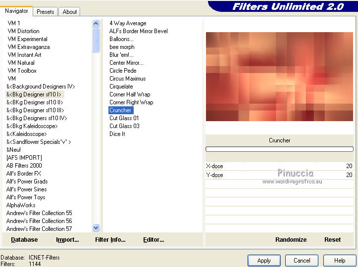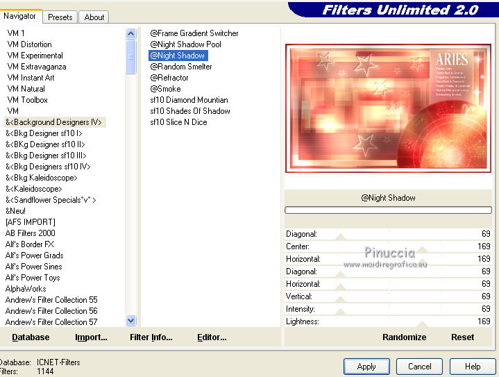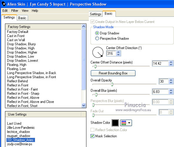 Ce tutoriel a été créé et traduit avec CorelX12, mais il peut également être exécuté avec les autres versions. Suivant la version utilisée, vous pouvez obtenir des résultats différents. Depuis la version X4, la fonction Image>Miroir a été remplacée par Image>Renverser horizontalement, et Image>Renverser avec Image>Renverser verticalement . Dans les versions X5 et X6, les fonctions ont été améliorées par la mise à disposition du menu Objets. Avec la nouvelle version X7, nous avons encore Image>Miroir et Image>Renverser/Retourner, mais avec nouvelles différences. Voir les détails à ce sujet ici Certaines dénominations ont changées entre les versions de PSP. Les plus frequentes dénominations utilisées: ![]() Vos versions ici![]() Nécessaire pour réaliser ce tutoriel: Matériel ici Pour le tube merci Danimage. Le reste du matériel est de Tati (ici les liens vers les sites des créateurs de tubes) Si ce n'est pas facile pour vous de trouver des tubes avec ce thématique, dans le matériel vous trouverez un dossier avec des tatouages. À l'étape 48, j'explique comment les utiliser. Modules Externes: consulter, si nécessaire, ma section des filtres ici Filters Unlimited 2.0 ici &<Bkg Designer sf10I> - Cruncher ici &<Background Designers IV> - @Night Shadow ici Carolaine and Sensibility - CS-Texture, CS-DLines ici Mehdi - Sorting Tiles ici Simple - Offset By 3 ici Graphics Plus - Cross Shadow ici [AFS IMPORT] - sqborder2 ici Alien Skin Eye Candy 5 Impact - Perspective Shadow ici Filtres Simple, Graphcs Plus et [AFS IMPORT] peuvent être utilisés seuls ou importés dans Filters Unlimited. voir comment le faire ici). Si un filtre est fourni avec cette icône, ![]() en fonction des couleurs utilisées, vous pouvez changer le mode mélange et l'opacité des calques. Dans les plus récentes versions de PSP, vous ne trouvez pas le dégradé d'avant plan/arrière plan ou Corel_06_029. Vous pouvez utiliser le dégradé des versions antérieures. Ici le dossier Dégradés de CorelX. Placer le preset En cliquant sur le preset une ou deux fois (selon vos réglages) automatiquement il se placera directement dans le dossier Settings de Alien Skin Eye Candy. pourquoi un ou deux clic voir ici Ouvrir les masques dans PSP et les minimiser avec le reste du matériel. Couleurs utilisées ![]() 1. Placer en avant plan la couleur 1 #7f141a, et en arrière plan la couleur 2 #fab67e. ![]() Préparer en avant plan un dégradé de premier plan/arrière plan, style Linéaire. ![]() 2. Ouvrir TD_Canal_alfa_Aries.pspimage. Fenêtre>Dupliquer ou sur le clavier shift+D pour faire une copie. ![]() Fermer l'original. La copie, qui sera la base de votre travail, n'est pas vide, mais contient les sélections enregistrées sur le canal alpha. Remplir l'image transparente du dégradé.3. Effets>Modules Externes>Mehdi - Sorting Tiles. ![]() 4. Réglage>Flou>Flou radial. ![]() Effets>Effets de bords>Accentuer davantage. 5. Ouvrir le tube TD_Deco1_Aries et Édition>Copier. Revenir sur votre travail et Édition>Coller comme nouveau calque. Placer le calque en mode Recouvrement. 6. Ouvrir le tube TD_Deco2_Aries et Édition>Copier. Revenir sur votre travail et Édition>Coller comme nouveau calque. 7. Touche K sur le clavier pour activer l'outil Sélecteur ![]() et placer Position horiz.: 486,00 et Position vert.: 233,00. ![]() Touche M pour désélectionner l'outil. 8. Placer le calque en mode Lumière douce. ![]() 9. Vous positionner sur le calque de dessous, Raster 2. 10. Placer en arrière plan la couleur 3 #ffffff (garder en avant plan la couleur 1 #7f131a) ![]() Garder en avant plan le dégradé, e changer les réglages en style Radial. ![]() 11. Calques>Nouveau calque raster. Remplir le calque du dégradé.12. Calques>Nouveau calque de masque>A partir d'une image. Ouvrir le menu deroulant sous la fenêtre d'origine et vous verrez la liste des images ouvertes. Sélectionner le masque TD_Mask1_Aries. ![]() Calques>Fusionner>Fusionner le groupe. 13. Sélections>Charger/Enregistrer une sélection>Charger à partir d'un canal alpha. La sélection TD_Aries_Sel1 est déjà disponible. On doit seulement cliquer sur Charger. ![]() 14. Effets>Modules Externes>Carolaine and Sensibility - CS_Texture, par défaut. ![]() Sélections>Désélectionner tout. 15. Calques>Nouveau calque raster. Remplir le calque avec la couleur blanche d'arrière plan #ffffff.16. Calques>Nouveau calque de masque>A partir d'une image. Ouvrir le menu deroulant sous la fenêtre d'origine et sélectionner le masque TD_Mask2_Aries. ![]() Calques>Fusionner>Fusionner le groupe. 17. Effets>Modules Externes>Simple - Offset by 3. Édition>Répéter Offset by 3. 18. Placer le calque en mode Recouvrement. ![]() 19. Vous positionner sur le calque du bas de la pile, Raster 1. 20. Sélections>Charger/Enregistrer une sélection>Charger à partir d'un canal alpha. Ouvrir le menu des Sélections et charger la sélection TD_Aries_Sel2. ![]() Sélections>Transformer la sélection en calque. 21. Image>Miroir. Image>Renverser. Sélections>Désélectionner tout. 22. Effets>Effets de bords>Accentuer. 23. Effets>Modules Externes>Carolaine and Sensibility - CS-DLines, par défaut. ![]() 24. Sélections>Charger/Enregistrer une sélection>Charger à partir d'un canal alpha. Ouvrir le menu des Sélections et charger la sélection TD_Aries_Sel3. ![]() Sélections>Inverser. Presser CANC sur le clavier ![]() Sélections>Désélectionner tout. 25. Vous positionner à nouveau sur le calque du bas de la pile, Raster 1. Calques>Dupliquer. 26. Effets>Modules Externes>Graphics Plus - Cross Shadow. ![]() 27. Effets>Modules Externes>Mehdi - Sorting Tiles. ![]() 28. Effets>Modules Externes>Filters Unlimited 2.0 - &<Bkg Designer sf10I> - Cruncher, par défaut. ![]() 29. Image>Redimensionner, à 55%, redimensionner tous les calques décoché. 30. Effets>Effets d'image>Mosaïque sans jointures. ![]() 31. Sélections>Charger/Enregistrer une sélection>Charger à partir d'un cana