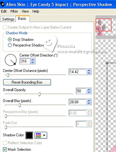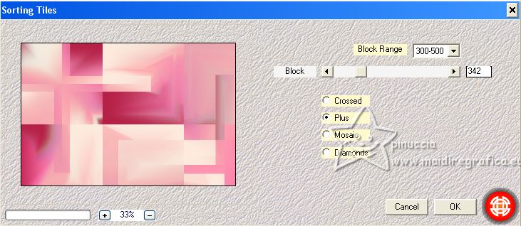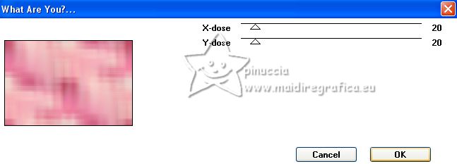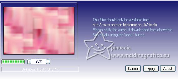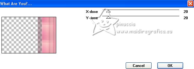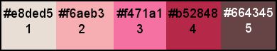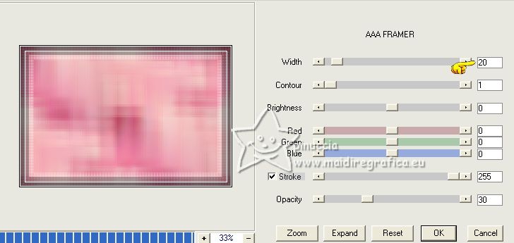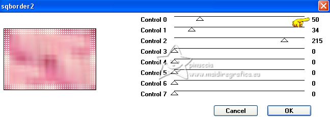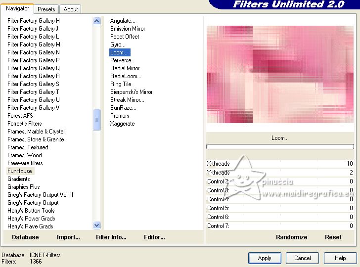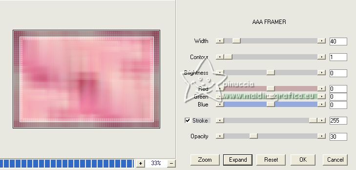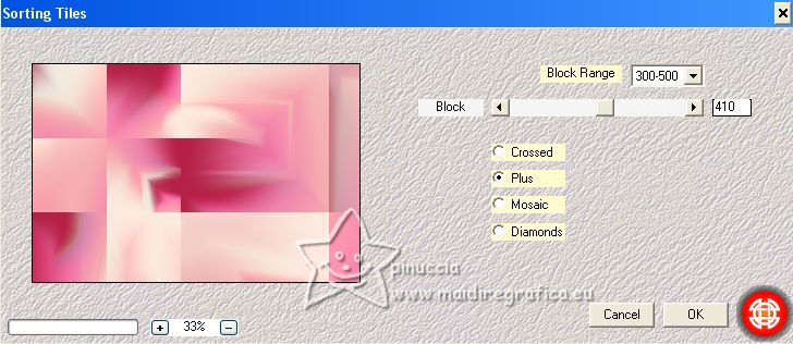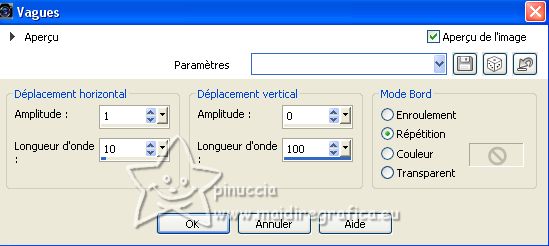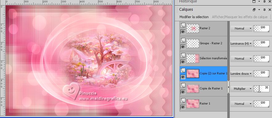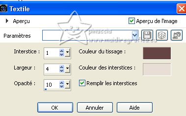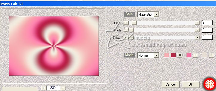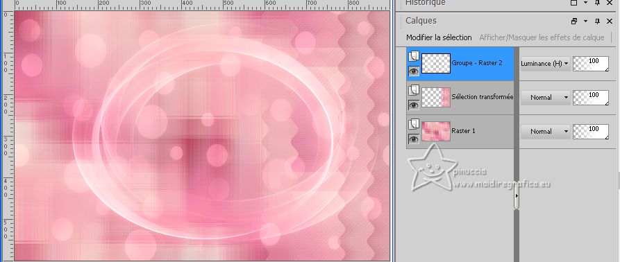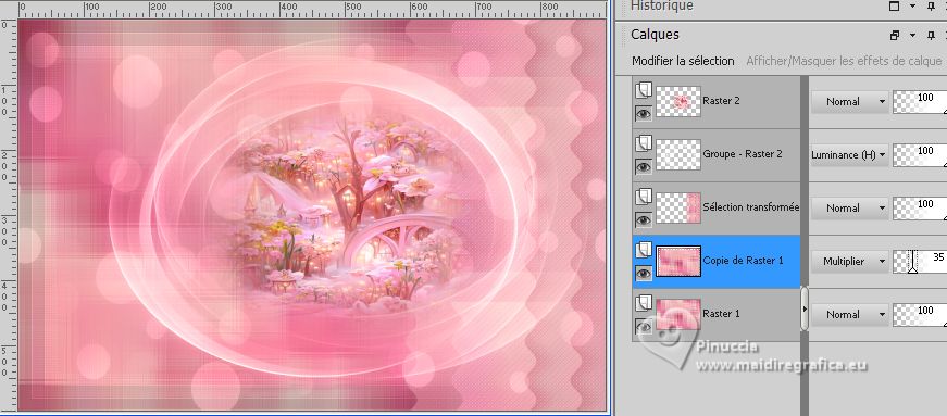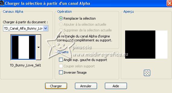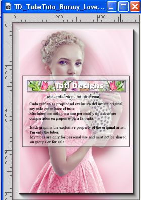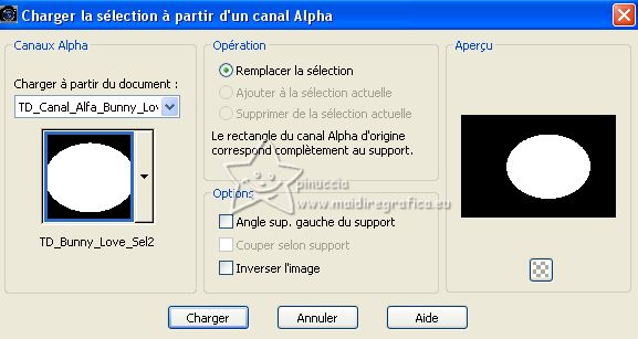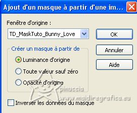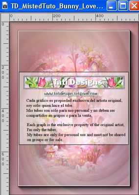 Ce tutoriel a été créé avec PSPX12 et traduit avec PSPX7 mais il peut également être exécuté avec les autres versions. Suivant la version utilisée, vous pouvez obtenir des résultats différents. Depuis la version X4, la fonction Image>Miroir a été remplacée par Image>Renverser horizontalement, et Image>Renverser avec Image>Renverser verticalement . Dans les versions X5 et X6, les fonctions ont été améliorées par la mise à disposition du menu Objets. Avec la nouvelle version X7, nous avons encore Image>Miroir et Image>Renverser/Retourner, mais avec nouvelles différences. Voir les détails à ce sujet ici Certaines dénominations ont changées entre les versions de PSP. Les plus frequentes dénominations utilisées: ![]() Vos versions ici![]() Nécessaire pour réaliser ce tutoriel: Tube à choix (le tube utilisé par l'auteur est sous licence) Matériel ici (ici les liens vers les sites des créateurs de tubes) ![]() Modules Externes: consulter, si nécessaire, ma section des filtres ici Filters Unlimited 2.0 ici Funhouse - Loom ici Simple - Quick Tile ici Simple - Left Right Wrap ici Mehdi - Wavy Lab 1.1 ici Mehdi - Sorting Tiles ici [AFS IMPORT] - sqborder2 ici Toadies - What are you ici AAA Filters - AAA Framer ici Alien Skin Eye Candy 5 Impact - Perspective Shadow ici Filtres Funhouse, Simple AFS IMPORT et Toadies peuvent être utilisés seuls ou importés dans Filters Unlimited. voir comment le faire ici). Si un filtre est fourni avec cette icône, ![]() en fonction des couleurs utilisées, vous pouvez changer le mode mélange et l'opacité des calques. Ouvrir le masque dans PSP et le minimiser avec le reste du matériel. Couleurs utilisées ![]() 1. Placer en avant plan la couleur 4 #b52848, et en arrière plan la couleur 2 #f6aeb3 ![]() 2. Ouvrir TD_Canal_Alfa_bunnylove.pspimage Fenêtre>Dupliquer ou sur le clavier shift+D pour faire une copie. ![]() *** Petite note sur ce gif. Pour créer ce petit gif, comme mes autres gifs, j'ai travaillé. Je me souvien encore le temps perdu pour trouver les deux petits doigts à "poser" sur le clavier. C'est vraiment décourageant d'aller sur un site et de le trouver, très reconnaissable et manipulé avec une autre signature. Si on m'avait demandé l'autorisation de l'utiliser, je ne l'aurais pas refusé. *** Fermer l'original. La copie, qui sera la base de votre travail, n'est pas vide, mais contient les sélections enregistrées sur le canal alpha. 3. Effets>Modules Externes>Mehdi - Wavy Lab 1.1. Ce filtre crée des dégradés avec les couleurs de votre palette: la première est la couleur d'arrière plan, la deuxième est la couleur d'avant plan. Changer les autres deux couleurs créées par le filtre: la troisième avec la couleur 3 #f471a1 ![]() et la quatrième avec la couleur 1 #e8ded5 .![]() 4. Effets>Modules Externes>Mehdi - Sorting Tiles. ![]() 5. Sélections>Charger/Enregistrer une sélection>Charger à partir d'un canal alpha. La sélection TD_BunnyLove_Sel1 est déjà disponible. On doit seulement cliquer sur Charger. ![]() Sélections>Transformer la sélection en calque. Sélections>Désélectionner tout. 6. Fermer ce calque, et vous positionner sur le calque du bas de la pile, Raster 1. 7. Effets>Modules Externes>Mehdi - Sorting Tiles. ![]() 8. Effets>Effets d'image>Mosaïque sans jointures - Bégaiement diagonale. ![]() 9. Effets>Modules Externes>Filters Unlimited 2.0 - Funhouse - Loom, par défaut. ![]() 10. Effets>Modules Externes>Simple - Left Right Wrap. 11. Effets>Modules Externes>Simple - Quick Tile. ![]() 12. Effets>Modules Externes>Toadies - What are you, par défaut. ![]() Réglage>Netteté>Netteté. 13. Re-ouvrir et vous positionner sur le calque Sélection transformée. Effets>Effets d'image>Mosaïque sans jointures. ![]() 14. Effets>Modules Externes>Toadies - What are you, par défaut. ![]() Note: ne pas oublier que pour le résultat de cet effet, il faut avoir en arrière plan la couleur 2 #f6aeb3 ![]() 15. Effets>Effets de distorsion>Vagues. ![]() 16. Effets>Effets de textures>Textile couleur du tissage: couleur 5 #664345, couleur des interstices: couleur 1 #e8ded5. ![]() 17. Placer en avant plan la couleur #ffffff. Calques>Nouveau calque raster. Remplir le calque avec la couleur #ffffff.18. Calques>Nouveau calque de masque>A partir d'une image. Ouvrir le menu deroulant sous la fenêtre d'origine et vous verrez la liste des images ouvertes. Sélectionner le masque TD_MaskTuto_Bunny_Love ![]() Réglage>Netteté>Netteté. Calques>Fusionner>Fusionner le groupe. 19. Effets>Effets 3D>Ombre portée, couleur #ffffff. ![]() 20. Placer le calque en mode Luminance (héritée). ![]() 21. Sélections>Charger/Enregistrer une sélection>Charger à partir d'un canal alpha. Ouvrir le menu des sélections et charger la sélection TD_BunnyLove_Sel2 ![]() 22. Ouvrir le tube TD_MistedTuto_Bunny_Love ![]() Édition>Copier. Revenir sur votre travail et Édition>Coller dans la sélection. Réglage>Netteté>Netteté. Sélections>Désélectionner tout. 23. Vous positionner sur le calque du bas de la pile, Raster 1. Calques>Dupliquer. 24. Effets>Modules Externes>[AFS IMPORT] - sqborder2. ![]() 25. Effets>Modules Externes>AAA Filters - AAA Framer. ![]() 26. Effets>Modules Externes>AAA Filters - AAA Framer - changer Width avec 20 et ok. ![]() 27. Placer le calque en mode Multiplier et réduire l'opacité à 35%. ![]() 28. Calques>Dupliquer. Placer ce calque en mode Lumière douce et à nouveau l'opacité à 100 ![]() 29. Image>Ajouter des bordures, 1 pixel, symétrique, couleur 5 #664345 ![]() Image>Ajouter des bordures, 3 pixels, symétrique, couleur blanche #ffffff. Image>Ajouter des bordures, 1 pixel, symétrique, couleur 4 #b52848 ![]() Image>Ajouter des bordures, 5 pixels, symétrique, couleur 3 #f471a1 ![]() Image>Ajouter des bordures, 1 pixel, symétrique, couleur 4 #b52848 ![]() Image>Ajouter des bordures, 15 pixels, symétrique, couleur blanche #ffffff. Image>Ajouter des bordures, 1 pixel, symétrique, couleur 4 #