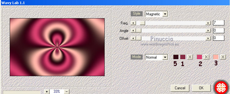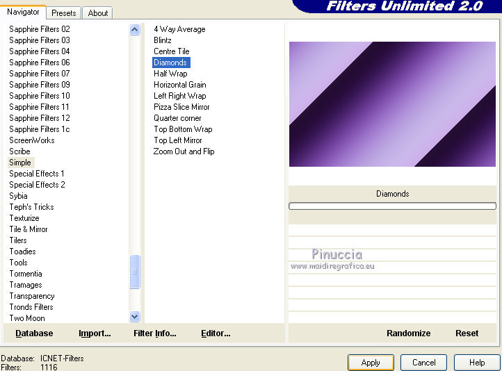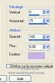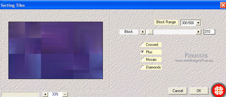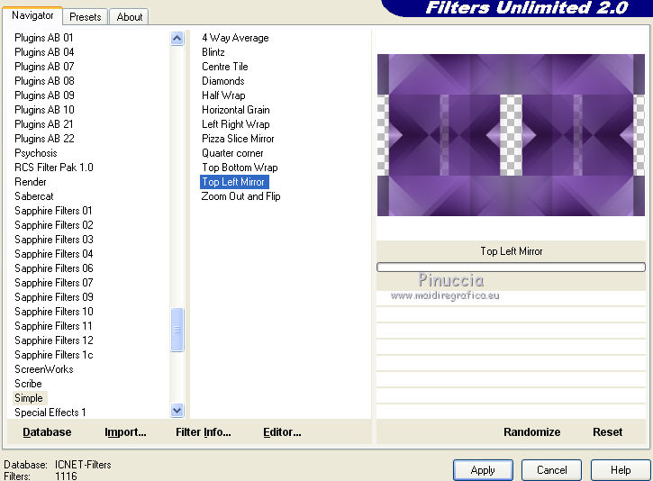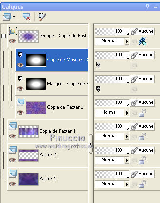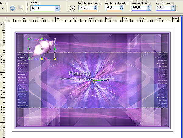 Ce tutoriel a été créé et traduit avec CorelX12, mais il peut également être exécuté avec les autres versions. Suivant la version utilisée, vous pouvez obtenir des résultats différents. Depuis la version X4, la fonction Image>Miroir a été remplacée par Image>Renverser horizontalement, et Image>Renverser avec Image>Renverser verticalement . Dans les versions X5 et X6, les fonctions ont été améliorées par la mise à disposition du menu Objets. Avec la nouvelle version X7, nous avons encore Image>Miroir et Image>Renverser/Retourner, mais avec nouvelles différences. Voir les détails à ce sujet ici Certaines dénominations ont changées entre les versions de PSP. Les plus frequentes dénominations utilisées: ![]() Vos versions ici![]() Nécessaire pour réaliser ce tutoriel: Matériel ici Merci: pour le tube de la femme Beatrice; pour le papillon Kahlan et pour un masque Narah. Fractal trouvé sur le net. Le reste du matériel est de Tati (ici les liens vers les sites des créateurs de tubes) Modules Externes: consulter, si nécessaire, ma section des filtres ici Filters Unlimited 2.0 ici Mehdi - Wavy Lab 1.1 ici Mehdi - Weaver, Sorting Tiles ici Filter Factory Gallery A - Weave ici Graphics Plus - Cross Shadow ici Tramages - Tow the line ici Simple ici Filtres Factory Gallery, Graphics Plus, Tramages et Simple peuvent être utilisés seuls ou importés dans Filters Unlimited. voir comment le faire ici). Si un filtre est fourni avec cette icône, ![]() en fonction des couleurs utilisées, vous pouvez changer le mode mélange et l'opacité des calques. Placer le masque 20-20 dans le dossier Masques. Ouvrir les autres masques dans PSP et les minimiser avec le reste du matériel. Choisir des couleurs en fontion de votre tube. Ci-dessous la palette des couleurs ![]() 1. Placer en avant plan la couleur 2 #a97fc1, et en arrière plan la couleur 1 #7b4da7. 2. Ouvrir une nouvelle image transparente 900 x 550 pixels. 3. Sélections>Sélectionner tout. 4. Ouvrir Imagen_Fractal et Édition>Copier. Revenir sur votre travail et Édition>Coller dans la sélection. **** Note 1: Si vous utilisez des autres couleurs, vous pouvez continuer jusqu'à l'étape 7 et après changer la couleur de l'image avec le filtre Adjust>Variations o avec Réglage>Teinte et Saturation>Coloriser **** Note 2. Lorsque vous faites d'autres versions du tutoriel, notez que la coloration du fractal ne donne pas un bon résultat. Je vous montre l'option que j'ai faite pour les autres versions: Effets>Modules Externes>Mehdi - Wavy Lab 1.1. ![]() Choisissez des couleurs en harmonie avec votre tube et l'une d'elles qui se démarque beaucoup, (comme ma couleur 3), de sorte que plus tard on fait l'effet Kaléidoscope plus perceptible. **** 5. Sélections>Désélectionner tout. 6. Réglage>Flou>Flou radial. ![]() Note: si vous utilisez un autre tube avec d'autres couleurs et la même image fractal, coloriser cette image et continuez avec vos couleurs à partir d'ici 7. Calques>Dupliquer. Image>Miroir. Réduire l'opacité de ce calque à 50%. Calques>Fusionner>Fusionner le calque de dessous. 8. Calques>Nouveau calque raster. Effets>Modules Externes>Mehdi - Wavy Lab 1.1. Ce filtre crée des dégradés avec les couleurs de votre palette: la première est la couleur d'arrière plan (1) #7b4da7, la deuxième est la couleur d'avant plan (2) #a97fc1. Changer les autres deux couleurs créées par le filtre: la troisième avec la couleur 5 #251033 et la dernière avec la couleur 3 #c5b3e7. ![]() pour ma deuxième version ![]() 9. Effets>Modules Externes>Filters Unlimited 2.0 - Simple - Diamonds. ![]() 10. Effets>Modules Externes>Filters Unlimited 2.0 - Simple - Pizza Slice Mirror. ![]() 11. Effets>Effets d'image>Mosaïque sans jointures. ![]() 12. Effets>Effets d'image>Mosaïque sans jointures, côte à côte. ![]() 13. Effets>Modules Externes>Filter Factory Gallery A - Weave. ![]() 14. Effets>Effets d'image>Mosaïque sans jointures. ![]() 15. Calques>Dupliquer. Image>Miroir. Calques>Fusionner>Fusionner le calque de dessous. 16. Effets>Modules Externes>Filters Unlimited 2.0 - Simple - Half Wrap. ![]() 17. Effets>Modules Externes>Filters Unlimited 2.0 - Simple - Top Left Mirror. ![]() 18. Activer l'outil Sélection ![]() (peu importe le type de sélection, parce que avec la sélection personnalisée vous obtenez toujours un rectangle), cliquer sur Sélection personnalisée ![]() et setter ces paramètres. ![]() Presser CANC sur le clavier ![]() Sélections>Désélectionner tout. Effets>Effets de bords>Accentuer. 19. Vous positionner sur le calque du bas de la pile, Raster 1. Calques>Dupliquer. Calques>Agencer>Déplacer vers le haut. 20. Effets>Modules Externes>Mehdi - Weaver. ![]() 21. Effets>Modules Externes>Mehdi - Sorting Tiles. ![]() 22. Image>Redimensionner, à 60%, redimensionner tous les calques décoché. 23. Effets>Effets d'image>Mosaïque sans jointures, côte à côte. ![]() Effets>Effets de bords>Éroder. 24. Effets>Modules Externes>Graphics Plus - Cross Shadow, par défaut. ![]() 25. Vous positionner sur le calque du bas de la pile, Raster 1. Calques>Dupliquer. Calques>Agencer>Placer en haut de la pile. 26. Effets>Effets de réflexion>Kaléïdoscope. ![]() 27. Effets>Modules Externes>Filters Unlimited 2.0 - Image Enhancement - Sunshine. ![]() 28. Calques>Charger/Enregistrer un masque>Charger à partir du disque. Chercher et charger le masque 20-20. ![]() Calques>Dupliquer. ![]() Calques>Fusionner>Fusionner le groupe. 29. Effets>Modules Externes>Filters Unlimited 2.0 - Image Enhancement - Sunshine note: cette étape est optionnelle, elle dépendra des couleurs utilisées. Peut-être vous n'en avez pas besoin, ou vous pouvez jouer avec la valeur de "Intensity". ![]() 30. Effets>Effets de bords>Accentuer. 31. Calques>Nouveau calque raster. Sélection personnalisée ![]() ![]() 32. Effets>Effets 3D>Ombre portée, couleur 3 #c5b3e7. ![]() Sélections>Désélectionner tout. 33. Effets>Effets d'image>Mosaïque sans jointure