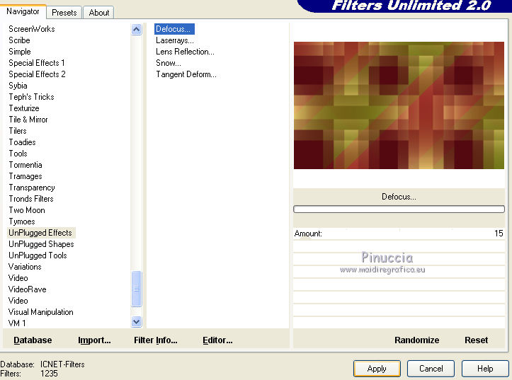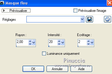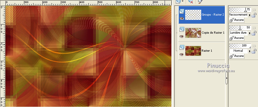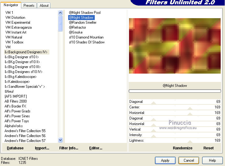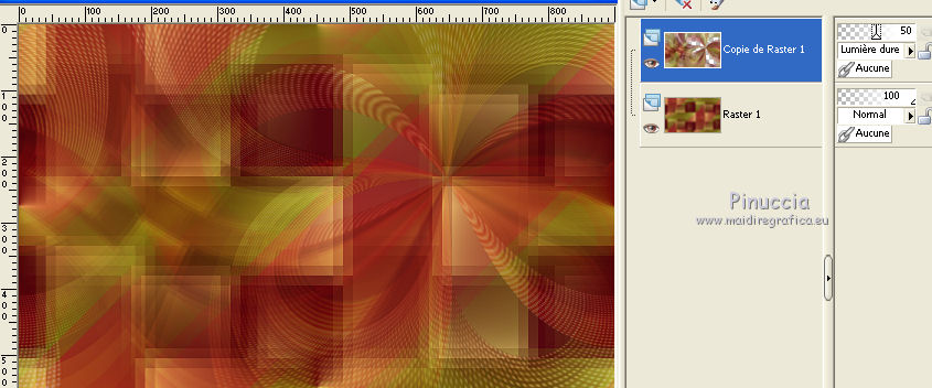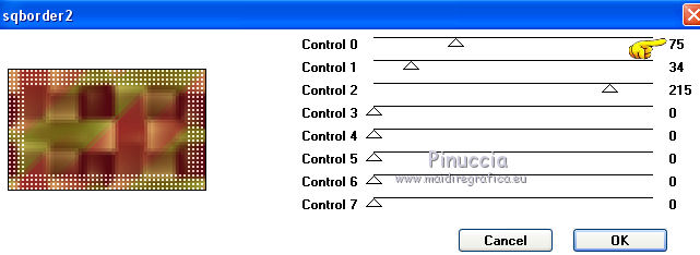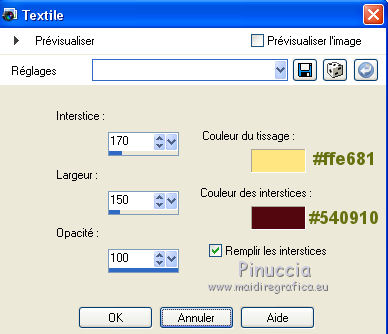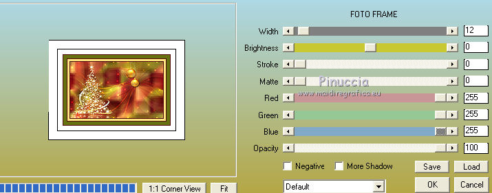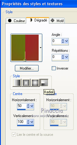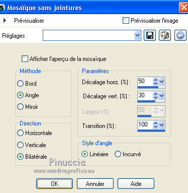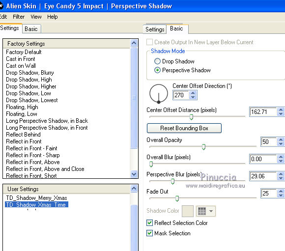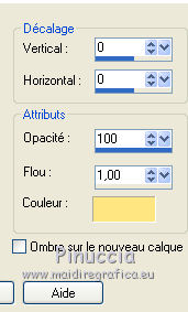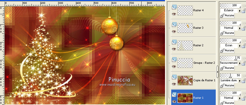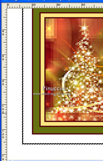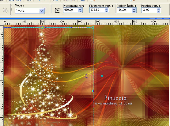 Ce tutoriel a été créé et traduit avec CorelX12, mais il peut également être exécuté avec les autres versions. Suivant la version utilisée, vous pouvez obtenir des résultats différents. Depuis la version X4, la fonction Image>Miroir a été remplacée par Image>Renverser horizontalement, et Image>Renverser avec Image>Renverser verticalement . Dans les versions X5 et X6, les fonctions ont été améliorées par la mise à disposition du menu Objets. Avec la nouvelle version X7, nous avons encore Image>Miroir et Image>Renverser/Retourner, mais avec nouvelles différences. Voir les détails à ce sujet ici Certaines dénominations ont changées entre les versions de PSP. Les plus frequentes dénominations utilisées: ![]() Vos versions iciNécessaire pour réaliser ce tutoriel: Matériel ici Pour les tubes merci Nikita et MMDesignz. Le déco de la fleur n'est pas signé. Le reste du matériel est de Tati (ici les liens vers les sites des créateurs de tubes) Modules Externes: consulter, si nécessaire, ma section des filtres ici Filters Unlimited 2.0 ici Simple - Diamonds ici Unplugged Effects - Defocus ici AFS IMPORT - sqborder 2 ici Flaming Pear - Flexify 2 ici &<Background Designers IV> - @Night Shadow (à importer dans Unlimited) ici Alien Skin Eye Candy 5 Impact - Perspective Shadow ici AAA Frames - Foto Frame ici Filtres Simple, Unplugged e AFS IMPORT peuvent être utilisés seuls ou importés dans Filters Unlimited. voir comment le faire ici). Si un filtre est fourni avec cette icône, ![]() en fonction des couleurs utilisées, vous pouvez changer le mode mélange et l'opacité des calques. Dans les plus récentes versions de PSP, vous ne trouvez pas le dégradé d'avant plan/arrière plan ou Corel_06_029. Vous pouvez utiliser le dégradé des versions antérieures. Ici le dossier Dégradés de CorelX. Placer le preset En cliquant sur le preset une ou deux fois (selon vos réglages) automatiquement il se placera directement dans le dossier Settings de Alien Skin Eye Candy. pourquoi un ou deux clic voir ici Placer les sélections dans le dossier Sélections Placer le masque 2020 dans le dossier Masques. Ouvrir le masque de Narah dans PSP et le minimiser avec le reste du matériel. Couleurs utilisées ![]() 1. Placer en avant plan la couleur #9c2528, et en arrière plan la couleur #66710f. ![]() Préparer en avant plan un dégradé de premier plan/arrière plan (Corel_06_029), style Radial ![]() 2. Ouvrir une nouvelle image transparente 900 x 550 pixels. Remplir l'image transparente du dégradé.3. Effets>Modules Externes>Simple - Diamonds. 4. Effets>Effets de textures>Textile couleur du tissage: #ffe681 couleur des interstices: #540910 ![]() 5. Effets>Modules Externes>Filters Unlimited 2.0 - Unplugged Effects - Defocus ![]() Réglage>Netteté>Netteté. 6. Effets>Effets d'image>Mosaïque sans jointures ![]() 7. Calques>Dupliquer. Effets>Modules Externes>AFS Import - Sqborder2 ![]() 8. Image>Redimensionner, à 80%, redimensionner tous les calques décoché. 9. Effets>Effets d'image>Mosaïque sans jointures ![]() 10. Effets>Modules Externes>Flaming Pear - Flexify 2 ![]() 11. Placer le calque en mode Lumière dure et réduire l'opacité à 50%. ![]() 12. Calques>Nouveau calque raster. Sélections>Charger/Enregistrer une sélection>Charger à partir du disque. Chercher et charger la sélection TD_Christmas_Time_Sel. ![]() Placer en avant plan la couleur #ffe681. Remplir la sélection avec la couleur #ffe681.Sélections>Désélectionner tout. 13. Effets>Modules Externes>Flaming Pear - Flexify 2 ![]() 14. Activer l'outil Sélection ![]() (peu importe le type de sélection, parce que avec la sélection personnalisée vous obtenez toujours un rectangle), cliquer sur Sélection personnalisée ![]() et setter ces paramètres. ![]() 15. Calques>Charger/Enregistrer un masque>Charger à partir du disque. Chercher et charger le masque 2020. ![]() Calques>Fusionner>Fusionner le groupe. Sélections>Désélectionner tout. 16. Placer le calque en mode Recouvrement et réduire l'opacité à 75%. ![]() 17. Ouvrir le tube 13206013504_noel_nikita et copier le calque "ombre". Revenir sur votre travail et Édition>Coller comme nouveau calque. 18. Touche K sur le clavier pour activer l'outil Sélecteur ![]() et placer Position horiz.: -66,00 et Position vert.: 11,00. ![]() 19. Placer le calque en mode Écran. 20. Ouvrir le tube MMDesignz_CHRM389_141109 - Édition>Copier. Revenir sur votre travail et Édition>Coller comme nouveau calque. Image>Redimensionner, à 50%, redimensionner tous les calques décoché. 21. Outil Sélecteur ![]() et placer Position horiz.: 541,00 et Position vert.: 00,00. ![]() Touche M pour désélectionner l'outil. Réglage>Netteté>Netteté. 22. Effets>Effets 3D>Ombre portée, couleur noire. ![]() 23. Ouvrir le tube TD_Deco_Christmas_Time - Édition>Copier. Revenir sur votre travail et Édition>Coller comme nouveau calque. Placer le calque en mode Éclaircir. 24. Vous positionner sur le calque du bas de la pile, Raster 1. ![]() Effets>Modules Externes>Filters Unlimited 2.0 - &<Background Designers IV> - @Night Shadow, par défaut. ![]() 25. Édition>Copie Spéciale>Copier avec fusion. Édition>Coller comme nouvelle image. Sur cette image: Image>Redimensionner, à 15%, redimensionner tous les calques coché. Réglage>Netteté>Netteté. 26. Toujours sur cette image: Image>Ajouter des bordures, 1 pixel, symétrique, couleur 4 #540910. Image>Ajouter des bordures, 3 pixels, symétrique, couleur e #ffe681. Image>Ajouter des bordures, 1 pixel, symétrique, couleur 4 #540910. Image>Ajouter des bordures, 5 pixels, symétrique, couleur e #66710f. Image>Ajouter des bordures, 1 pixel, symétrique, couleur 4 #540910. Image>Ajouter des bordures, 20 pixels, symétrique, couleur #ffffff. 27. Effets>Modules Externes>AAA Frames - Foto Frame. ![]() 28. Activer l'outil Baguette magique , tolérance et progressivité 0,et cliquer sur le bord noir de 1 pixel pour le sélectionner Zoomer si néces