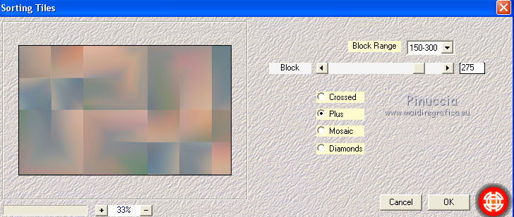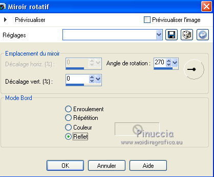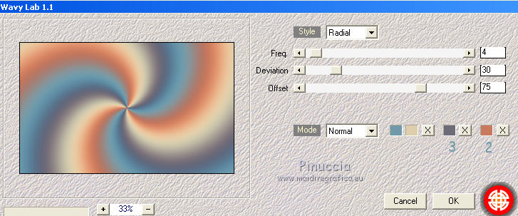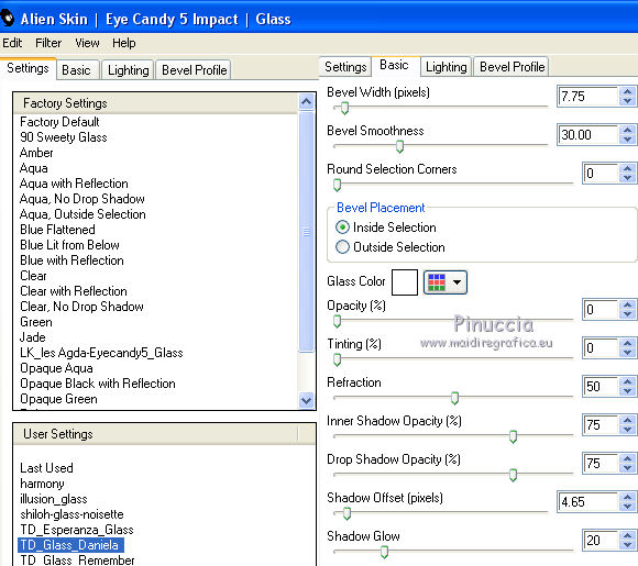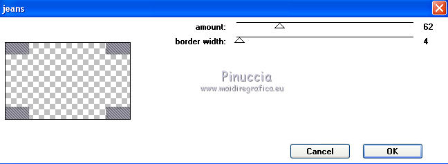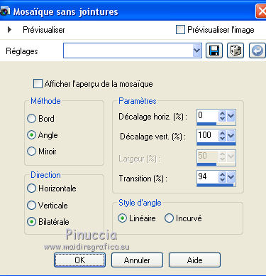 Ce tutoriel a été créé et traduit avec CorelX12, mais il peut également être exécuté avec les autres versions. Suivant la version utilisée, vous pouvez obtenir des résultats différents. Depuis la version X4, la fonction Image>Miroir a été remplacée par Image>Renverser horizontalement, et Image>Renverser avec Image>Renverser verticalement . Dans les versions X5 et X6, les fonctions ont été améliorées par la mise à disposition du menu Objets. Avec la nouvelle version X7, nous avons encore Image>Miroir et Image>Renverser/Retourner, mais avec nouvelles différences. Voir les détails à ce sujet ici Certaines dénominations ont changées entre les versions de PSP. Les plus frequentes dénominations utilisées: ![]() Vos versions ici![]() Nécessaire pour réaliser ce tutoriel: Un tube à choix Le reste du matériel ici Pour le tube que j'ai utilisé merci Luz Cristina. Pour le masque merci Narah. Le reste du matériel est de Tati (ici les liens vers les sites des créateurs de tubes) Modules Externes: consulter, si nécessaire, ma section des filtres ici Filters Unlimited 2.0 ici &<Bkg Designer sf10I> - Cruncher (à importer dans Unlimited) ici Simple - Zoom out and flip ici Mehdi - Wavy Lab 1.1. ici Mehdi - Sorting Tiles 1.1 ici Filter Factory Gallery D - Mirror It ici RCS Filter Pak 1.0 - RCS TripleExposure ici AFS IMPORT - sqborder2 ici Penta.com - Jeans ici VanDerLee - Unplugged-X ici Alien Skin Eye Candy 5 Impact - Glass ici AP [Lines] - Lines SilverLining ici Filtres Simple, Toadies et Penta.com peuvent être utilisés seuls ou importés dans Filters Unlimited. voir comment le faire ici). Si un filtre est fourni avec cette icône, ![]() en fonction des couleurs utilisées, vous pouvez changer le mode mélange et l'opacité des calques. Placer le preset En cliquant sur le preset une ou deux fois (selon vos réglages) automatiquement il se placera directement dans le dossier Settings de Alien Skin Eye Candy. pourquoi un ou deux clic voir ici Placer les sélections dans le dossier Sélections. Ouvrir les masques dans PSP et le minimiser avec le reste du matériel. Choisir des couleurs en fonction de votre tube. Ci-dessous la palette des couleurs ![]() 1. Placer en avant plan la couleur 1 #dfceac, et en arrière plan la couleur 4 #709aa9. ![]() 2. Ouvrir une nouvelle image transparente 900 x 550 pixels. 3. Effets>Modules Externes>Mehdi - Wavy Lab 1.1. Ce filtre crée des dégradés avec les couleurs de votre palette: la première est la couleur d'arrière plan, la deuxième est la couleur d'avant plan. Changer les autres deux couleurs créées par le filtre: la trosième avec la couleur 3 #6e6b79 et la quatrième avec la couleur 2 #c97a5e ![]() 4. Effets>Effets d'image>Mosaïque sans jointures, par défaut. ![]() 5. Réglage>Flou>Flou gaussien - rayon 50. ![]() 6. Effets>Modules Externes>Mehdi - Sorting Tiles. ![]() Effets>Effets de bords>Accentuer. 7. Calques>Dupliquer. Effets>Modules Externes>Filter Factory Gallery D - Mirror It, par défaut. ![]() Placer le calque en mode Recouvrement et réduire l'opacité à 50%. 8. Image>Renverser. Calques>Fusionner>Fusionner le calque de dessous. Calques>Dupliquer. Image>Miroir. Image>Renverser. 9. Effets>Effets de texture>Textile, couleur 3 #6e6b79 ![]() 10. Effets>Effets de réflexion>Miroir rotatif ![]() 11. Activer l'outil Sélection ![]() (peu importe le type de sélection, parce que avec la sélection personnalisée vous obtenez toujours un rectangle), cliquer sur Sélection personnalisée ![]() et setter ces paramètres. ![]() Presser CANC sur le clavier ![]() Sélections>Désélectionner tout. 12. Placer le calque en mode Recouvrement. Effets>Effets de bords>Accentuer. 13. Placer en arrière plan la couleur blanche #ffffff. ![]() Vous positionner sur le calque du bas, Raster 1. 14. Sélections>Charger/Enregistrer une sélection>Charger à partir du disque. Chercher et charger la sélection TD_Daniela_Sel1. ![]() Sélections>Transformer la sélection en calque. Sélections>Désélectionner tout. 15. Effets>Modules Externes>RCS Filter Pak 1.0 - RCS TripleExposure, par défaut. ![]() Effets>Effets de bords>Accentuer. 16. Sélections>Charger/Enregistrer une sélection>Charger à partir du disque. Charger à nouveau la sélection TD_Daniela_Sel1. ![]() 17. Sélections>Modifier>Sélectionner les bordures de la sélection. ![]() 18. Effets>Modules Externes>AFS IMPORT - sqborder2, par défaut. ![]() Sélections>Désélectionner tout. 19. Placer le calque en mode Luminance (héritée). 20. Calques>Nouveau calque raster. Sélections>Charger/Enregistrer une sélection>Charger à partir du disque. Chercher et charger la sélection TD_Daniela_Sel2. ![]() 21. Remplir la sélection avec la couleur blanche d'arrière plan #ffffff.Sélections>Modifier>Contracter - 2 pixels. Presser CANC sur le clavier ![]() 22. Vous positionner sur le calque du bas de la pile, Raster 1. Sélections>Transformer la sélection en calque. Calques>Agencer>Déplacer vers le haut - 2 fois. ![]() 23. Effets>Modules Externes>Alien Skin Eye Candy 5 Impact - Glass. Sélectionner le preset TD_Glass_Daniela et ok. Ci-dessous les réglages, en cas de problèmes avec le preset. ![]() Sélections>Désélectionner tout. 24. Calques>Fusionner>Fusionner le calque de dessous. 25. Placer en avan plan la couleur 4 #709aa9. ![]() Calques>Nouveau calque raster. Remplir le calque avec la couleur #709aa9.26. Calques>Nouveau calque de masque>A partir d'une image. Ouvrir le menu deroulant sous la fenêtre d'origine et vous verrez la liste des images ouvertes. Sélectionner le masque Narah_Mask_1303. ![]() Calques>Fusionner>Fusionner le groupe. 27. Placer le calque en mode Multiplier. Effets>Effets de bords>Accentuer. 28. Effets>Effets d'image>Mosaïque sans jointures. ![]() 29. Placer en avant plan la couleur 2 #c97a5d. ![]() Calques>Nouveau calque raster. Remplir le calque avec la couleur #c97a5d.30. Calques>Nouveau calque de masque>A partir d'une image. Ouvrir le menu deroulant sou