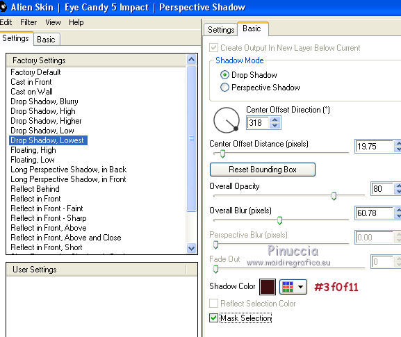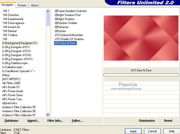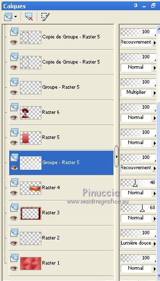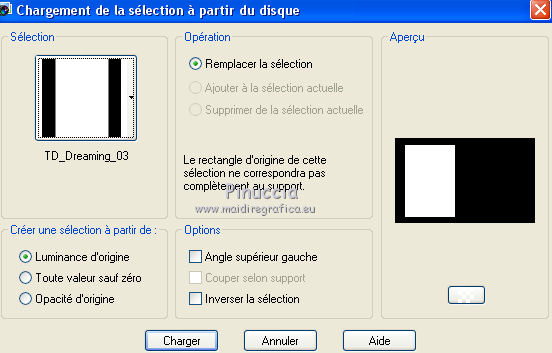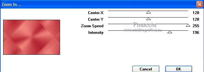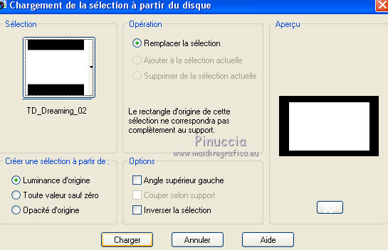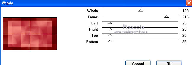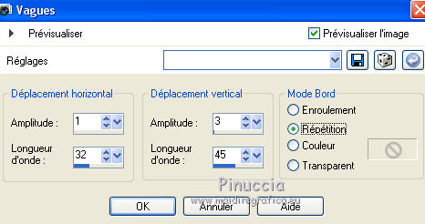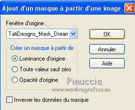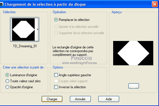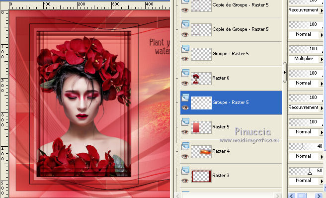Ce tutoriel a été créé et traduit avec CorelX12, mais il peut également être exécuté avec les autres versions. Suivant la version utilisée, vous pouvez obtenir des résultats différents. Depuis la version X4, la fonction Image>Miroir a été remplacée par Image>Renverser horizontalement, et Image>Renverser avec Image>Renverser verticalement . Dans les versions X5 et X6, les fonctions ont été améliorées par la mise à disposition du menu Objets. Avec la nouvelle version X7, nous avons encore Image>Miroir et Image>Renverser/Retourner, mais avec nouvelles différences. Voir les détails à ce sujet ici Certaines dénominations ont changées entre les versions de PSP. Les plus frequentes dénominations utilisées: ![]() Vos versions ici![]() Nécessaire pour réaliser ce tutoriel: Un tube à choix. Matériel ici Pour le tube merci Beatrice (vous pouvez décharger le tube ici Le masque sc-edge-101 n'est pas signé. Le reste du matériel est de Tati (ici les liens vers les sites des créateurs de tubes) Modules Externes: consulter, si nécessaire, ma section des filtres ici Filters Unlimited 2.0 ici &<Background Designers IV> - sf10 Slice N Dice (à importer dans Unlimited) ici Filter Factory Gallery A - Zoom In ici Filter Factory Gallery B - Vibes ici Mehdi - Sorting Tiles ici Mock - Windo ici AAA Frames - Transparent Frame ici Alien Skin Eye Candy 5 Impact - Perspective Shadow ici Filtres Factory Gallery et Mocks peuvent être utilisés seuls ou importés dans Filters Unlimited. voir comment le faire ici). Si un filtre est fourni avec cette icône, ![]() en fonction des couleurs utilisées, vous pouvez changer le mode mélange et l'opacité des calques. Dans les plus récentes versions de PSP, vous ne trouvez pas le dégradé d'avant plan/arrière plan ou Corel_06_029. Vous pouvez utiliser le dégradé des versions antérieures. Ici le dossier Dégradés de CorelX. Placer les sélections dans le dossier Sélections. Placer le masque sc-edge101 dans le dossier Masques. Ouvrir le deuxième masque dans PSP et le minimiser avec le reste du matériel. Choisir des couleurs en fonction de votre tube. Ci-dessous la palette des couleurs ![]() 1. Placer en avant plan la couleur #f68e84, et en arrière plan la couleur #ac1c2a. ![]() 2. Préparer en avant plan un dégradé de premier plan/arrière plan (Corel_06_029), style Linéaire ![]() 3. Ouvrir une nouvelle image transparente 900 x 550 pixels. Remplir l'image transparente du dégradé.4. Réglage>Flou>Flou gaussien - rayon 30. ![]() 5. Effets>Modules Externes>Filters Unlimited 2.0 - &<Background Designers IV> - sf10 Slice N Dice. ![]() 6. Effets>Modules Externes>Filter Factory Gallery A - Zoom In. ![]() Effets>Effets de bords>Accentuer. 7. Effets>Modules Externes>Filter Factory Gallery B - Vibes. ![]() 8. Calques>Nouveau calque raster. Sélections>Charger/Enregistrer une sélection>Charger à partir du disque. Chercher et charger la sélection TD_Dreaming_01. ![]() 9. Effets>Effets 3D>Découpe, couleur noire. ![]() Sélections>Désélectionner tout. 10. Effets>Effets d'image>Mosaïque sans jointures. ![]() Placer le calque en mode Lumière douce. 11. Calques>Nouveau calque raster. Remplir le calque du dégradé.12. Réglage>Flou>Flou gaussien - rayon 30. ![]() 13. Effets>Modules Externes>Mehdi - Sorting Tiles. ![]() Effets>Effets de bords>Accentuer. 14. Effets>Modules Externes>Mock - Windo ![]() 15. Sélections>Charger/Enregistrer une sélection>Charger à partir du disque. Chercher et charger la sélection TD_Dreaming_02. ![]() Presser CANC sur le clavier ![]() Sélections>Désélectionner tout. 16. Effets>Effets d'image>Décalage. ![]() 17. Effets>Modules Externes>AAA Frames - Transparent Frame. ![]() Réduire l'opacité de ce calque à 60% 18. Ouvrir le tube TD_Dreaming_Misted et Édition>Copier. Revenir sur votre travail et Édition>Coller comme nouveau calque. Image>Redimensionner, à 65%, redimensionner tous les calques décoché. 19. Touche K sur le clavier pour activer l'outil Sélecteur ![]() et placer Position horiz.: 347,00 et Posizione vert.: 128,00. ![]() Touche M pour désélectionner l'outil. 20. Effets>Effets de distorsion>Vagues. ![]() Réduire l'opacité de ce calque à 40%. 21. Placer en avant plan la couleur blanche #ffffff, et en arrière plan la couleur noire #000000. 22. Calques>Nouveau calque raster. Remplir la sélection avec la couleur blanche.23. Calques>Nouveau calque de masque>A partir d'une image. Ouvrir le menu deroulant sous la fenêtre d'origine et vous verrez la liste des images ouvertes. Sélectionner le masque TatiDesigns_Mask_Dreaming ![]() Calques>Fusionner>Fusionner le groupe. Placer le calque en mode Recouvrement. 24. Calques>Nouveau calque raster. Sélections>Charger/Enregistrer une sélection>Charger à partir du disque. Chercher et charger la sélection TD_Dreaming_03. ![]() Remplir la sélection avec la couleur noire #000000.25. Sélections>Modifier>Contracter - 1 pixel. Presser CANC sur le clavier. Sélections>Modifier>Contracter - 20 pixels. 26. Placer en avant plan la couleur 3 #3f0f11. Remplir la sélection avec la couleur #3f0f11.27. Calques>Charger/Enregistrer un masque>Charger à partir du disque. Chercher et charger le masque sc-edge101. ![]() Calques>Fusionner>Fusionner le groupe. 28. Placer en avant plan la couleur 1 #f68e84, et en arrière plan la couleur 2 #ac1c2a. ![]() Préparer en avant plan un dégradé de premier plan/arrière plan (Corel_06_029), style Linéaire. ![]() 29. Calques>Nouveau calque raster. Remplir le calque du dégradé.Calques>Agencer>Déplacer vers le bas. Sélections>Désélectionner tout. 30. Ouvrir le tube choisi et Édition>Copier. Revenir sur votre travail et Édition>Coller comme nouveau calque. Image>Redimensionner, si nécessaire (la largeur de l'image doit être à peu près de 277 pixels). Positionner l'image dans le cadre.31. Si vous avez choisi le même tube que moi: Image>Redimensionner, à 59%, redimensionner tous les calques décoché. Touche