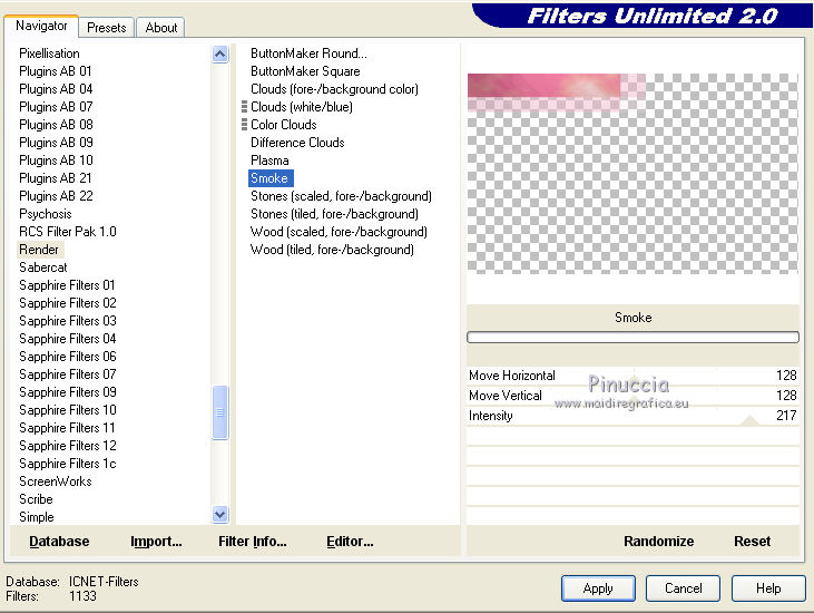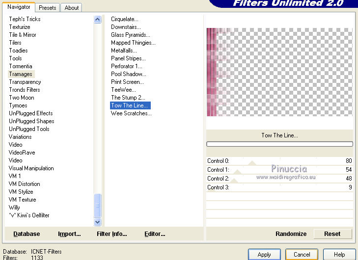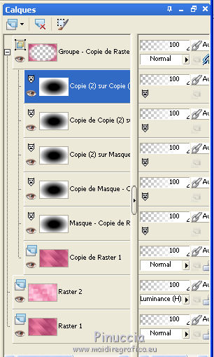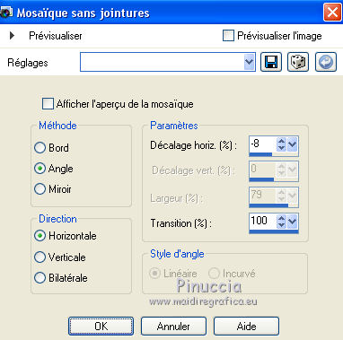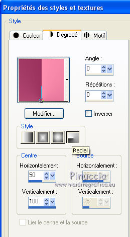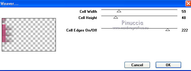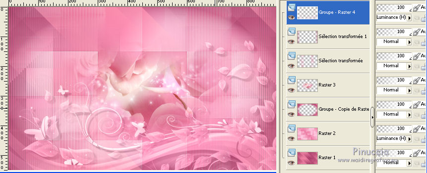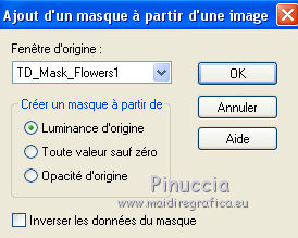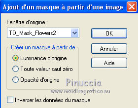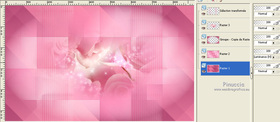 Ce tutoriel a été créé et traduit avec CorelX12, mais il peut également être exécuté avec les autres versions. Suivant la version utilisée, vous pouvez obtenir des résultats différents. Depuis la version X4, la fonction Image>Miroir a été remplacée par Image>Renverser horizontalement, et Image>Renverser avec Image>Renverser verticalement . Dans les versions X5 et X6, les fonctions ont été améliorées par la mise à disposition du menu Objets. Avec la nouvelle version X7, nous avons encore Image>Miroir et Image>Renverser/Retourner, mais avec nouvelles différences. Voir les détails à ce sujet ici Certaines dénominations ont changées entre les versions de PSP. Les plus frequentes dénominations utilisées: ![]() Vos versions ici![]() Nécessaire pour réaliser ce tutoriel: Un tube à choix Matériel ici Pour le tube utilisé merci Mica (vous pouvez décharger le tube ici) Le reste du matériel est de Tati (ici les liens vers les sites des créateurs de tubes) Modules Externes: consulter, si nécessaire, ma section des filtres ici Filters Unlimited 2.0 ici Simple - Diamonds ici RCS Filter Pak 10 - RCS TripleExposure ici Mehdi - Sorting Tiles 1.1 ici Toadies - Weaver, What are you ici Tramages - Tow the line ici AP [Lines] - Lines SilverLining ici Filtres Simple, RCS Filter, Toadies et Tramages peuvent être utilisés seuls ou importés dans Filters Unlimited. voir comment le faire ici). Si un filtre est fourni avec cette icône, ![]() en fonction des couleurs utilisées, vous pouvez changer le mode mélange et l'opacité des calques. Dans les plus récentes versions de PSP, vous ne trouvez pas le dégradé d'avant plan/arrière plan ou Corel_06_029. Vous pouvez utiliser le dégradé des versions antérieures. Ici le dossier Dégradés de CorelX. Placer les sélections dans le dossier Sélections. Placer le masque 20-20 dans le dossier Masques. Ouvrir les autres deux masques dans PSP et les minimiser avec le reste du matériel. Choisir des couleurs en harmonie avec votre tube. Ci-dessous la palette des couleurs ![]() 1. Placer en avant plan la couleur #ff8fb0, et en arrière plan la couleur #9a325e. ![]() Préparer en avant plan un dégradé de premier plan/arrière plan, style Radial ![]() 2. Ouvrir une nouvelle image transparente 900 x 550 pixels. Remplir l'image transparente du dégradé.3. Effets>Modules Externes>Simple - Diamonds. 4. Calques>Dupliquer. Effets>Modules Externes>RCS Filter Pak 1.0 - RCS TripleExposure, par défaut ![]() Réduire l'opacité de ce calque à 50%. Calques>Fusionner>Fusionner le calque de dessous. 5. Effets>Effets d'image>Mosaïque sans jointures. ![]() 6. Image>Miroir. 7. Placer en avant plan la couleur #ffcde2, et en arrière plan la couleur #ed7da5. ![]() Préparer en avant plan un dégradé de premier plan/arrière plan, style Linéaire. ![]() 8. Calques>Nouveau calque raster. Remplir le calque du dégradé.9. Effets>Modules Externes>Mehdi - Sorting Tiles. ![]() 10. Effets>Effets de bords>Accentuer. Placer le calque en mode Luminance (héritée). 11. Vous positionner sur le calque du bas de la pile, Raster 1. Calques>Dupliquer. Calques>Agencer>Placer en haut de la pile. 12. Calques>Charger/Enregistrer un masque>Charger à partir du disque. Chercher et charger le masque 2020. ![]() Calques>Dupliquer - 4 fois ![]() Calques>Fusionner>Fusionner le groupe. 13. Ouvrir le tube TD_Misted_Flowers et Édition>Copier. Revenir sur votre travail et Édition>Coller comme nouveau calque. Ne pas déplacer; il est à sa place. 14. Vous positionner sur le calque du bas de la pile, Raster 1. Sélections>Charger/Enregistrer une sélection>Charger à partir du disque. Chercher et charger la sélection TD_Flowers_Sel1. ![]() Sélections>Transformer la sélection en calque. Sélections>Désélectionner tout. Calques>Agencer>Placer en haut de la pile. 15. Placer en arrière plan la couleur blanche #ffffff. ![]() 16. Effets>Modules Externes>Mehdi - Weaver. ![]() 17. Effets>Effets d'image>Mosaïque sans jointures, côte à côte. ![]() 18. Effets>Modules Externes>AP [Lines] - Lines SilverLining. ![]() 19. Effets>Effets d'image>Mosaïque sans jointures. ![]() 20. Vous positionner sur le calque du bas de la pile, Raster 1. ![]() Sélections>Charger/Enregistrer une sélection>Charger à partir du disque. Chercher et charger la sélection TD_Flowers_Sel2. ![]() Sélections>Transformer la sélection en calque. Sélections>Désélectionner tout. Calques>Agencer>Placer en haut de la pile. 21. Effets>Modules Externes>Toadies - Weaver, par défaut. ![]() Note: N'oubliez pas que vous devez avoir la couleur blanche en arrière plan. 22. Effets>Effets d'image>Mosaïque sans jointures. ![]() 23. Effets>Modules Externes>Filters Unlimited 2.0 - Tramages - Tow the line, par défaut. ![]() 24. Effets>Effets d'image>Mosaïque sans jointures. ![]() 25. Calques>Nouveau calque raster. Remplir le calque avec la couleur blanche #ffffff.26. Calques>Nouveau calque de masque>A partir d'une image. Ouvrir le menu deroulant sous la fenêtre d'origine et vous verrez la liste des images ouvertes. Sélectionner le masque TD_Mask_Flowers1. ![]() Calques>Fusionner>Fusionner le groupe. 27. Effets>Effets 3D>Ombre portée, couleur #9a325e. ![]() Placer le calque en mode Luminance (héritée). ![]() 28. Vous positionner sur le calque du bas de la pile, Raster 1. Activer l'outil Sélection ![]() (peu importe le type de sélection, parce que avec la sélection personnalisée vous obtenez toujours un rectangle), cliquer sur Sélection personnalisée ![]() et setter ces paramètres. ![]() Sélections>Transformer la sélection en calque. Sélections>Désélectionner tout. Calques>Agencer>Placer en haut de la pile. 29. Effets>Modules Externes>Toadies - What are you, par défaut. ![]() Note: N'oubliez pas que vous devez avoir la couleur blanche en arrière plan. 30. Effets>Modules Externes>Filters Unlimited 2.0 - Render - Smoke, par défaut. ![]() 31. Effets>Effets d'image>Mosaïque sans jointures. ![]() 3