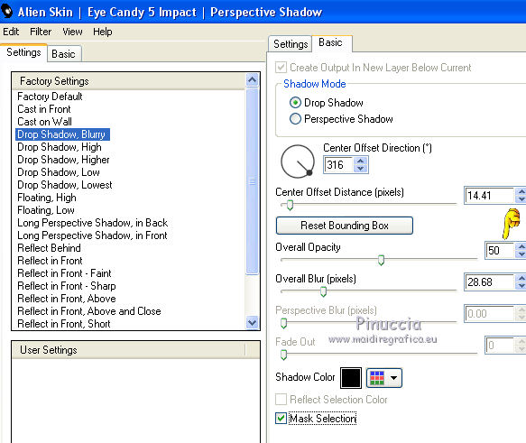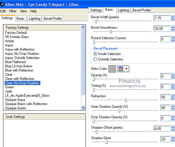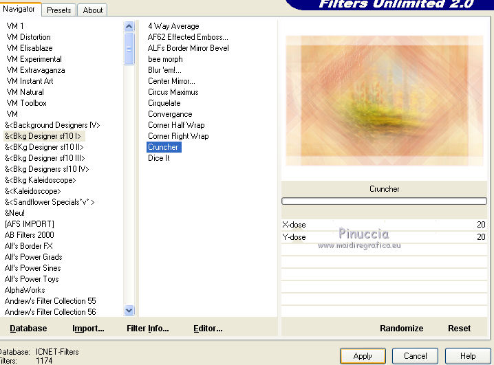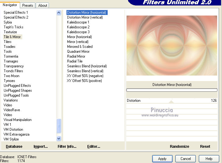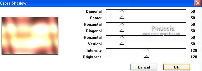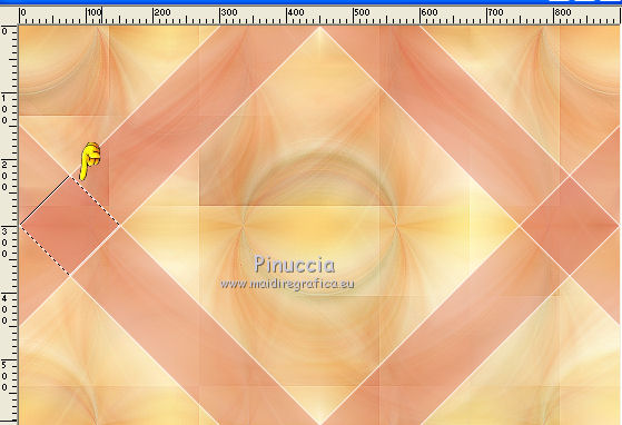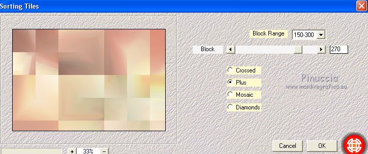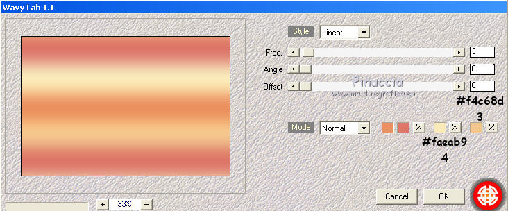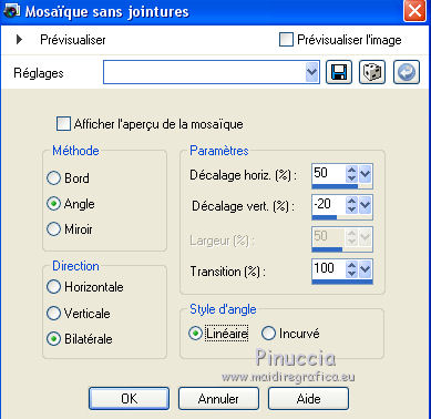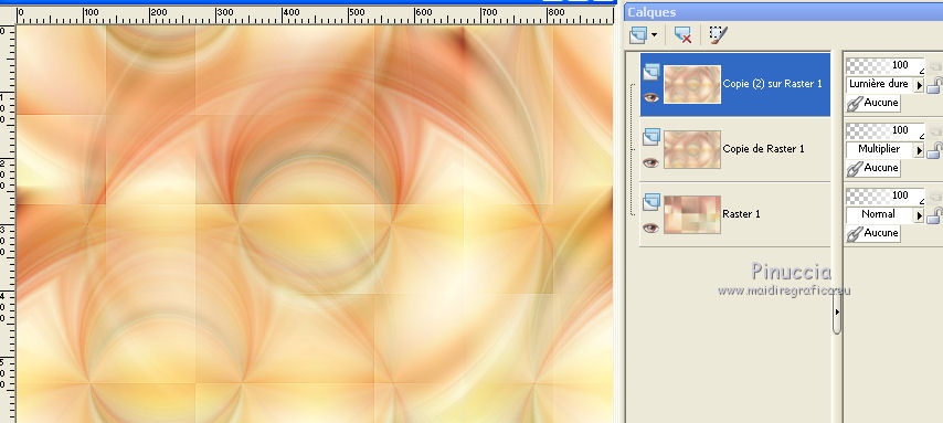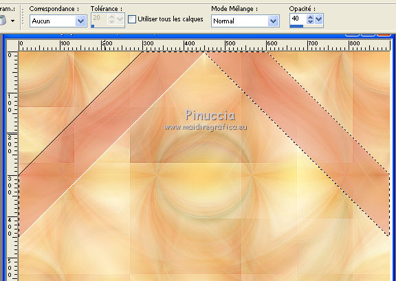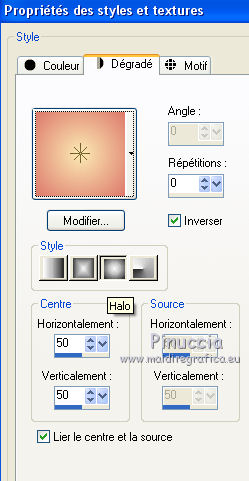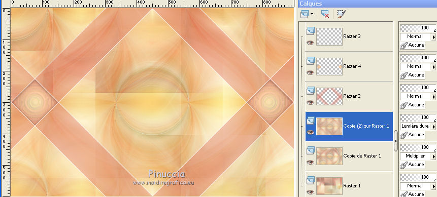 Ce tutoriel a été créé et traduit avec CorelX12, mais il peut également être exécuté avec les autres versions. Suivant la version utilisée, vous pouvez obtenir des résultats différents. Depuis la version X4, la fonction Image>Miroir a été remplacée par Image>Renverser horizontalement, et Image>Renverser avec Image>Renverser verticalement . Dans les versions X5 et X6, les fonctions ont été améliorées par la mise à disposition du menu Objets. Avec la nouvelle version X7, nous avons encore Image>Miroir et Image>Renverser/Retourner, mais avec nouvelles différences. Voir les détails à ce sujet ici Certaines dénominations ont changées entre les versions de PSP. Les plus frequentes dénominations utilisées: ![]() Vos versions ici![]() Nécessaire pour réaliser ce tutoriel: Un tube à choix (pour le tuto original, Tati a utilisé un tube sous licence) Le reste du matériel ici Merci pour le tube de ma version 1Patries et pour le masque Tine. Le reste du matériel est de Tati. (ici les liens vers les sites des créateurs de tubes) Modules Externes: consulter, si nécessaire, ma section des filtres ici Filters Unlimited 2.0 ici Mehdi - Wavy Lab 1.1. ici Mehdi - Sorting Tiles ici Graphics Plus - Cross Shadow ici &<Bkg Designer sf10I> - Cruncher (à importer dans Unlimited) ici Alien Skin Eye Candy 5 Impact - Glass, Perspective Shadow ici Filtres Graphics Plus peuvent être utilisés seuls ou importés dans Filters Unlimited. voir comment le faire ici). Si un filtre est fourni avec cette icône, ![]() en fonction des couleurs utilisées, vous pouvez changer le mode mélange et l'opacité des calques. Dans les plus récentes versions de PSP, vous ne trouvez pas le dégradé d'avant plan/arrière plan ou Corel_06_029. Vous pouvez utiliser le dégradé des versions antérieures. Ici le dossier Dégradés de CorelX. Placer la sélection dans le dossier Sélections. Ouvrir le masque dans PSP et le minimiser avec le reste du matériel. Choisir des couleurs en fonction de votre tube. Ci-dessous la palette des couleurs ![]() 1. Placer en avant plan la couleur 1 #dd7769, et en arrière plan la couleur 2 #eb9160. ![]() 2. Ouvrir une nouvelle image transparente 900 x 600 pixels. 3. Effets>Modules Externes>Mehdi - Wavy Lab 1.1. Ce filtre crée des dégradés avec les couleurs de votre palette: la première est la couleur d'arrière plan, la deuxième est la couleur d'avant plan. Changer les autres deux couleurs créées par le filtre: la troisième avec la couleur #faeab9 et la quatrième avec la couleur #f4c68d ![]() 4. Effets>Modules Externes>Graphcs Plus - Cross Shadow, par défaut. ![]() 5. Effets>Effets d'image>Mosaïque sans jointures. ![]() 6. Sélections>Sélectionner tout. Ouvrir votre tube et Édition>Copier. Revenir sur votre travail et Édition>Coller dans la sélection. Sélections>Désélectionner tout. 7. Réglage>Flou>Flou radial. ![]() 8. Calques>Dupliquer. Fermer ce calque et vous positionner sur le calque de dessous, Raster 1. 9. Effets>Modules Externes>Mehdi - Sorting Tiles. ![]() Effets>Effets de bords>Accentuer. 10. Re-ouvrir et vous positionner sur le calque de dessus, Copie de Raster 1. Effets>Modules Externes>Filters Unlimited 2.0 - Tile &Mirror - Distortion Mirror (horizontal), par défaut. ![]() 11. Effets>Effets d'image>Mosaïque sans jointures. ![]() Réglage>Netteté>Netteté. 12. Placer le calque en mode Multiplier. Calques>Dupliquer. Placer le calque en mode Lumière dure. ![]() 13. Effets>Effets d'image>Mosaïque sans jointures. ![]() 14. Image>Renverser. Effets>Effets de bords>Accentuer. 15. Calques>Nouveau calque raster. Sélections>Charger/Enregistrer une sélection>Charger à partir du disque. Chercher et charger la sélection TD_Little_Fairy_Sel1. ![]() 16. Réduire l'opacité de l'outil Pot de peinture à 40%. Remplir la sélection avec la couleur d'avant plan #dd7769.![]() Placer à nouveau l'opacité de l'outil Pot de peinture à 100. Sélections>Désélectionner tout. 17. Calques>Dupliquer. Image>Renverser. Calques>Fusionner>Fusionner le calque de dessous. 18. Ouvrir le tube TD_Deco1_Little_Fairy - Édition>Copier. Revenir sur votre travail et Édition>Coller comme nouveau calque. Ne pas déplacer; il est à sa place. 19. Activer l'outil Baguette magique , tolérance et progressivité 0,et cliquer dans la losange latérale à gauche pour la sélectionner. ![]() 20. Garder en avant plan la couleur #dd7769, et placer en arrière plan la couleur #faeab9. ![]() Préparer en avant plan un dégradé de premier plan/arrière plan, style Halo. ![]() Calques>Nouveau calque raster. Remplir la sélection du dégradé.21. Effets>Effets artistiques>Émail, couleur d'avant plan #dd7769. ![]() 22. Effets>Modules Externes>Alien Skin Eye Candy 5 Impact - Glass. Sélectionner le preset Clear, No drop Shadow et ok. ![]() Sélections>Désélectionner tout. 23. Calques>Dupliquer. Image>Miroir. Calques>Fusionner>Fusionner le calque de dessous. Calques>Agencer>Déplacer vers le bas. 24. Vous positionner sur le calque Copie (2) sur Raster 1. ![]() 25. Ouvrir le tube TD_Misted_Little_Fairy - Édition>Copier. Revenir sur votre travail et Édition>Coller comme nouveau calque. 26. Touche K sur le clavier pour activer l'outil Sélecteur ![]() garder Position horiz.: 107,00 et placer Position vert.: -5,00. ![]() Touche M pour désélectionner l'outil. 27. Vous positionner sur le calque du haut de la pile, Raster 3. Calques>Nouveau calque raster. Remplir le calque avec la couleur d'arrière plan #faeab9.28. Calques>Nouveau calque de masque>A partir d'une image. Ouvrir le menu deroulant sous la fenêtre d'origine et vous verrez la liste des images ouvertes. Sélectionner le masque creation.tine_masque145. ![]() Calques>Fusionner>Fusionner le groupe. Réglage>Netteté>Netteté. 29. Effets>Effets 3D>Ombre portée, couleur d'arrière plan #faeab9. ![]() 30. Placer le calque en mode Lumière dure. 31. Ouvrir le tube TD_TituloLittle_Fairy - Édition>Copier. Revenir sur votre trava