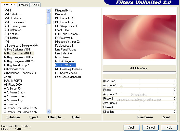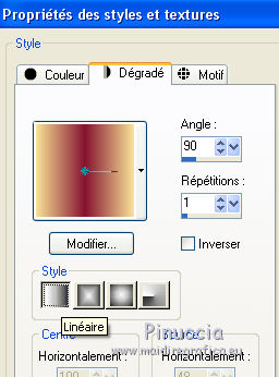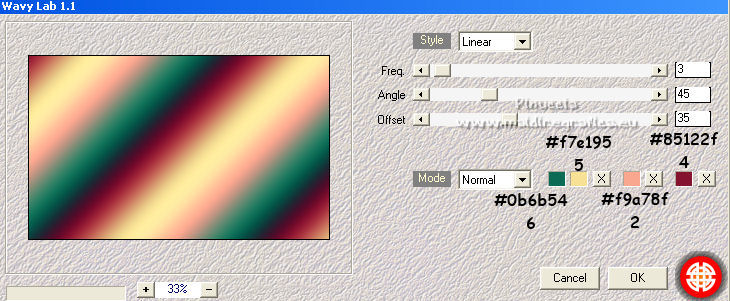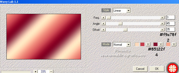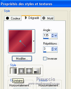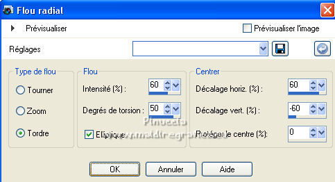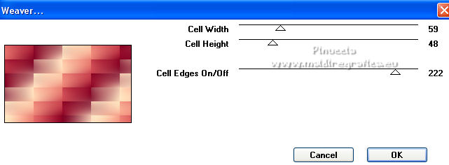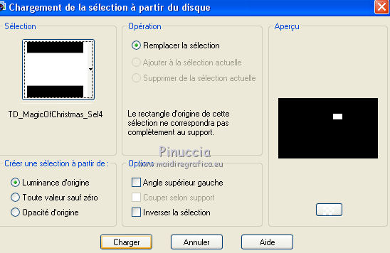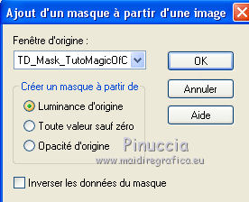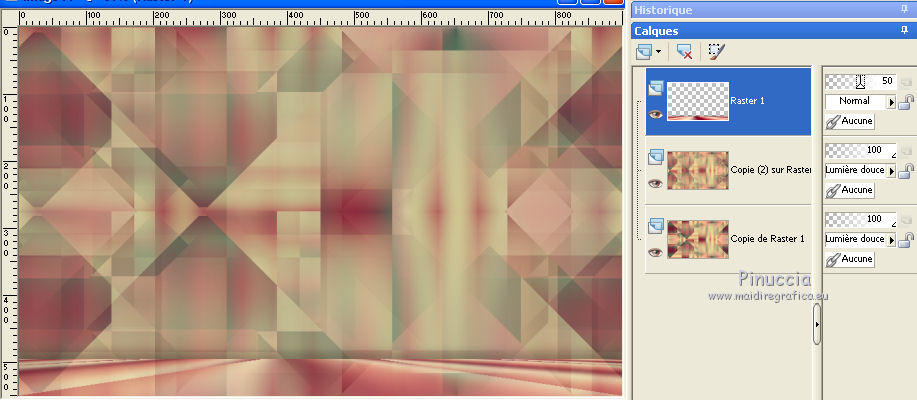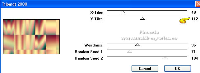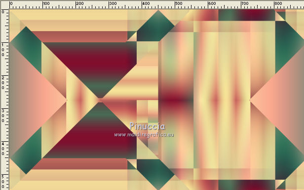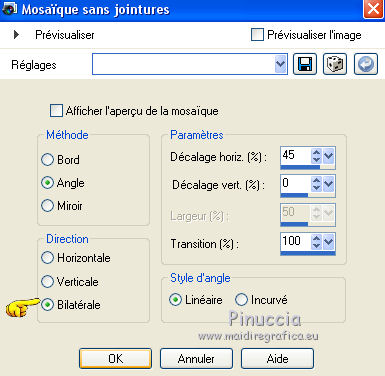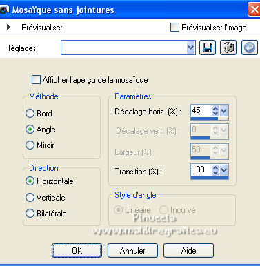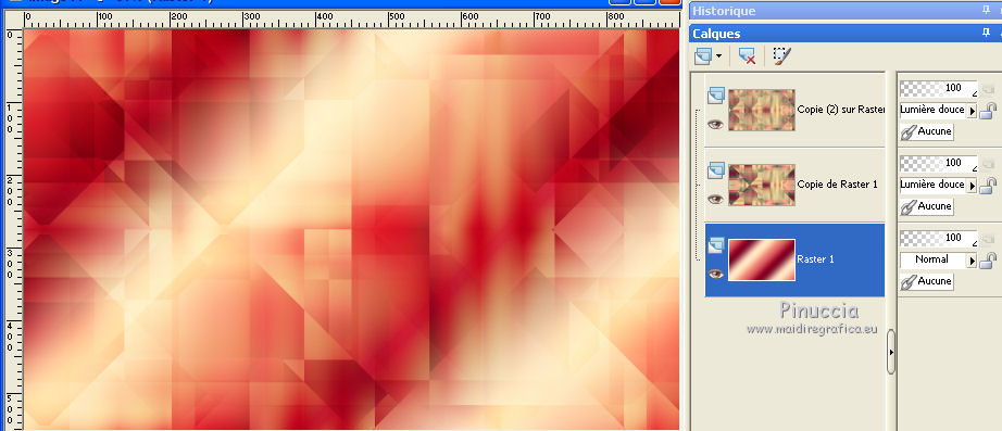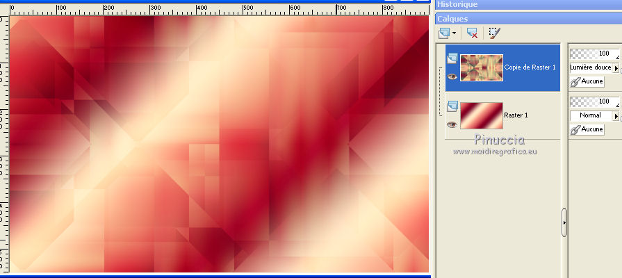 Ce tutoriel a été créé et traduit avec CorelX12, mais il peut également être exécuté avec les autres versions. Suivant la version utilisée, vous pouvez obtenir des résultats différents. Depuis la version X4, la fonction Image>Miroir a été remplacée par Image>Renverser horizontalement, et Image>Renverser avec Image>Renverser verticalement . Dans les versions X5 et X6, les fonctions ont été améliorées par la mise à disposition du menu Objets. Avec la nouvelle version X7, nous avons encore Image>Miroir et Image>Renverser/Retourner, mais avec nouvelles différences. Voir les détails à ce sujet ici Certaines dénominations ont changées entre les versions de PSP. Les plus frequentes dénominations utilisées: ![]() Vos versions ici![]() Nécessaire pour réaliser ce tutoriel: Matériel ici Merci: pour les tubes Suizabella, Animabelle, Cibi Bijoux, Pngkey. Les cadres trouvés sur le net. Le reste du matériel est de Tati. (ici les liens vers les sites des créateurs de tubes) ![]() Modules Externes: consulter, si nécessaire, ma section des filtres ici Filters Unlimited 2.0 ici &<Bkg Designer sf10II> - MURU's Wave (à importer dans Unlimited) ici Mehdi - Wavy Lab 1.1. ici Toadies - Weaver ici VM Distortion - Tilomat 2000 ici Simple - Blintz, Pizza Slice Mirror ici Mura's Meister - Perspective Tiling ici Alien Skin Eye Candy 5 Impact - Glass ici Filtres Toadies, VM Distortion et Simple peuvent être utilisés seuls ou importés dans Filters Unlimited. voir comment le faire ici). Si un filtre est fourni avec cette icône, ![]() en fonction des couleurs utilisées, vous pouvez changer le mode mélange et l'opacité des calques. Dans les plus récentes versions de PSP, vous ne trouvez pas le dégradé d'avant plan/arrière plan ou Corel_06_029. Vous pouvez utiliser le dégradé des versions antérieures. Ici le dossier Dégradés de CorelX. Placer les sélections dans le dossier Sélections. Ouvrir le masque dans PSP et le minimiser avec le reste du matériel. Couleurs utilisées ![]() 1. Placer en avant plan la couleur 3 #c63d4b, et en arrière plan la couleur 1 #fed9bc ![]() 2. Ouvrir une nouvelle image transparente 900 x 550 pixels. 3. Effets>Modules Externes>Mehdi - Wavy Lab 1.1. Ce filtre crée des dégradés avec les couleurs de votre palette: la première est la couleur d'arrière plan, la deuxième est la couleur d'avant plan. Changer les autres deux couleurs créées par le filtre: la troisième avec la couleur 4 #85122f et la quatrième avec la couleur 2 #f9a78f ![]() 4. Calques>Dupliquer. Effets>Modules Externes>Toadies - Weaver, par défaut. ![]() 5. Réglage>Flou>Flou radial. ![]() 6. Effets>Modules Externes>Filters Unlimited 2.0 - &<Bkg Designer sf10II> - MURUs Wave, par défaut. ![]() 7. Calques>Nouveau calque raster. Effets>Modules Externes>Mehdi - Wavy Lab 1.1. #0b6b54 #f7e195 #f9a78f #85122f ![]() 8. Effets>Effets de réflexion>Miroir rotatif, par défaut ![]() 9. Effets>Effets d'image>Mosaïque sans jointures. ![]() 10. Effets>Modules Externes>VM Distortion - Tilomat 2000 ![]() 11. Effets>Effets d'image>Mosaïque sans jointures. ![]() 12. Effets>Modules Externes>Simple - Blintz. Effets>Modules Externes>Simple - Pizza Slice Mirror. Ces effets travaillent sans fenêtre; résultat ![]() 13. Effets>Effets d'image>Mosaïque sans jointures, comme précédemment. ![]() 14. Placer le calque en mode Lumière douce. ![]() 15. Calques>Dupliquer. Effets>Effets d'image>Mosaïque sans jointures ![]() 16. Vous positionner sur le calque du bas de la pile, Raster 1. ![]() 17. Calques>Agencer>Placer en haut de la pile. Image>Miroir. 18. Effets>Modules Externes>Mura's Meister - Perspective Tiling. ![]() 19. Effets>Effets 3D>Ombre portée, couleur noire. ![]() 20. Réduire l'opacité de ce calque à 50%. ![]() 21. Placer en avant plan la couleur 5 #f7e195, et en arrière plan la couleur 4 #85122f. ![]() Préparer en avant plan un dégradé de premier plan/arrière plan, style Linéaire ![]() 22. Calques>Nouveau calque raster. Remplir le calque du dégradé.23. Calques>Nouveau calque de masque>A partir d'une image. Ouvrir le menu deroulant sous la fenêtre d'origine et vous verrez la liste des images ouvertes. Sélectionner le masque TD_Mask_TutoMagicOfChristmas. ![]() Calques>Fusionner>Fusionner le groupe. 24. Effets>Effets 3D>Ombre portée, couleur 5 #f7a195. ![]() 25. Ouvrir le tube 025_tube_noel_p1_animabelle, effacer le watermark et Édition>Copier. Revenir sur votre travail et Édition>Coller comme nouveau calque. Image>Redimensionner, à 65%, redimensionner tous les calques décoché. 26. Touche K sur le clavier pour activer l'outil Sélecteur ![]() et placer Position horiz.: 78,00 et Position vert.: 9,00. ![]() Touche M pour désélectionner l'outil. 27. Calques>Dupliquer, et vous positionner sur le calque de dessous de l'original. Réglage>Flou>Flou gaussien - rayon 15. ![]() Placer le calque en mode Multiplier. 28. Vous positionner sur le calque du haut de la pile. Ouvrir le tube Deco_noel_rouge_by_CibiBijoux et Édition>Copier. Revenir sur votre travail et Édition>Coller comme nouveau calque. Image>Miroir. Image>Redimensionner, à 50%, redimensionner tous les calques décoché. 29. Touche K pour activer l'outil Sélecteur ![]() et placer Position horiz.: 13,00 et Position vert.: 356,00. ![]() Réglage>Netteté>Netteté. 30. Effets>Effets 3D>Ombre portée, couleur noire. ![]() 31. Ouvrir le tube TD_TutoMagicOfChristmas_Bolas et Édition>Copier. Revenir sur votre travail et Édition>Coller comme nouveau calque. Placer Position horiz.: 260,00 et Position vert.: 442,00. ![]() 32. Ouvrir le tube TD_TutoMagicOfChristmas_Deco1 et Édition>Copier. Revenir sur votre travail et Édition>Coller comme nouveau calque. Ne pas déplacer; il est à sa place. 33. Ouvrir le tube TD_TutoMagicOfChristmas_Deco2 et Édition>Copier. Revenir sur votre travail et Édition>Coller comme nouveau calque. Placer Position horiz.: 321,00 et Position vert.: 0,00. ![]() Touche M pour désélectionner