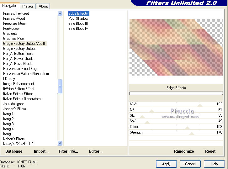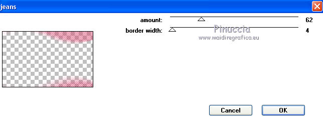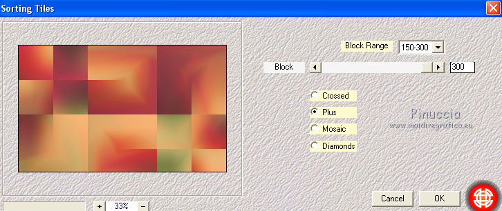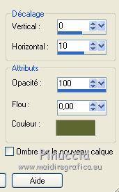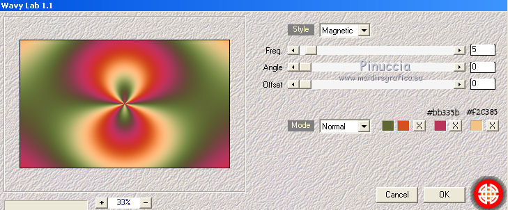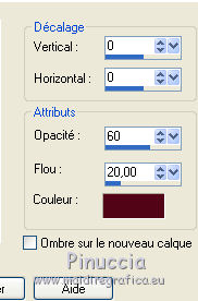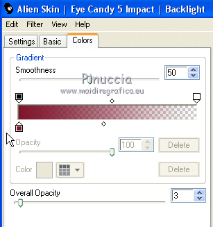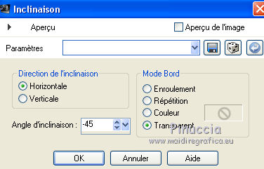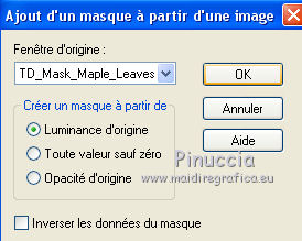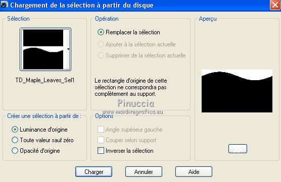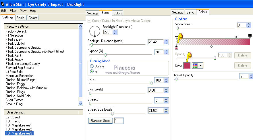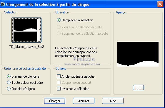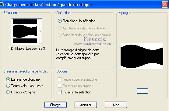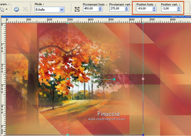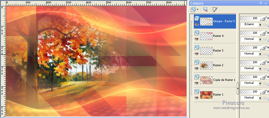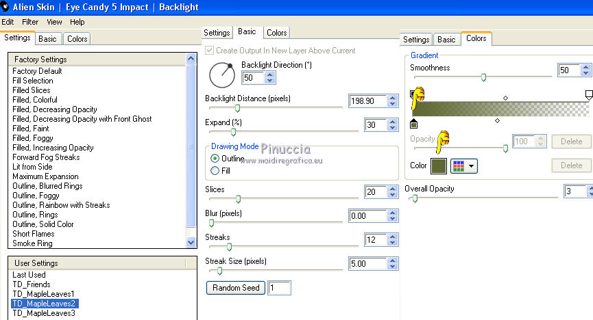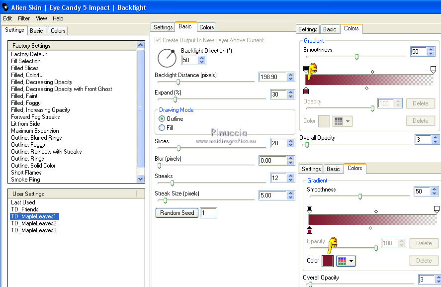 Ce tutoriel a été créé et traduit avec CorelX12, mais il peut également être exécuté avec les autres versions. Suivant la version utilisée, vous pouvez obtenir des résultats différents. Depuis la version X4, la fonction Image>Miroir a été remplacée par Image>Renverser horizontalement, et Image>Renverser avec Image>Renverser verticalement . Dans les versions X5 et X6, les fonctions ont été améliorées par la mise à disposition du menu Objets. Avec la nouvelle version X7, nous avons encore Image>Miroir et Image>Renverser/Retourner, mais avec nouvelles différences. Voir les détails à ce sujet ici Certaines dénominations ont changées entre les versions de PSP. Les plus frequentes dénominations utilisées: ![]() Vos versions ici![]() Nécessaire pour réaliser ce tutoriel: Matériel ici Pour le tube merci Leny. Le reste du matériel est de Tati. (ici les liens vers les sites des créateurs de tubes) Modules Externes: consulter, si nécessaire, ma section des filtres ici Filters Unlimited 2.0 ici Mehdi - Wavy Lab 1.1. ici Mehdi - Sorting Tiles ici Greg's Factory Output vol.II - Edge Effects ici Penta.com - Jeans ici Alien Skin Eye Candy 5 Impact - Backlight ici Filtres Greg's Factory Output et Penta.com peuvent être utilisés seuls ou importés dans Filters Unlimited. voir comment le faire ici). Si un filtre est fourni avec cette icône, ![]() en fonction des couleurs utilisées, vous pouvez changer le mode mélange et l'opacité des calques. Placer les presets En cliquant sur le preset une ou deux fois (selon vos réglages) automatiquement il se placera directement dans le dossier Settings de Alien Skin Eye Candy. pourquoi un ou deux clic voir ici Placer les sélections dans le dossier Sélections. Ouvrir le masque dans PSP et le minimiser avec le reste du matériel. Choisir des couleurs en fonction de votre tube. Ci-dessous la palette des couleurs ![]() 1. Placer en avant plan la couleur 2 #d64f1f, et en arrière plan la couleur 4 #5f6732 ![]() 2. Ouvrir une nouvelle image transparente 900 x 550 pixels. 3. Effets>Modules Externes>Mehdi - Wavy Lab 1.1. Ce filtre crée des dégradés avec les couleurs de votre palette: la première est la couleur d'arrière plan, la deuxième est la couleur d'avant plan. Changer les autres deux couleurs créées par le filtre: la troisième avec la couleur #bb335b et la quatrième avec la couleur #f2c385 ![]() 4. Effets>Effets d'image>Mosaïque sans jointures. ![]() 5. Réglage>Flou>Flou gaussien - rayon 35. ![]() 6. Effets>Modules Externes>Mehdi - Sorting Tiles ![]() 7. Calques>Dupliquer. Image>Renverser. 8. Effets>Effets géométriques>Inclinaison. ![]() 9. Effets>Modules Externes>Filters Unlimited 2.0 - Greg's Factory Output vol.II - Edge Effects, par défaut. ![]() 10. Ouvrir le tube TD_Misted_Maple_Leaves et Édition>Copier. . Revenir sur votre travail et Édition>Coller comme nouveau calque. 11. Touche K sur le clavier pour activer l'outil Sélecteur ![]() et placer Position horiz.: -69,00 et Position vert.: -3,00. ![]() Touche M pour désélectionner l'outil. 12. Calques>Nouveau calque raster. 13. Sélections>Charger/Enregistrer une sélection>Charger à partir du disque. Chercher et charger la sélection TD_Maple_Leaves_Sel1. ![]() 14. Effets>Modules Externes>Alien Skin Eye Candy 5 Impact - Backlight. Sélectionner le preset TD_MapleLeaves1 et ok Ci-dessous les réglages, en cas de problèmes avec le preset ![]() Dans l'onglet Colors, vous pouvez modifier la couleur: cliquer d'abord sur la petite case et l'option de choisir votre couleur apparaîtra ci-dessous. ![]() 15. Sélections>Désélectionner tout. Sélections>Charger/Enregistrer une sélection>Charger à partir du disque. Chercher et charger la sélection TD_Maple_Leaves_Sel2. ![]() 16. Effets>Modules Externes>Alien Skin Eye Candy 5 Impact - Backlight sélectionner le preset TD_MapleLeaves2 Ci-dessous les réglages en cas de problèmes avec le preset ![]() Dans l'onglet Colors, vous pouvez modifier la couleur: cliquer d'abord sur la petite case et l'option de choisir votre couleur apparaîtra ci-dessous. 18. Sélections>Désélectionner tout. 19. Calques>Nouveau calque raster. Sélections>Charger/Enregistrer une sélection>Charger à partir du disque. Chercher et charger la sélection TD_Maple_Leaves_Sel3. ![]() 20. Effets>Modules Externes>Alien Skin Eye Candy 5 Impact - Backlight sélectionner le preset TD_MapleLeaves3 et ok Ci-dessous les réglages en cas de problèmes avec le preset. ![]() Dans l'onglet Colors, vous pouvez modifier la couleur: cliquer d'abord sur la petite case et l'option de choisir votre couleur apparaîtra ci-dessous. 21. Effets>Modules Externes>Penta.com - Jeans, par défaut. ![]() 22. Sélections>Désélectionner tout. 23. Placer en avant plan la couleur 1 #f2c385. ![]() Calques>Nouveau calque raster. Remplir le calque avec la couleur d'avant plan #f2c385.24. Calques>Nouveau calque de masque>A partir d'une image. Ouvrir le menu deroulant sous la fenêtre d'origine et vous verrez la liste des images ouvertes. Sélectionner le masque TD_Mask_Maple_Leaves. ![]() Calques>Fusionner>Fusionner le groupe. 25. Effets>Effets 3D>Ombre portée, couleur 4 #5f6732. ![]() 26. Placer le calque en mode Éclaircir. Note: si vos couleurs sont très foncées, réduire l'opacité du calque. ![]() 27. Ouvrir le tube TD_Titulo_Maple_Leaves et Édition>Copier. . Revenir sur votre travail et Édition>Coller comme nouveau calque. 28. Touche K sur le clavier pour activer l'outil Sélecteur ![]() et placer Position horiz.: 59,00 et Position vert.: 452,00. ![]() Touche M pour désélectionner l'outil. 29. Effets>Effets 3D>Ombre portée, couleur 5 #520616. ![]() 30. Image>Ajouter des bordures, 1 pixel, symétrique, couleur 5 #520616. Image>Ajouter des bordures, 1 pixel, symétrique, couleur 3 #bb335b. Image>Ajouter des bordures, 1 pixel, symétrique, couleur 5 #520616. Image>Ajouter des bordures, 15 pixels symétrique, couleur #ffffff. Image>Ajouter des bordures, 1 pixel, sy