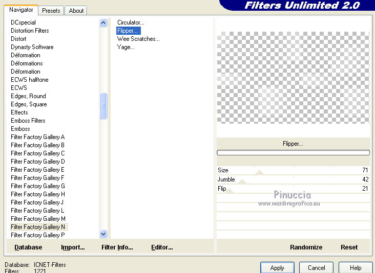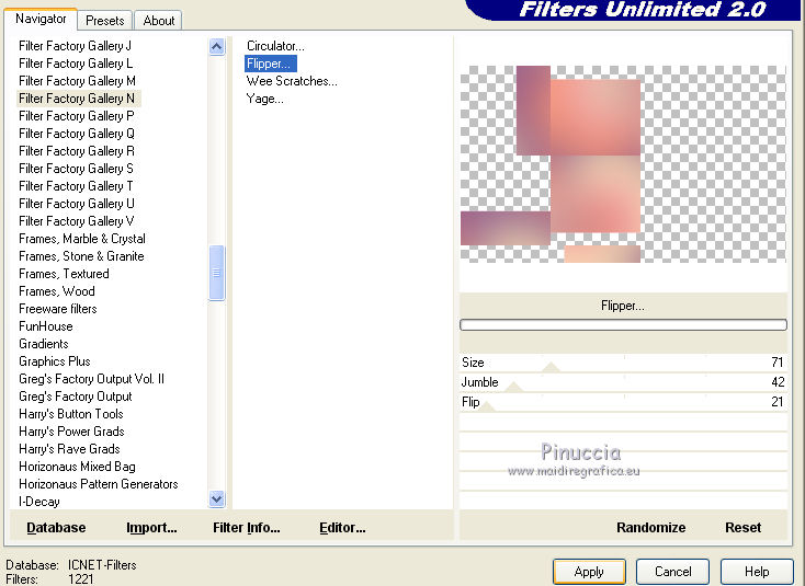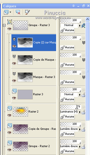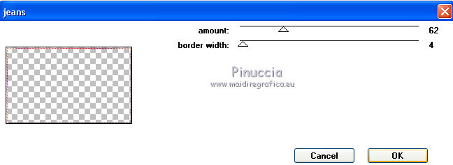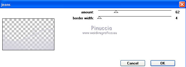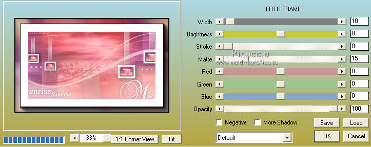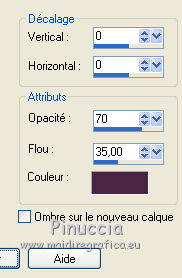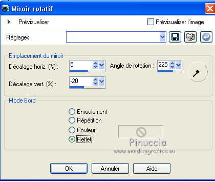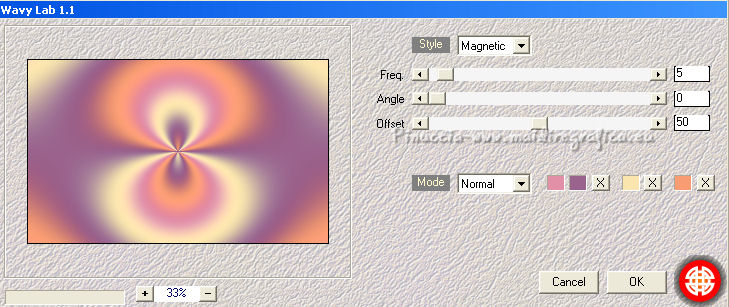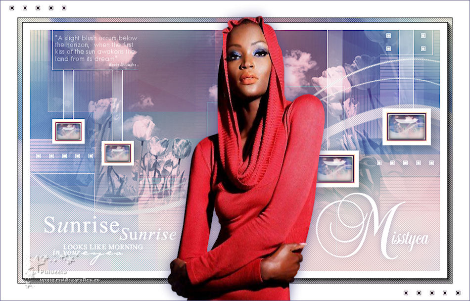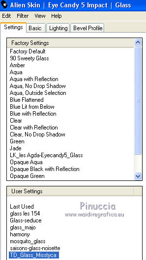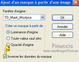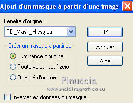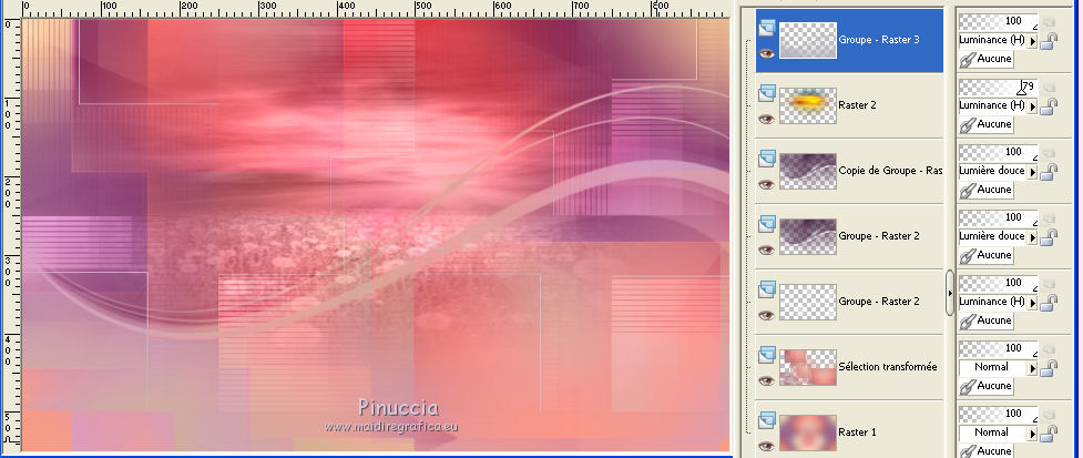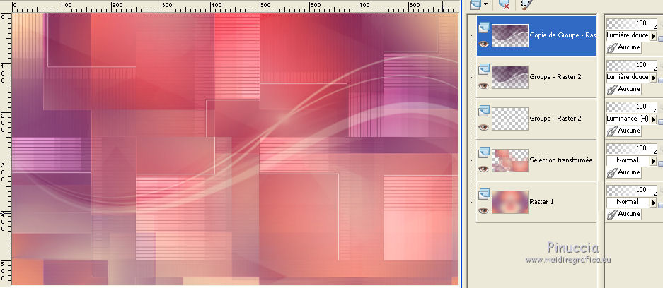 Ce tutoriel a été créé et traduit avec CorelX12, mais il peut également être exécuté avec les autres versions. Suivant la version utilisée, vous pouvez obtenir des résultats différents. Depuis la version X4, la fonction Image>Miroir a été remplacée par Image>Renverser horizontalement, et Image>Renverser avec Image>Renverser verticalement . Dans les versions X5 et X6, les fonctions ont été améliorées par la mise à disposition du menu Objets. Avec la nouvelle version X7, nous avons encore Image>Miroir et Image>Renverser/Retourner, mais avec nouvelles différences. Voir les détails à ce sujet ici Certaines dénominations ont changées entre les versions de PSP. Les plus frequentes dénominations utilisées: ![]() Vos versions iciNécessaire pour réaliser ce tutoriel: Matériel ici Pour le tube merci Misstyca (http://truncyka.ek.la/mes-tubes-p909460) Pour un masque merci Narah. Le reste du matériel est de Tati (ici les liens vers les sites des créateurs de tubes) Modules Externes: consulter, si nécessaire, ma section des filtres ici Filters Unlimited 2.0 ici Graphics Plus - Emboss, Cross Shadow ici Filter Factory Gallery N - Flipper ici Mehdi - Wavy Lab 1.1. ici Mehdi - Sorting Tiles ici Penta.com - Jeans ici Alien Skin Eye Candy 5 Impact - Glass ici AAA Frames - Foto Frame ici Filtres Factory Gallery et Penta.com peuvent être utilisés seuls ou importés dans Filters Unlimited. voir comment le faire ici). Si un filtre est fourni avec cette icône, ![]() en fonction des couleurs utilisées, vous pouvez changer le mode mélange et l'opacité des calques. Placer le preset En cliquant sur le preset une ou deux fois (selon vos réglages) automatiquement il se placera directement dans le dossier Settings de Alien Skin Eye Candy. pourquoi un ou deux clic voir ici Placer les sélections dans le dossier Sélections Ouvrir les masques dans PSP et les minimiser avec le reste du matériel. Couleurs utilisées ![]() 1. Placer en avant plan la couleur 2 #9a638d. et en arrière plan la couleur 1 #e290a8. ![]() 2. Ouvrir une nouvelle image transparente 900 x 550 pixels. 3. Effets>Modules Externes>Mehdi - Wavy lab 1.1 Ce filtre crée des dégradés avec les couleurs de votre palette: la première est la couleur d'arrière plan, la deuxième est la couleur d'avant plan. Changer les autres deux couleurs créées par le filtre: la trosième avec la couleur 3 #fbe5af, et la quatrième avec la couleur 4 #f89c74. ![]() 4. Réglage>Flou>Flou gaussien - rayon 60. ![]() 5. Sélections>Charger/Enregistrer une sélection>Charger à partir du disque. Chercher et charger la sélection TD_Misstyca_Sel1 ![]() Sélections>Transformer la sélection en calque. Sélections>Désélectionner tout. 6. Effets>Modules Externes>Filters Unlimited 2.0 - Filter Factory Gallery N - Flipper, par défaut. ![]() Réglage>Netteté>Netteté. 7. Effets>Effets d'image>Mosaïque sans jointures, Bégaiement diagonale ![]() 8. Effets>Effets de réflexion>Miroir rotatif. ![]() 9. Placer en avant plan la couleur #ffffff. ![]() Calques>Nouveau calque raster. Remplir le calque avec la couleur #ffffff.10. Calques>Nouveau calque de masque>A partir d'une image. Ouvrir le menu deroulant sous la fenêtre d'origine et vous verrez la liste des images ouvertes. Sélectionner le masque NarahsMasks_1524. ![]() Calques>Fusionner>Fusionner le groupe. 11. Sélections>Charger/Enregistrer une sélection>Charger à partir du disque. Chercher et charger la sélection TD_Misstyca_Sel2 ![]() Presser CANC sur le clavier ![]() Sélections>Désélectionner tout. 12. Effets>Modules Externes>Filters Unlimited 2.0 - Filter Factory Gallery N - Flipper, par défaut. ![]() Réglage>Netteté>Netteté. 13. Placer le calque en mode Luminance (héritée). 14. Placer en avant plan la couleur 6 #4a2546. ![]() Calques>Nouveau calque raster. Remplir le calque avec la couleur d'avant plan #4a2546.15. Calques>Nouveau calque de masque>A partir d'une image. Ouvrir le menu deroulant sous la fenêtre d'origine et sélectionner le masque TD_Mask_Misstyca. ![]() Calques>Fusionner>Fusionner le groupe. 16. Placer le calque en mode Lumière douce. Calques>Dupliquer. ![]() 17. Ouvrir le tube TD_Misted_Amanecer - Édition>Copier. Revenir sur votre travail et Édition>Coller comme nouveau calque. 18. Touche K sur le clavier pour activer l'outil Sélecteur ![]() et placer Position horiz.: 0,00 et Position vert.: -80,00. ![]() Touche M pour désélectionner l'outil. 19. Placer le calque en mode Luminance (héritée) et réduire l'opacité à 79%. 20. Placer en avant plan la couleur 5 #b6b4bf. ![]() Calques>Nouveau calque raster. Remplir le calque avec la couleur d'avant plan #b6b4bf.21. Calques>Nouveau calque de masque>A partir d'une image. Ouvrir le menu deroulant sous la fenêtre d'origine et sélectionner à nouveau le masque TD_Mask_Misstyca, cette fois Inverser les données du masque coché. ![]() Calques>Dupliquer - 2 fois ![]() Calques>Fusionner>Fusionner le groupe. Placer le calque en mode Luminance (héritée). ![]() 22. Effets>Modules Externes>Penta.com - Jeans, par défaut ![]() 23. Édition>Copie Spéciale>Copier avec fusion. Édition>Coller comme nouvelle image, et minimiser cette image pour le moment. 24. Ouvrir le tube TD_Deco1_Misstyca - Édition>Copier. Revenir sur votre travail et Édition>Coller comme nouveau calque. Coloriser en fonction de vos couleurs. 25. Touche K pour activer l'outil Sélecteur ![]() et placer Position horiz.: 51,00 et Position vert.: 0,00. ![]() Touche M pour désélectionner l'outil. 26. Calques>Nouveau calque raster. Sélections>Charger/Enregistrer une sélection>Charger à partir du disque. Chercher et charger la sélection TD_Misstyca_Sel3 ![]() 27. Activer l'image minimisée à l'étape 23 - Édition>Copier. Revenir sur votre travail et Édition>Coller dans la sélection. 28. Effets>Modules Externes>Alien Skin Eye Candy 5 Impact - Glass. Sélectionner le preset TD_Glass_Misstyca et ok. ![]() Ci-dessous les réglages, en cas de p