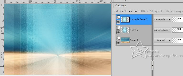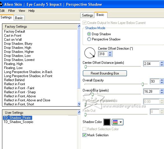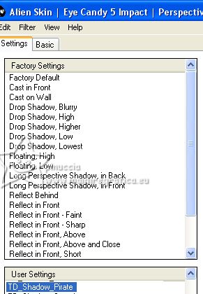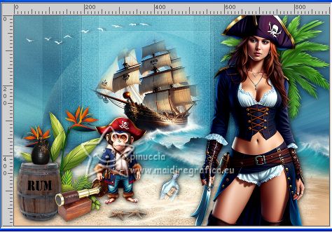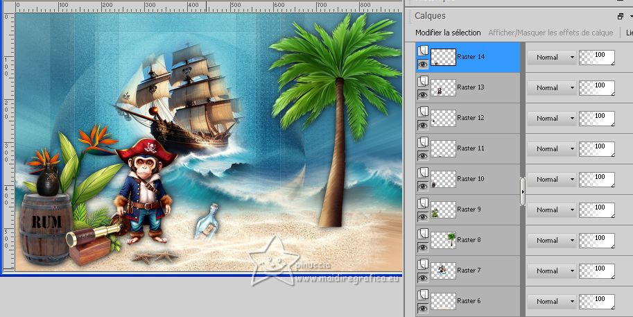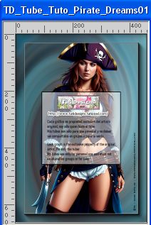 Ce tutoriel a été créé avec PSPX12 et traduit avec PSPX7 mais il peut également être exécuté avec les autres versions. Suivant la version utilisée, vous pouvez obtenir des résultats différents. Depuis la version X4, la fonction Image>Miroir a été remplacée par Image>Renverser horizontalement, et Image>Renverser avec Image>Renverser verticalement . Dans les versions X5 et X6, les fonctions ont été améliorées par la mise à disposition du menu Objets. Avec la nouvelle version X7, nous avons encore Image>Miroir et Image>Renverser/Retourner, mais avec nouvelles différences. Voir les détails à ce sujet ici Certaines dénominations ont changées entre les versions de PSP. Les plus frequentes dénominations utilisées: ![]() Vos versions ici![]() Nécessaire pour réaliser ce tutoriel: ![]() Le scrap Pirate dreams de Tati ![]() (ici les liens vers les sites des créateurs de tubes) Modules Externes: consulter, si nécessaire, ma section des filtres ici Filters Unlimited 2.0 ici &<Bkg Kaleidoscope> - Flip SideLsf (à importer dans Unlimited) ici VanDerLee - Unplugged-X ici Mura's Meister - Cloud ici AAA Filters - AAA Framer ici Alien Skin Eye Candy 5 Impact - Perspective Shadow ici ![]() en fonction des couleurs utilisées, vous pouvez changer le mode mélange et l'opacité des calques. Placer le preset En cliquant sur le preset une ou deux fois (selon vos réglages) automatiquement il se placera directement dans le dossier Settings de Alien Skin Eye Candy. pourquoi un ou deux clic voir ici Couleurs utilisées ![]() 1. Placer en avant plan la couleur #1b5a79, et en arrière plan la couleur #b6e8e7 ![]() 2. Ouvrir une nouvelle image transparente 900 x 600 pixels. 3. Sélections>Sélectionner tout. Du dossier scrap, ouvrir TD_Pirate_Dreams_Paper02" ![]() Édition>Copier. Revenir sur votre travail et Édition>Coller dans la sélection. Sélections>Désélectionner tout. 4. Activer l'outil Sélection ![]() (peu importe le type de sélection, parce que avec la sélection personnalisée vous obtenez toujours un rectangle), cliquer sur Sélection personnalisée ![]() et setter ces paramétres. ![]() 5. Effets>Modules Externes>Filters Unlimited 2.0 - Color Filters - Sepia, par défaut. ![]() Sélections>Désélectionner tout. 6. Sélection personnalisée ![]() ![]() 7. Effets>Modules Externes>Mura's Meister - Cloud, par défaut. ![]() n'oubliez pas que ce filtre travaille avec les couleurs de votre palette des materiaux, mais il garde en mémoire le premier réglage depuis l'ouverture de Psp. Donc, si vous avez déjà utilisé le filtre, pour vous assurer d'avoir les bonnes couleurs, cliquer sur Reset. Le résultat de l'effet est aléatoire, il ne sera donc pas le même que le mien. Sélections>Désélectionner tout. 8. Réglage>Flou>Flou radial. ![]() Effets>Effets de bords>Accentuer davantage. 9. Calques>Nouveau calque raster. Sélections>Sélectionner tout. 10. Du dossier scrap, ouvrir TD_Pirate_Dreams_Paper11 ![]() Édition>Copier. Revenir sur votre travail et Édition>Coller dans la sélection. Sélections>Désélectionner tout. 11. Effets>Effets d'image>Mosaïque sans jointures, par défaut ![]() 12. Effets>Modules Externes>AAA Filters - AAA Framer. ![]() 13. Image>Redimensionner, à 80%, redimensionner tous les calques décoché. Image>Rotation libre - 90 degrés à gauche. ![]() 14. Effets>Modules Externes>VanDerLee - Unplugged-X - Defocus ![]() Effets>Effets de bords>Accentuer. 15. Touche K pour activer l'outil Sélecteur ![]() et Placer Position horiz.: 80,00 et Position vert.: -60,00. ![]() Touche M pour désélectionner l'outil. 16. Placer le calque en mode Lumière douce. 17. Calques>Dupliquer. Vous positionner sur le calque de dessous, Raster 2. 18. Effets>Effets de textures>Mosaïque de Verre ![]() 19. Vous positionner sur le calque du haut de la pile, Copie de Raster 2. ![]() 20. Du dossier scrap, ouvrir TD_Pirate_Dreams_Element_37 ![]() Édition>Copier. Revenir sur votre travail et Édition>Coller comme nouveau calque. 21. Touche K pour activer l'outil Sélecteur ![]() et placer position horiz.: -27,00 et Position vert.: 409,00. ![]() Touche M pour désélectionner l'outil. 22. Effets>Modules Externes>Filters Unlimited 2.0 - &<Bkg Kaleidoscope> - Flip SideLsf. ![]() 23. Du dossier scrap, ouvrir TD_Pirate_Dreams_Element_38 ![]() Effacer le watermark et Édition>Copier. Revenir sur votre travail et Édition>Coller comme nouveau calque. Image>Miroir. Image>Redimensionner, à 150%, redimensionner tous les calques décoché. 24. Effets>Effets d'image>Mosaïque sans jointures. ![]() 25. Touche K pour activer l'outil Sélecteur ![]() y modifica las garder position horiz.: 0,00 et placer Position vert.: 307,00. ![]() 26. Du dossier scrap, ouvrir TD_Pirate_Dreams_Element_36 ![]() Édition>Copier. Revenir sur votre travail et Édition>Coller comme nouveau calque. Image>Redimensionner, 2 fois à 50%%, redimensionner tous les calques décoché. 27. Image>Rotation libre - 20 pixels à droite. ![]() 28. Touche K pour activer l'outil Sélecteur ![]() y modifica las et placer position oriz.: 413,00 et Position vert.: 441,00. ![]() Touche M pour désélectionner l'outil. Réglage>Netteté>Netteté. 29. Effets>Modules Externes>Alien Skin Eye Candy 5 Impact - Perspective Shadow. sélectionner le preset TD_Shadow_Pirate Ci-dessous les réglages en cas de problèmes avec le preset. ![]() 30. Du dossier Scrap, ouvrir à nouveau l'image TD_Pirate_Dreams_Element_37 ![]() Édition>Copier. Revenir sur votre travail et Édition>Coller comme nouveau calque. 31. Touche K pour activer l'outil Sélecteur ![]() et placer Position horiz.: 192,00 et Position vert.: 497,00. ![]() ![]() 32. Ouvrir le tube TD_Tube_PirateShip_Tuto_PirateDreams ![]() Édition>Copier. Revenir sur votre travail et Édition>Coller comme nouveau calque. Image>Miroir. Image>Redimensionner, à 80%, redimensionner tous les calques décoché. Réglage>Netteté>Netteté. 39. Touche K pour activer l'outil Sélecteur ![]() et place